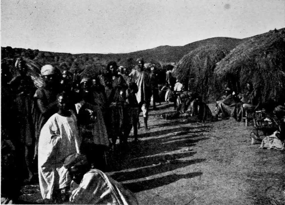 North of the watershed the principal crops are guinea-corn, millet, ground-nuts, cassava, and sweet potatoes; cotton and tobacco are also cultivated by the Chamba pagans, Zumperis and Munchis. The corn is planted in April at the end of the rainy season, the method of cultivation being as follows. The ground is first cleared of weeds and the remains of the last year’s crop. It is then prepared for sowing by digging shallow trenches with a rough kind of hoe, the earth being piled up to form ridges between the trenches. Guinea-corn (Sorghum vulgare), the{22} staple food of the country, is planted in these ridges. It grows to a great height, often fifteen to twenty feet, and is harvested in November. Millet is planted in the furrows; it ripens rapidly and is harvested in July. Cotton is ready for picking after December; tobacco and cassava are cultivated during the dry season on the hillsides, the streams being used for irrigation.