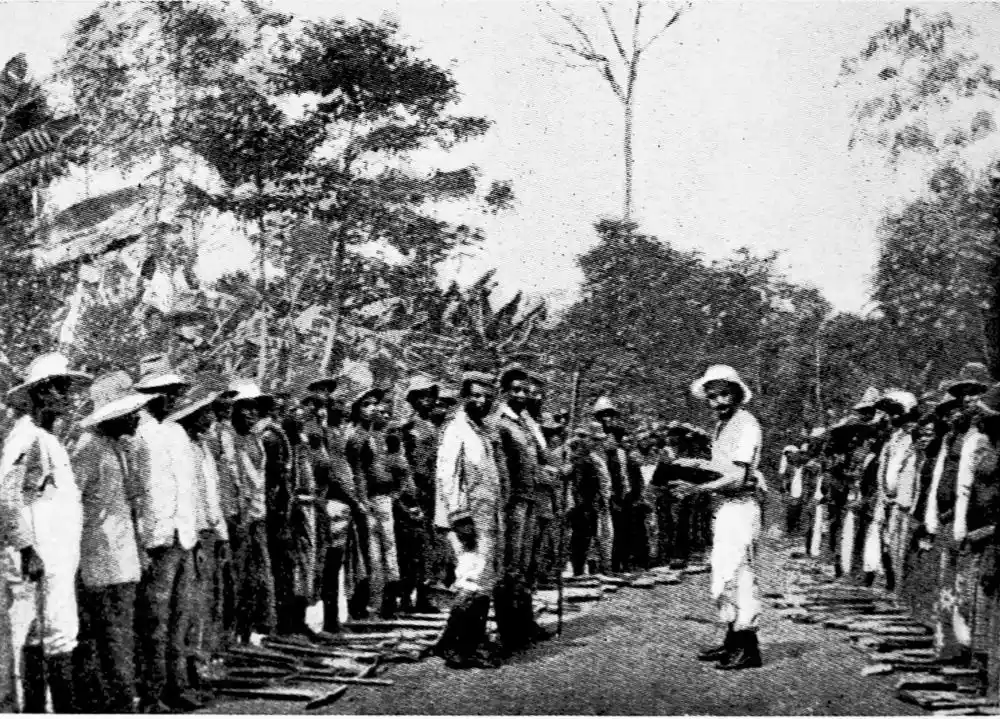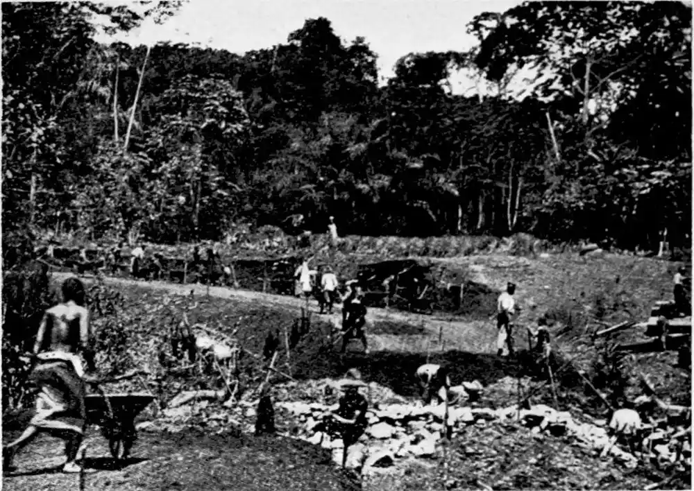 Having thus solidified their position, and secured themselves against what Passarge calls “the intrigues and provocations of the English,” the German administrators proceeded to Germanize their new province and systematically to develop its tropical resources. Although they established customs houses, courts of justice and post-offices, and constructed about 125 miles of a projected railway system of 285 miles, and, between 1898 and 1911, increased the total trade of the colony by nearly forty million marks, the colony did not prove a departmental or material success. The staffs of the Experimental Institute of Agriculture at Victoria and the Department of Agriculture at Buea, devoted their energies to the scientific raising of tropical economic plants,{xiv} to experiments in plantation culture, and to the training of young natives in the virtues of Teutonic industry and organisation, while, by Government Proclamation, all native children were compelled to attend the Government schools, acquire an intelligent knowledge of the language and history of Germany, and practice the art of singing German patriotic songs. Despite this paternal concern for the agricultural and educational well-being of the natives, the application of German methods proved a disappointment. The children at the end of their school course considered themselves too superior to undertake manual labour, while the men, resenting the German indifference to their national feeling and inherited methods of work, developed the spirit of native unrest. A lack of sympathetic understanding of the natives was attended by culpably injudicious treatment of them by the German officials, and the relations between the authorities and the aborigines led to the frequent employment of the Imperial troops, while the inadequacy of means of internal communication rendered the progress of “one of the most productive countries in the world” both slow and difficult.