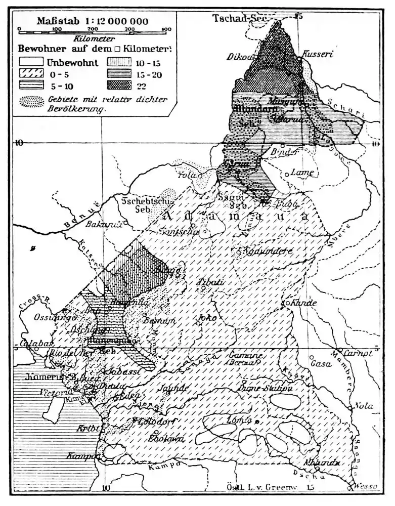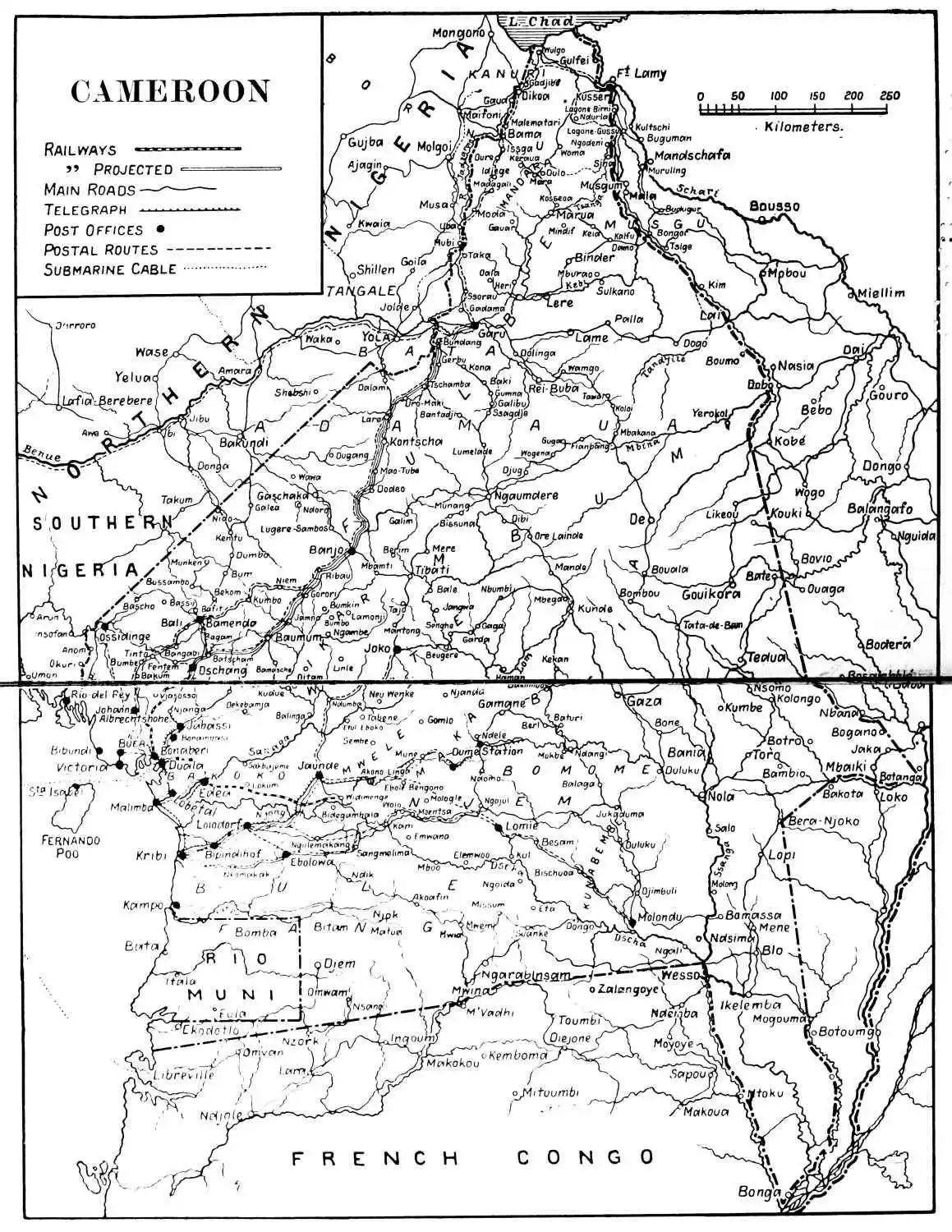 After many fruitless endeavours to explore this coastal region, an expedition in 1888 succeeded in crossing from Batanga by way of Njong and Sanaga, and in settling the boundary between Bantio and Sudannegern. The effort to reach the Cameroon estuary was frustrated by the opposition of the Bakoko; and after a journey of much difficulty the expedition returned to the coast. In 1899 a station was established and a foothold secured. In the same year the region north of Duala was explored, and the forest district traversed, the plateau of Baliland was ascended, and the grassy lands reached. With indescribable difficulty the districts from Ibi on the Benue to Yola were traversed. In 1902-4 an Anglo-German expedition, after a very minute survey, fixed the boundary line between Yola and Lake Chad, and in 1908 an agreement was made between Germany{7} and France regarding the south and east boundaries. In 1907-8 the frontier between Cameroon and the Nigerias was surveyed by the British and German representatives, and the approximate line of demarcation subsequently settled between the two Governments was fixed and marked by an Anglo-German commission in 1912-13.