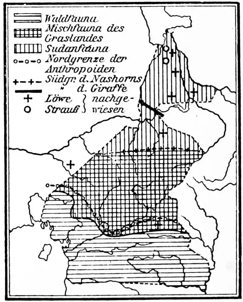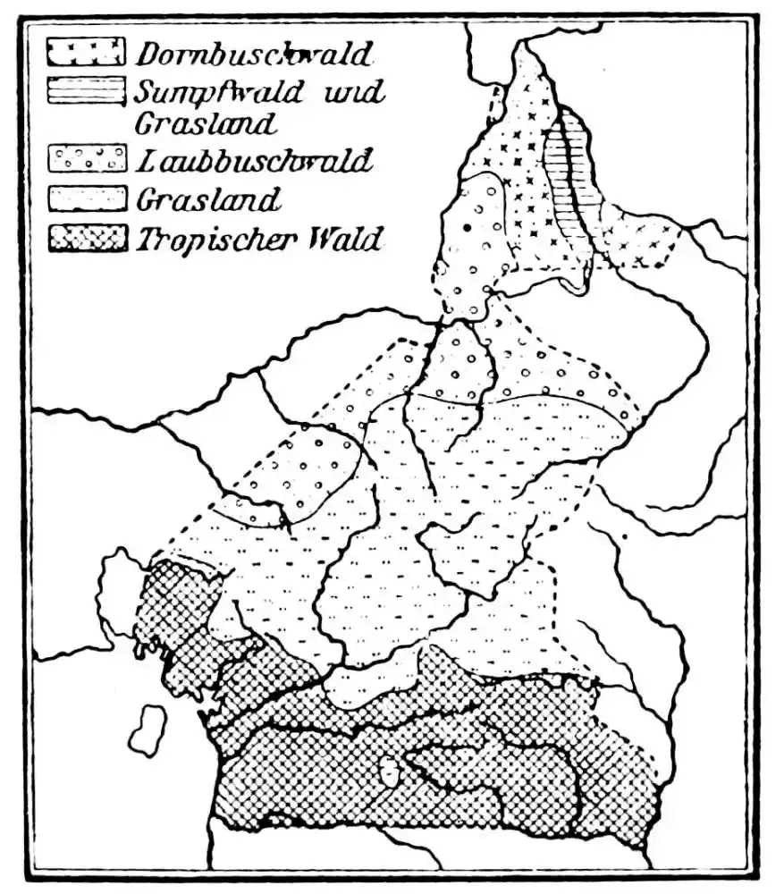 The greater part of the colony is covered with red, loamy, sandy weatherings, which are characteristic of the tropics. If this red earth contains hard concretions of brown iron ore, they are named “Laterit.” These cellular-like volcanic scoria are characteristic of the surface of the soil generally, and especially in{12} those districts where the loamy deposits have been washed away by heavy rains. Vegetable soil is more abundant in the rainy regions of the south, and also in the lowlands. Indeed the result of this humid weathering is a kind of whitish yellowy kaolin, or china clay, which is found in the south plateau. A blackish mould to a thickness of one or two feet covers the lowland south of Lake Chad, and is there called “Firki.” Whilst in the south of the colony red and yellow clayey soil preponderates, the further north one goes to the dryer regions, reddish sand, a product of the physical weathering, is to be found.