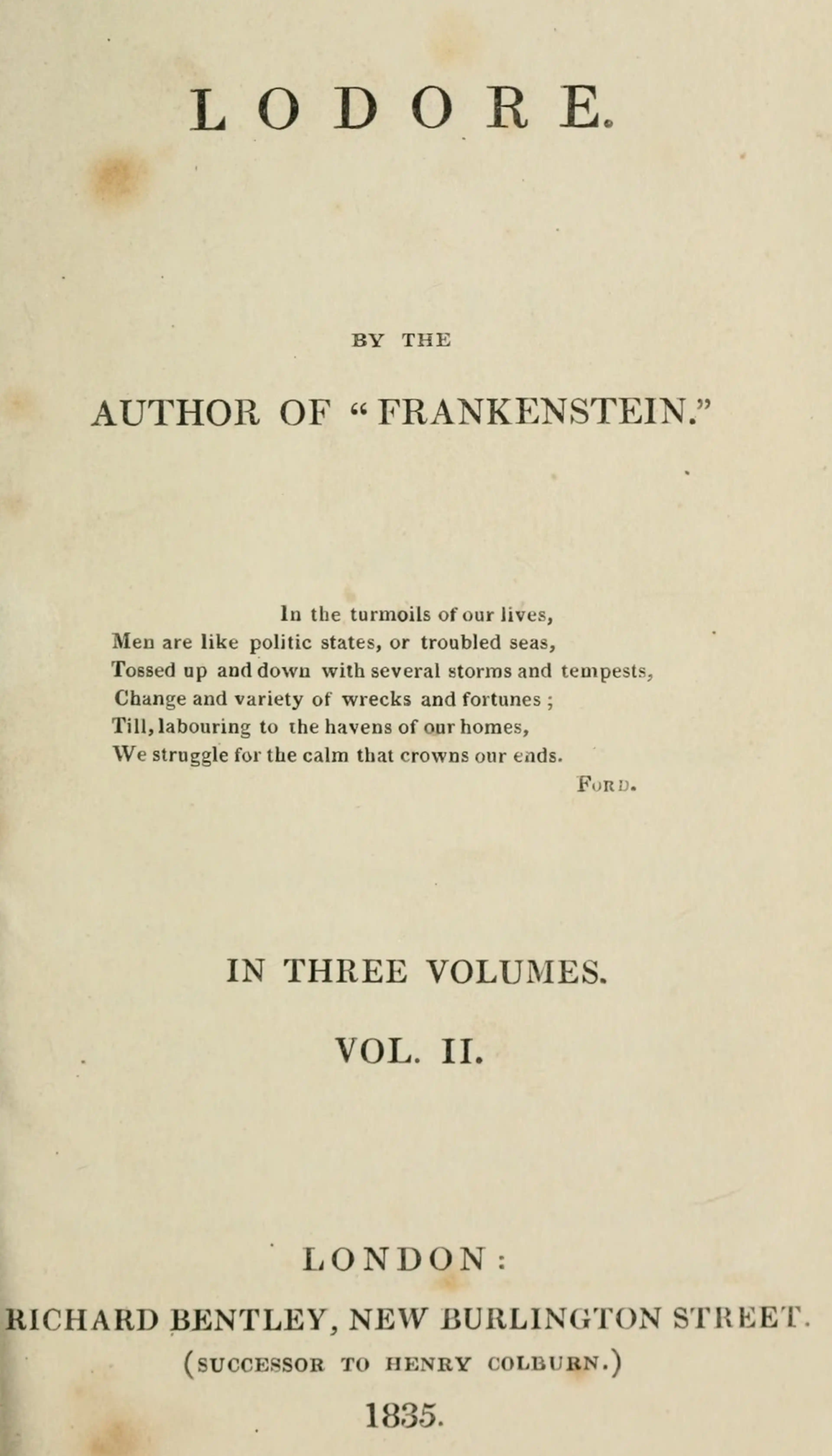 Horatio Saville was nine-and-twenty when he first met Lady Lodore, who was nearly the same age. He had begun to feel that his health was shaken, and he tried to forget for a time his devouring avocations. He changed the scene, and went on a visit to a friend, who had a country house not far from Hastings. Lady Lodore was expected as a guest, together with her mother. She was much talked of, having become an object of interest or curiosity to the many. A mystery hung over her fate; but her reputation was cloudless, and she was warmly supported by the leaders of fashion. Saville heard of her beauty and her sufferings; the injustice with which she had been treated—of her magnanimity and desolate condition; he heard of her talents, her powers of conversation, her fashion. He figured to himself (as we are apt to incarnate to our imagination the various qualities of a human being, of whom we hear much) a woman, brilliant, but rather masculine, majestic in figure, with wild dark eyes, and a very determined manner. Lady Lodore came: she entered the room where he was sitting, and the fabric of his fancy was at once destroyed. He saw a sweet-looking woman; serene, fair, and with a countenance expressive of contented happiness. He found that her manners were winning, from their softness; her conversation was delightful, from its total want of pretension or impertinence.