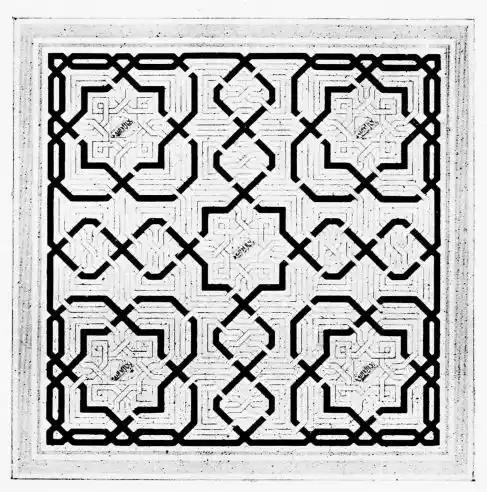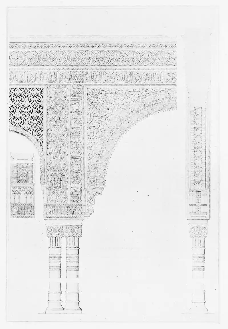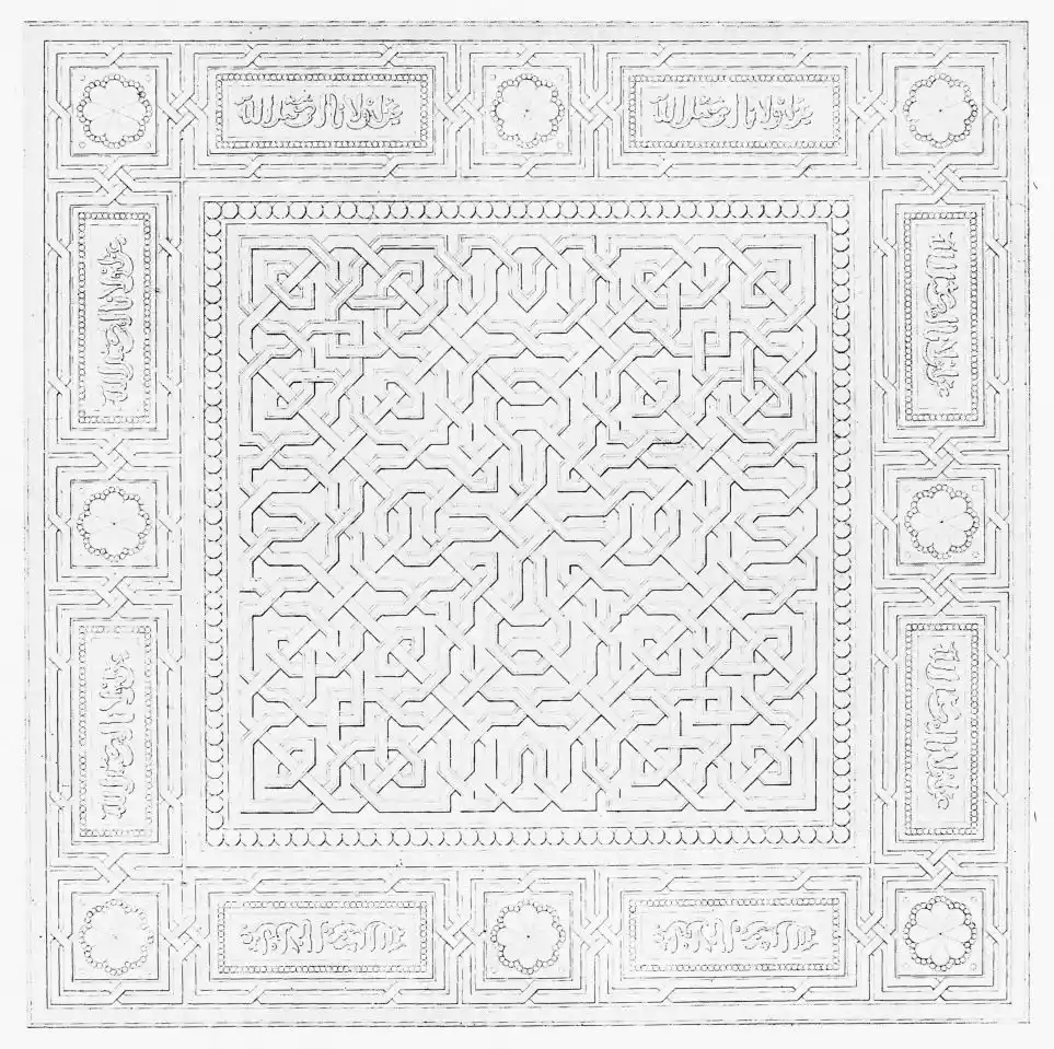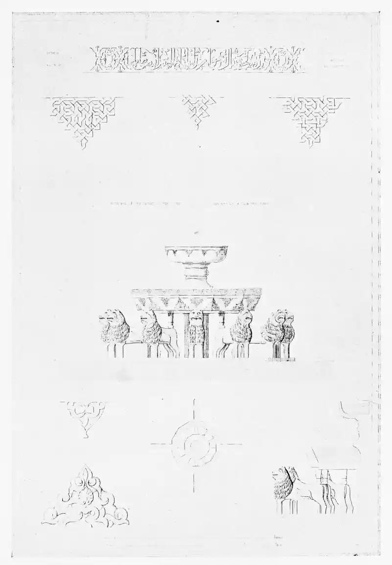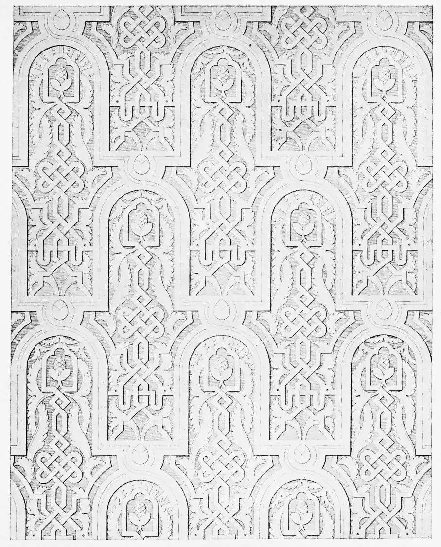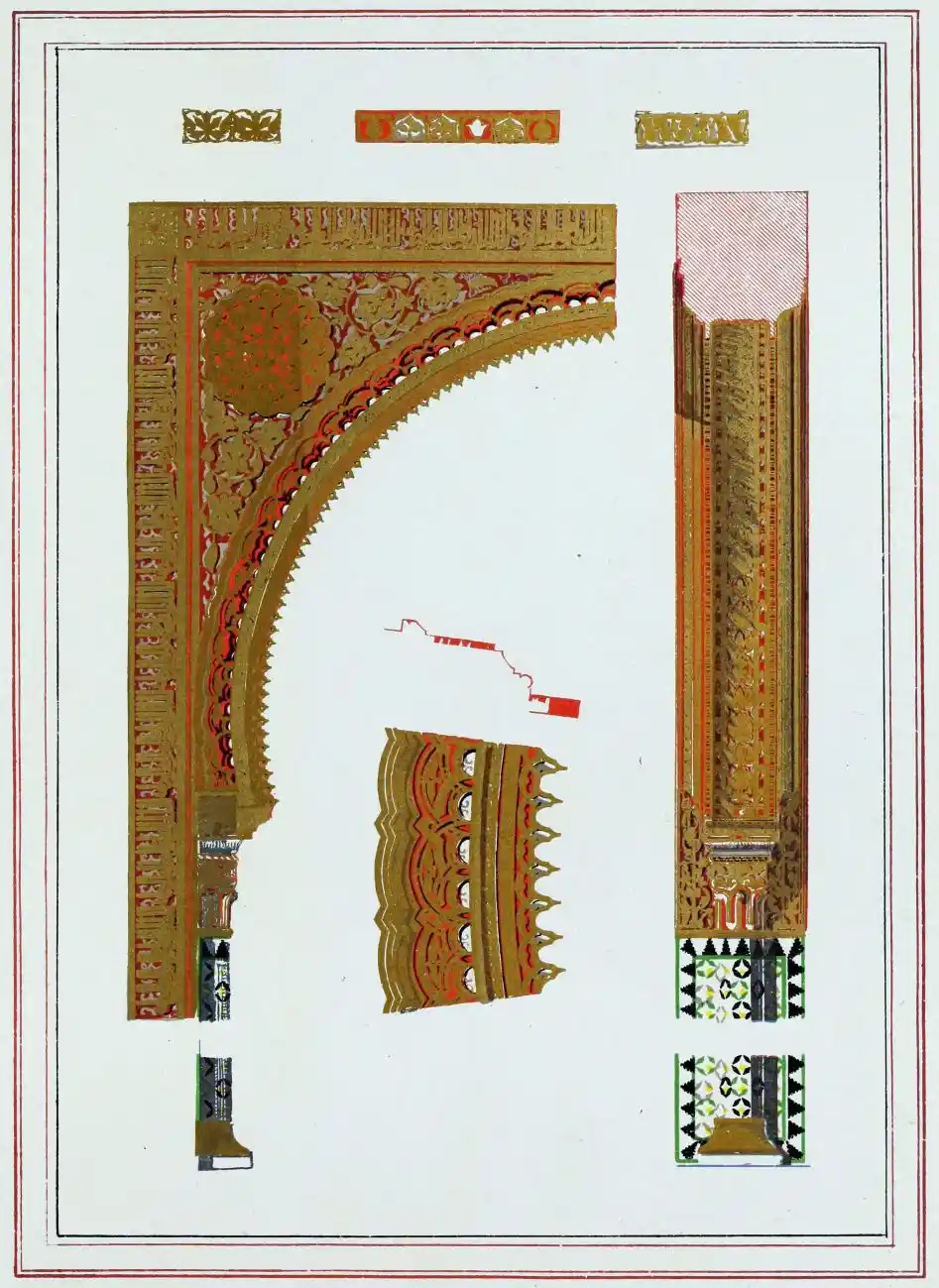[9] Edited by Pablo Lozano. The antiquities and history of the Moorish domination in Spain remained unheeded until representations were made that research and accurate delineation would alone make their monuments intelligible. The Royal Academy of St. Ferdinand was commissioned to make drawings of the Palace of the Alhambra and of the Mosque of Córdova. The result of their labours were published at Madrid, in 1780, in a folio volume entitled as above, with sixteen plates of Arabic designs, accompanied by a few pages of letterpress. It is an exceedingly rare volume.