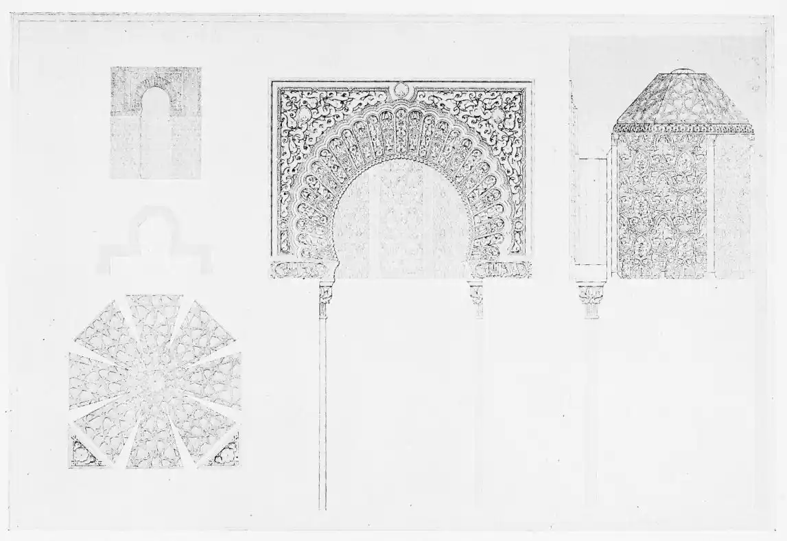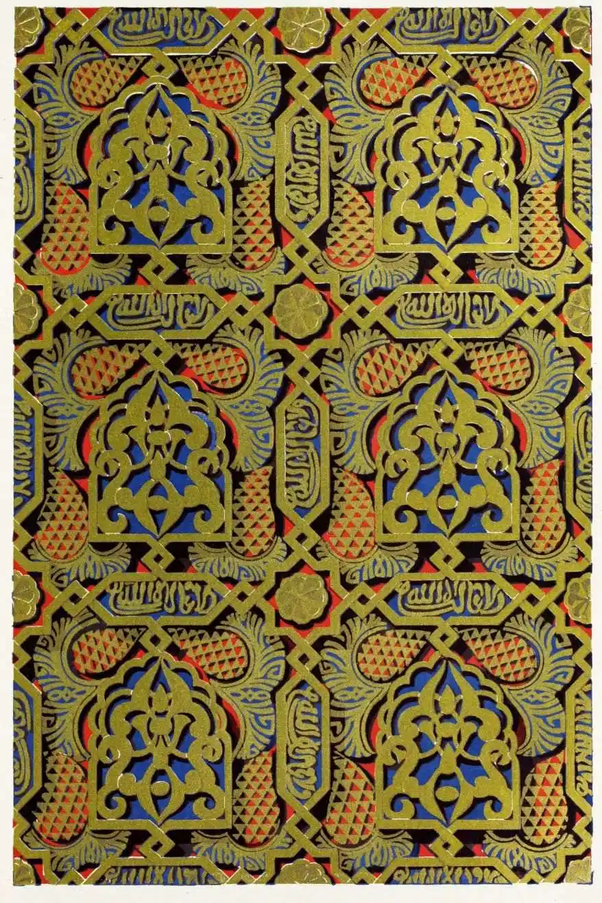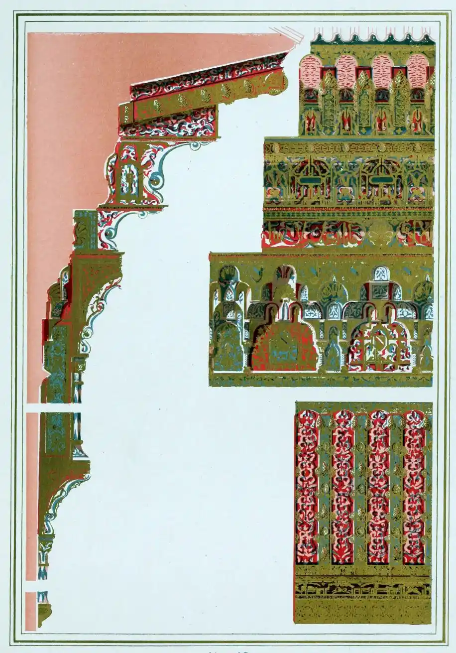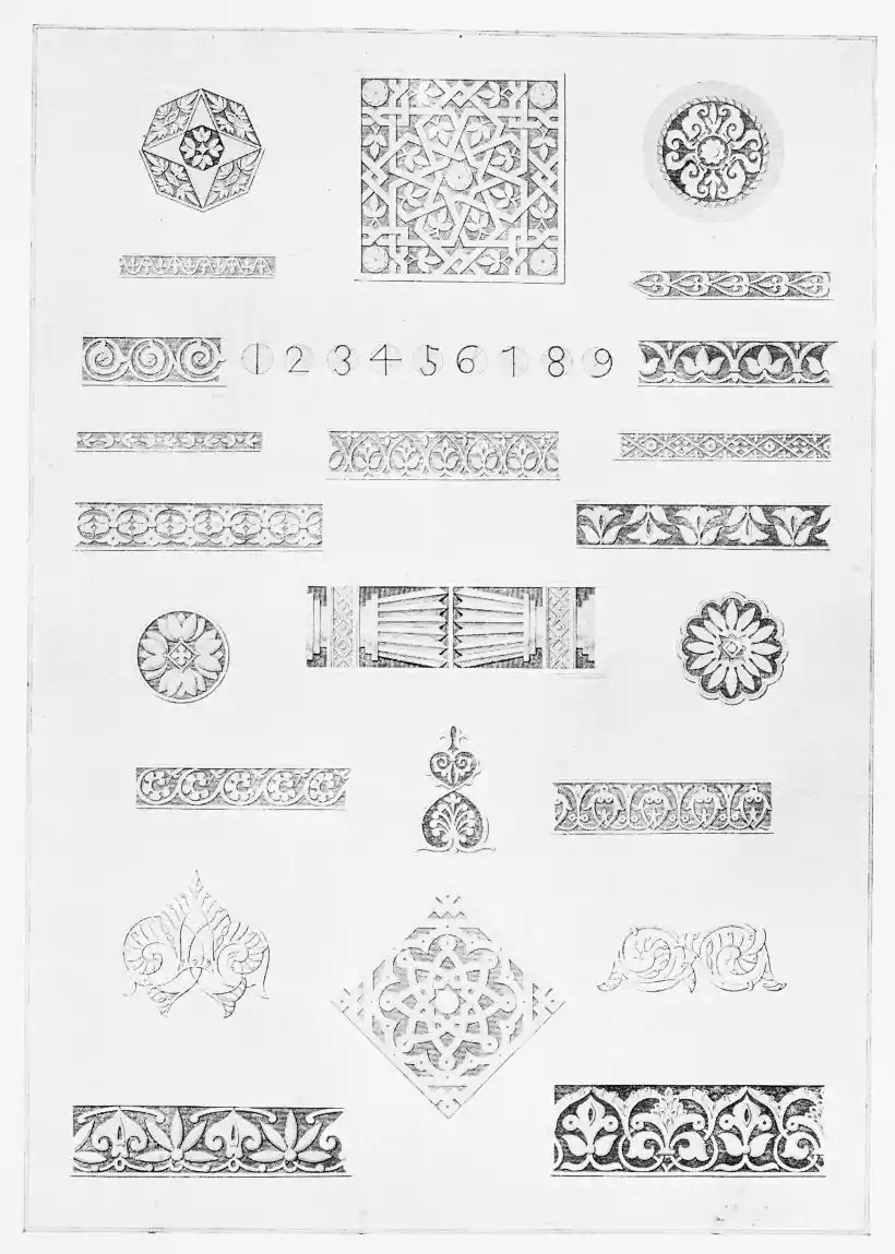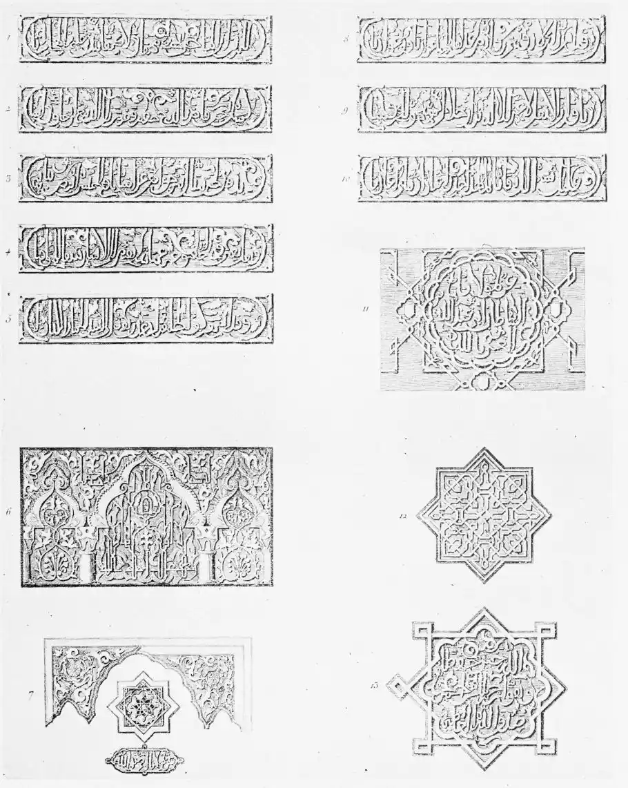 [9] Edited by Pablo Lozano. The antiquities and history of the Moorish domination in Spain remained unheeded until representations were made that research and accurate delineation would alone make their monuments intelligible. The Royal Academy of St. Ferdinand was commissioned to make drawings of the Palace of the Alhambra and of the Mosque of Córdova. The result of their labours were published at Madrid, in 1780, in a folio volume entitled as above, with sixteen plates of Arabic designs, accompanied by a few pages of letterpress. It is an exceedingly rare volume.