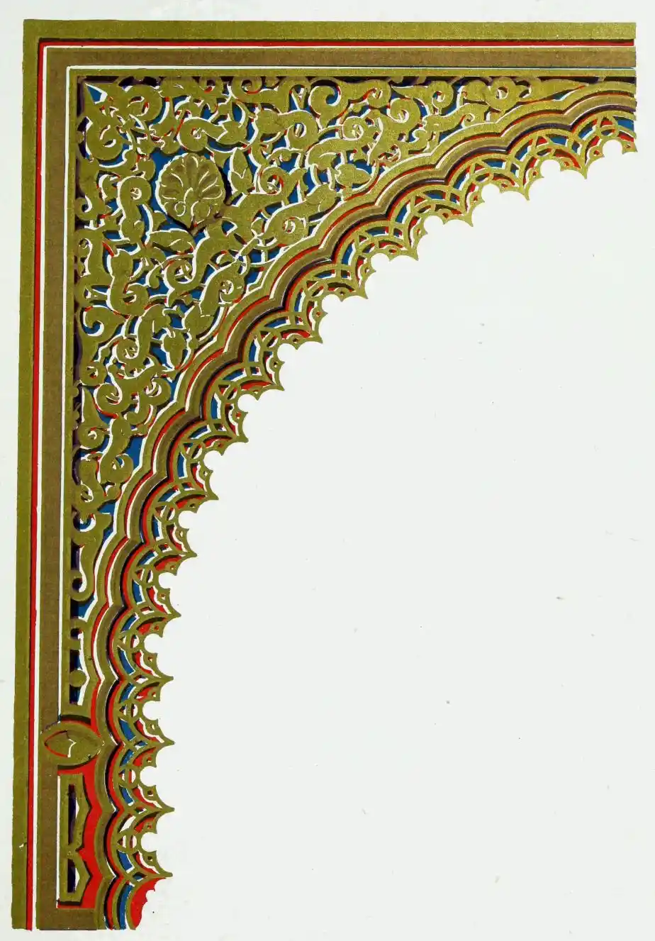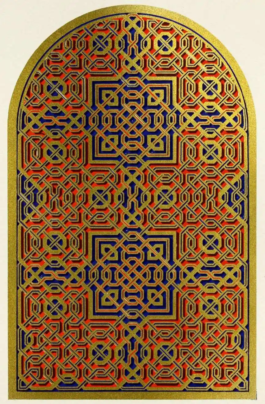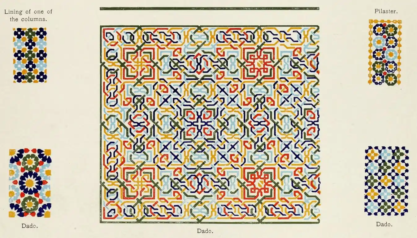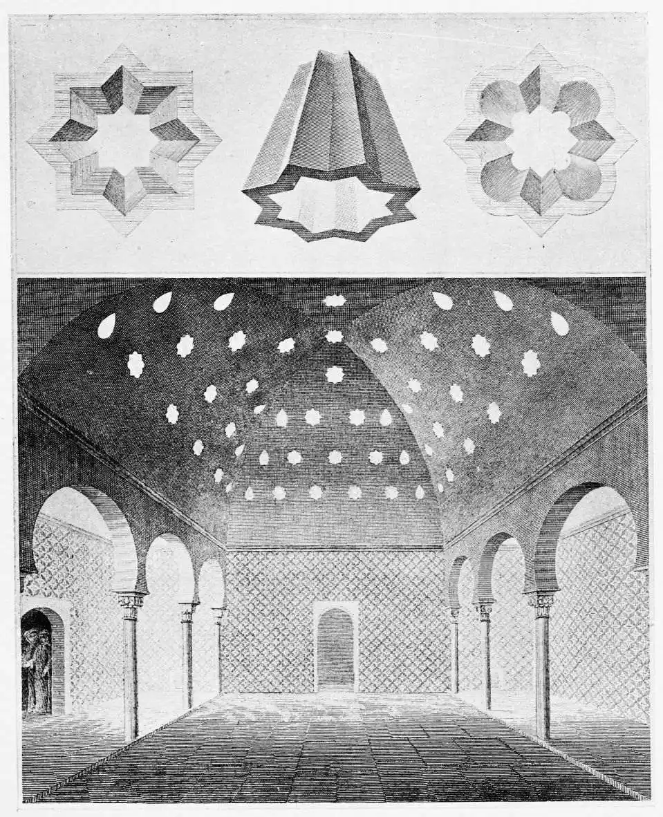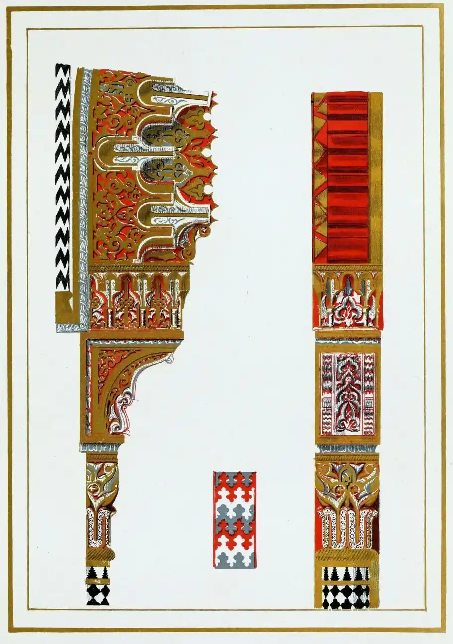 [9] Edited by Pablo Lozano. The antiquities and history of the Moorish domination in Spain remained unheeded until representations were made that research and accurate delineation would alone make their monuments intelligible. The Royal Academy of St. Ferdinand was commissioned to make drawings of the Palace of the Alhambra and of the Mosque of Córdova. The result of their labours were published at Madrid, in 1780, in a folio volume entitled as above, with sixteen plates of Arabic designs, accompanied by a few pages of letterpress. It is an exceedingly rare volume.