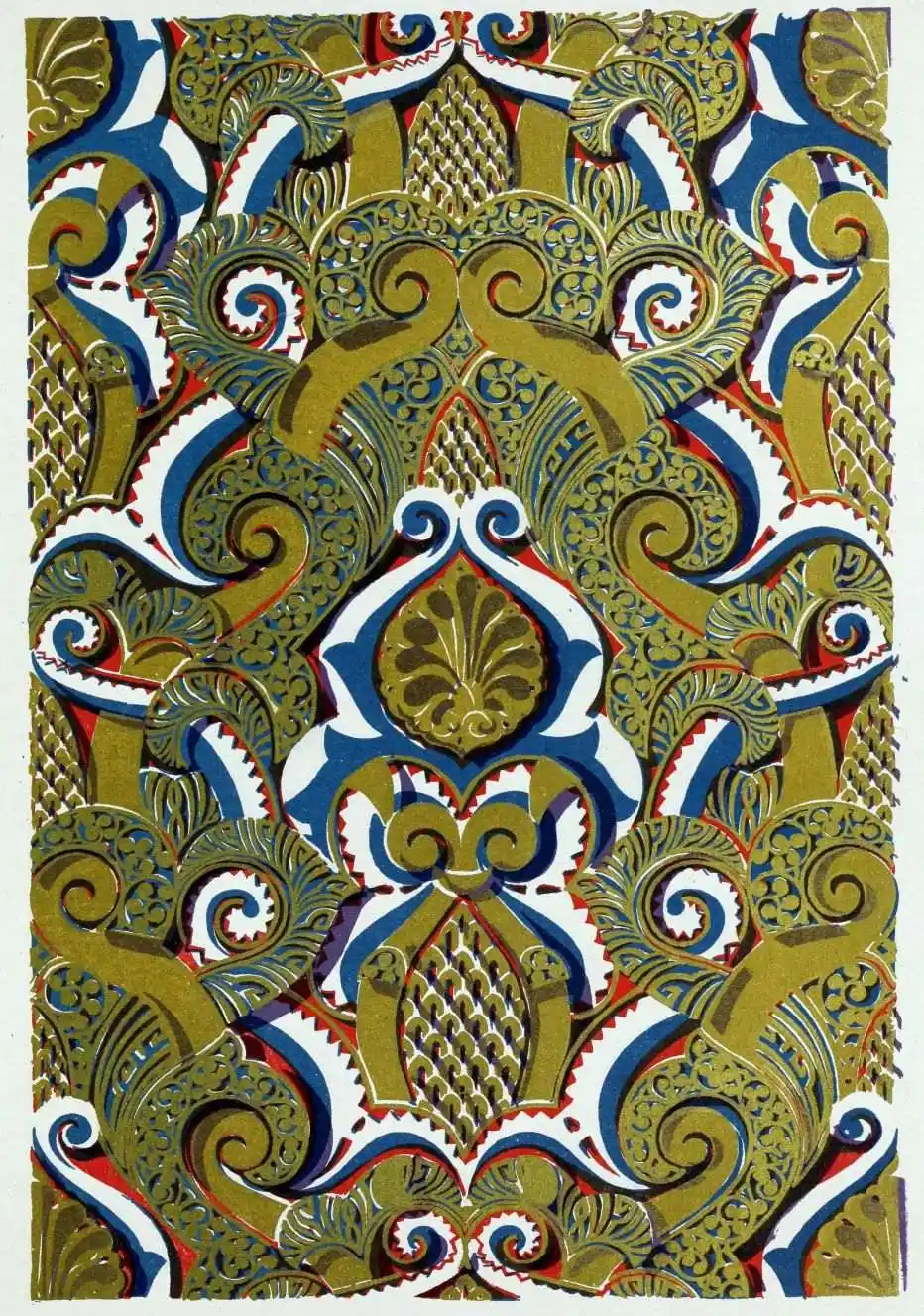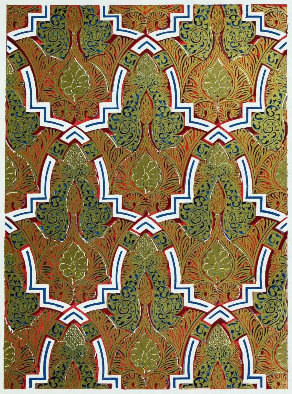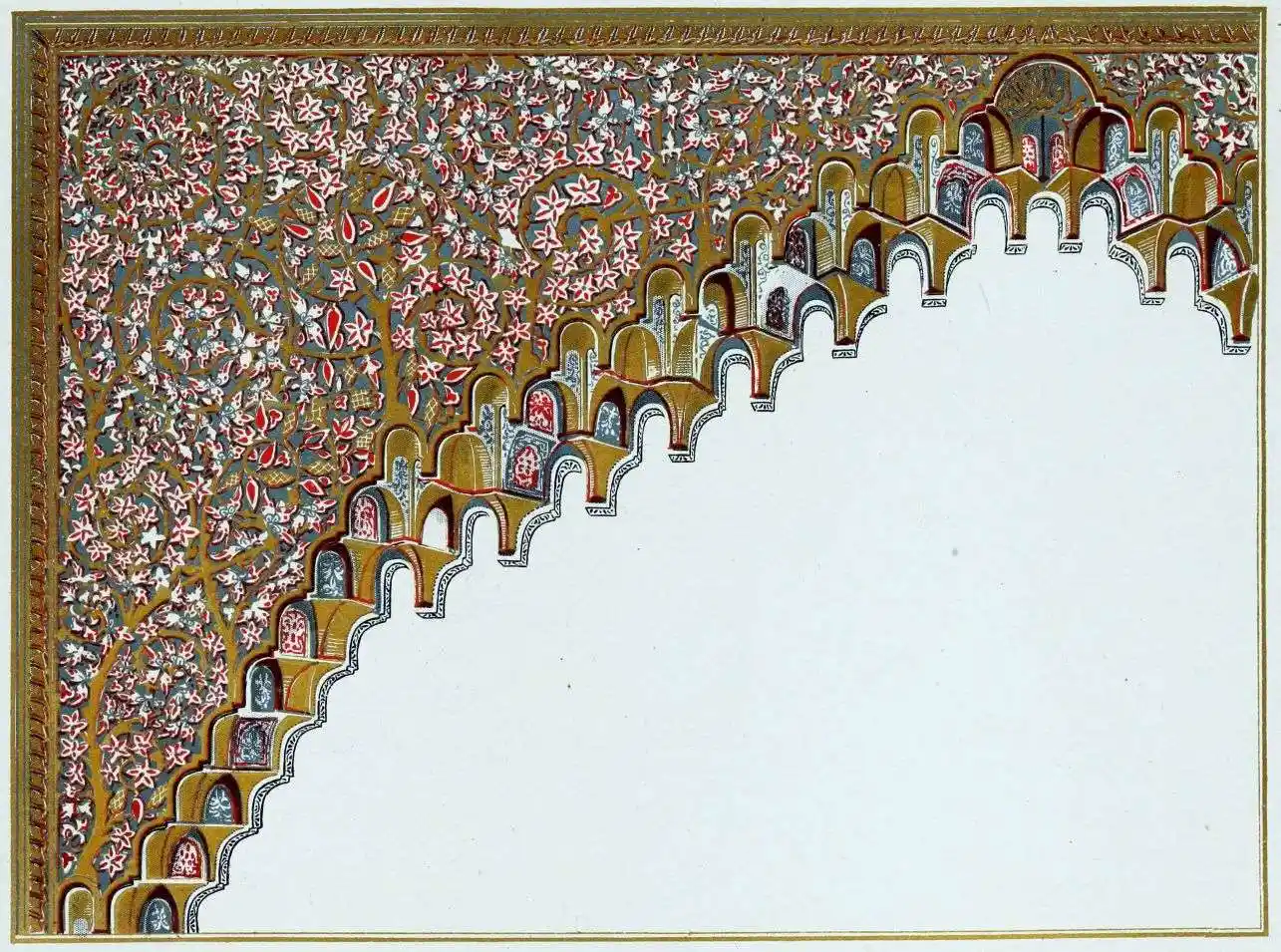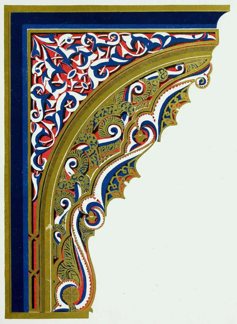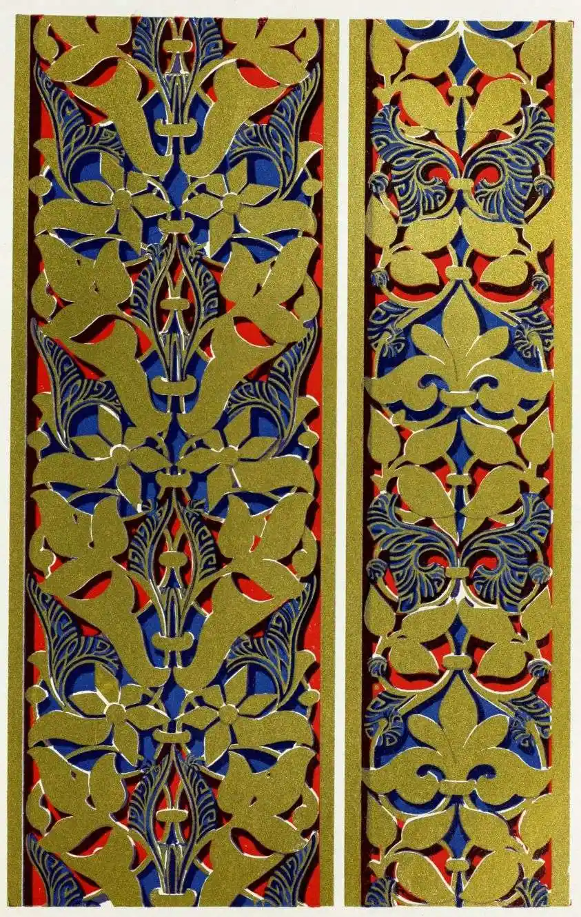 [9] Edited by Pablo Lozano. The antiquities and history of the Moorish domination in Spain remained unheeded until representations were made that research and accurate delineation would alone make their monuments intelligible. The Royal Academy of St. Ferdinand was commissioned to make drawings of the Palace of the Alhambra and of the Mosque of Córdova. The result of their labours were published at Madrid, in 1780, in a folio volume entitled as above, with sixteen plates of Arabic designs, accompanied by a few pages of letterpress. It is an exceedingly rare volume.