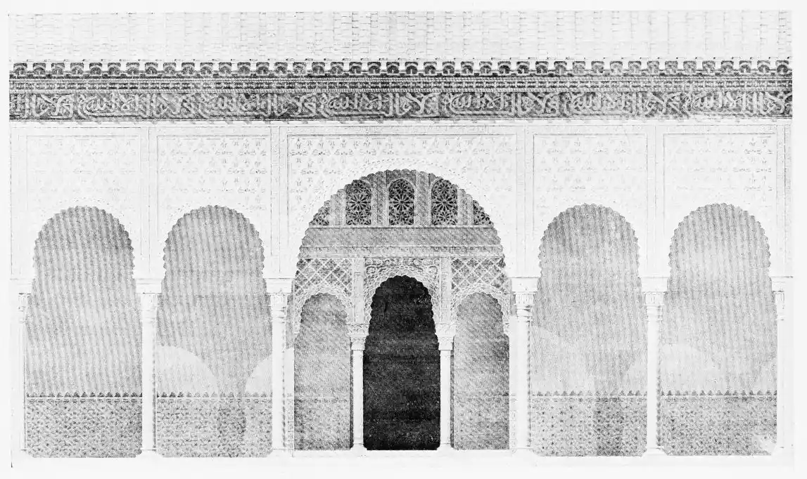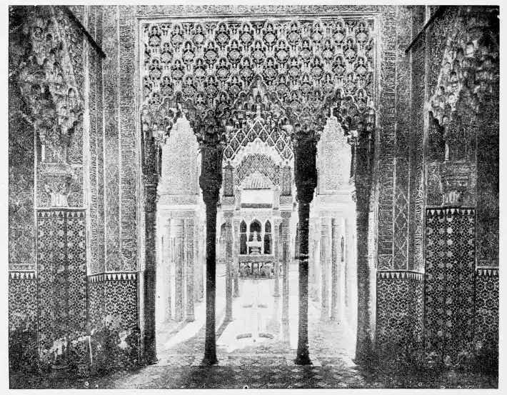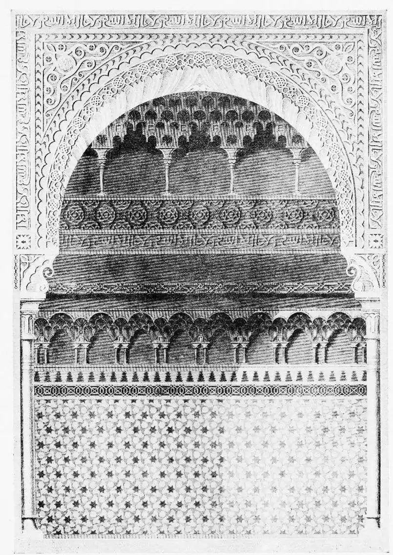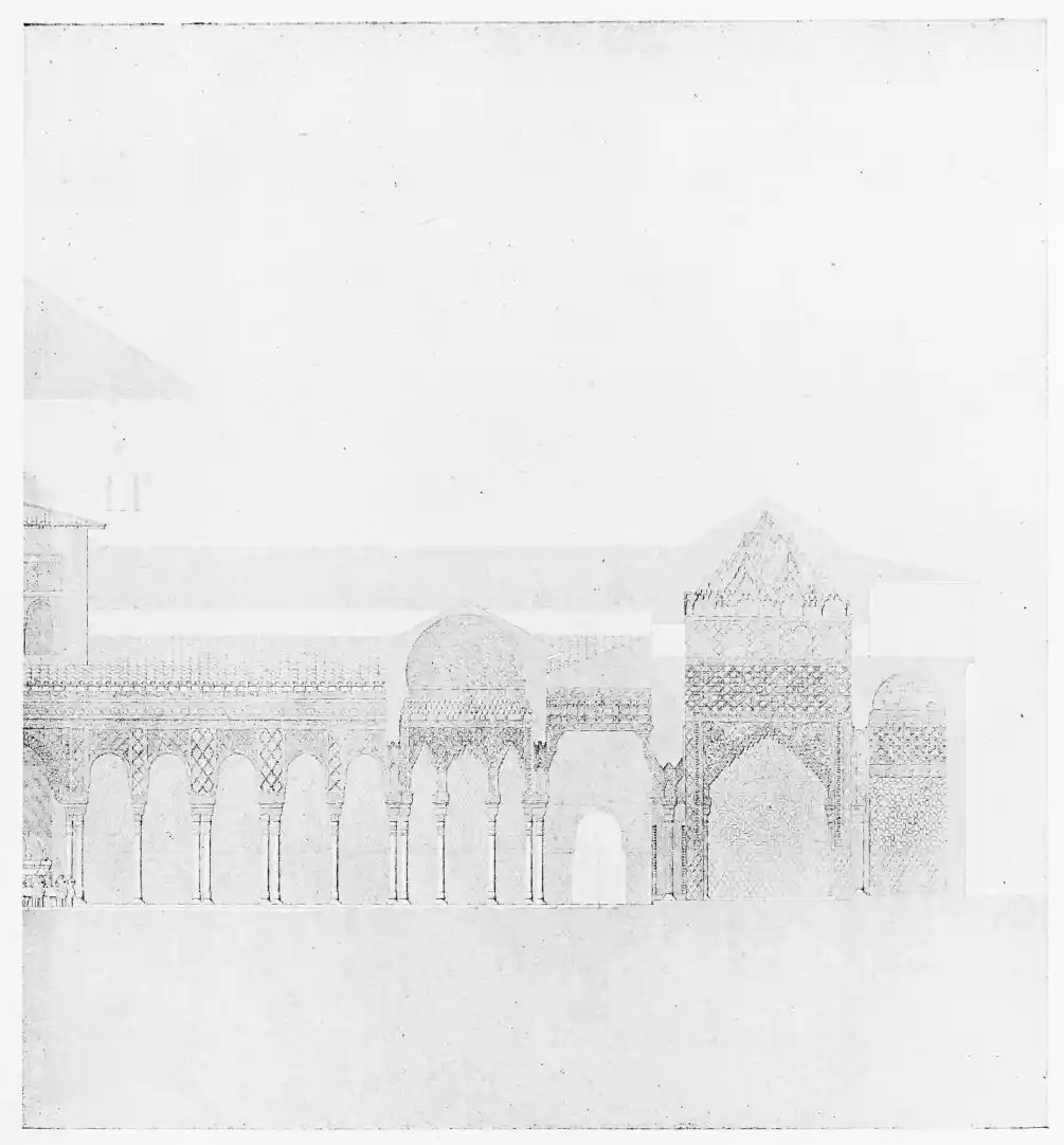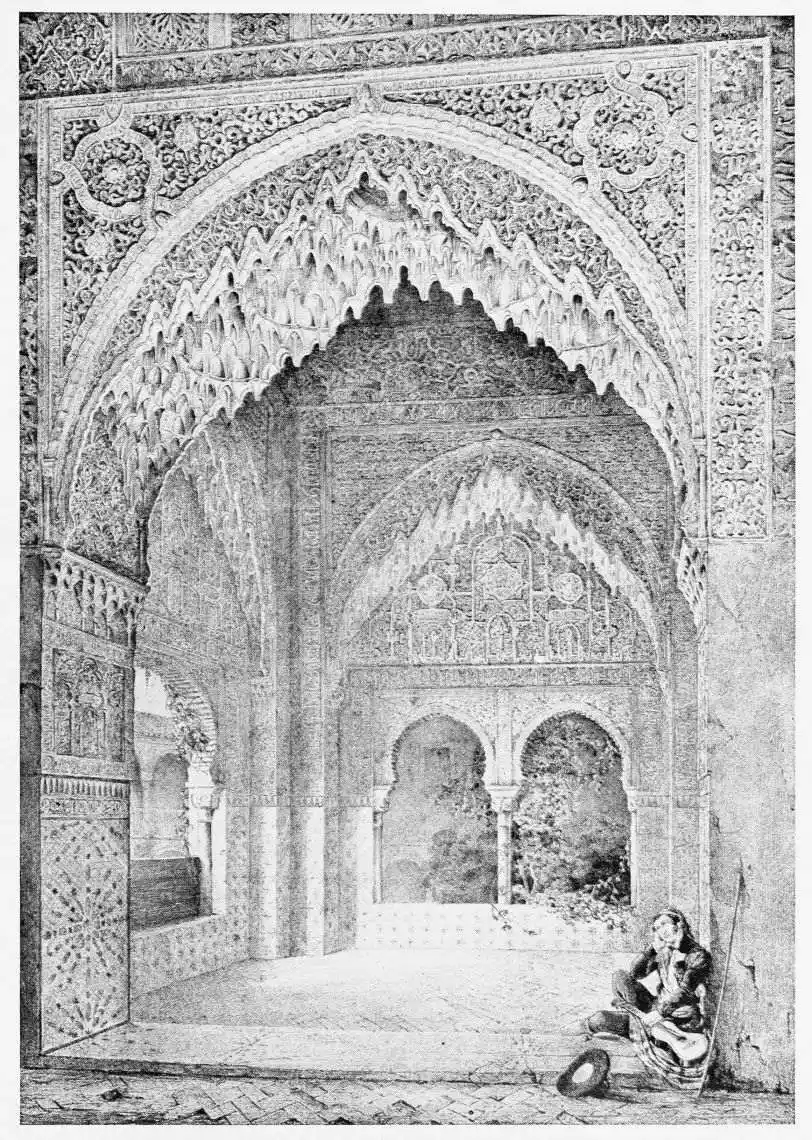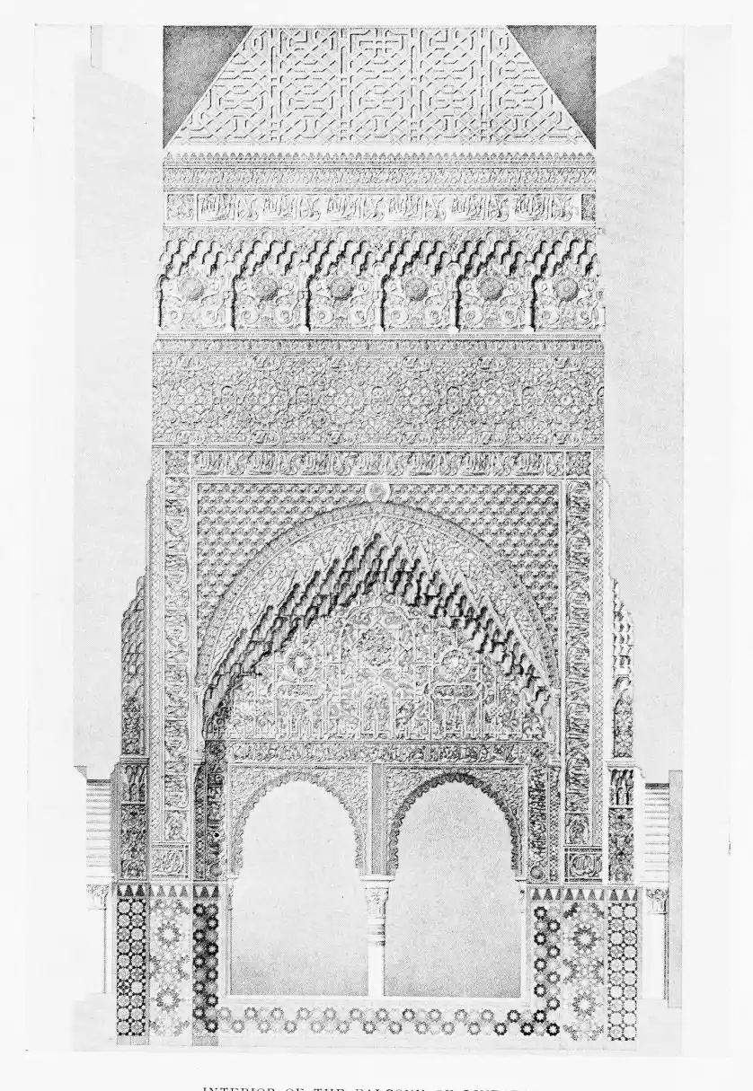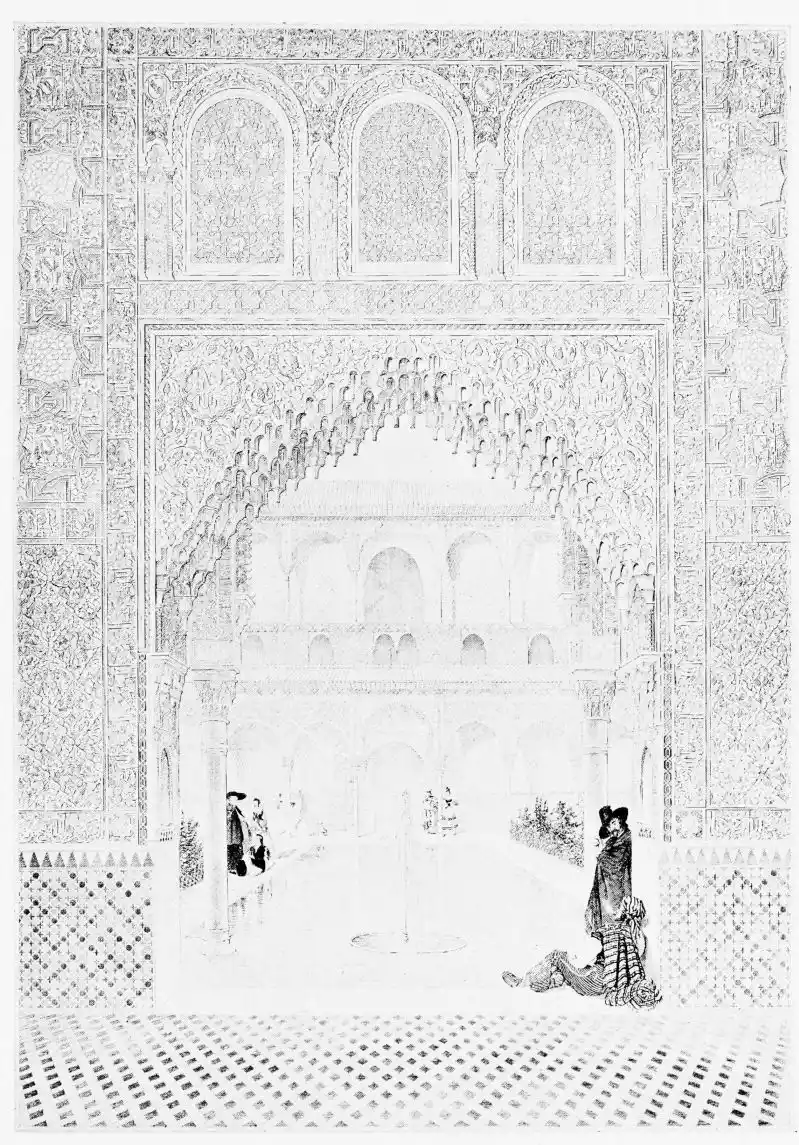Don Mariano Contreras, Conservator of the Alhambra, the son of the gifted Raphaël Contreras, who devoted thirty-seven years of his life to the restoration of the Palace—gave me the benefit of his knowledge of this unique treasure-house of art; and I have also laid under contribution the beautiful plates of Owen Jones, who disposed of a Welsh inheritance in order to produce his great work on the Plans, Elevations, Sections and Details of the Alhambra. Jones’s Grammar of Ornament, which has been described as “beautiful enough to be the horn-book of the Angels,” also contains the result of his researches in the Alhambra, which occupied him for the greater part of eleven years. A selection of these illustrations is here rescued from the obscurity of public libraries and the inaccessible recesses of private collections. The inclusion of John F. Lewis’s drawings, and the reproduction of a series of pictures by James C. Murphy, who spent seven years in the study of the artistic marvels of the Alhambra, I do not feel called upon to defend. The photographs, several of which were placed at my disposal by Don Rafaël Garzón, represent the buildings as they appear to-day; the drawings were made before the Palace was damaged by the disastrous fire of September, 1890.{ix}