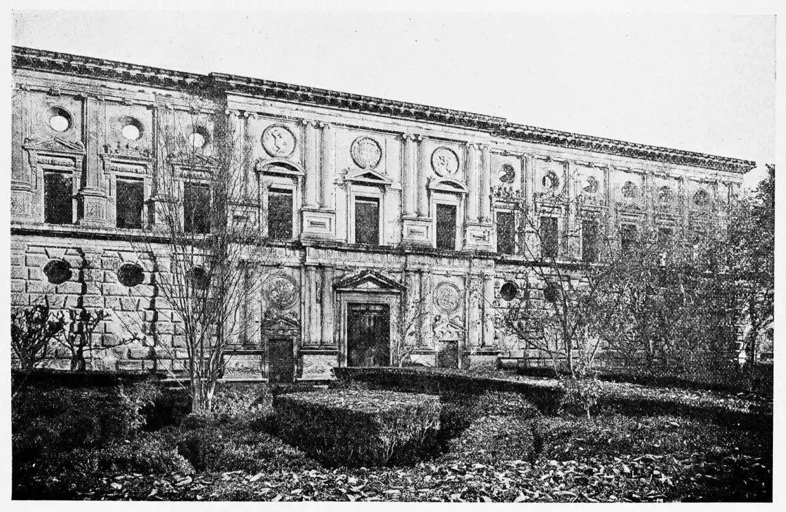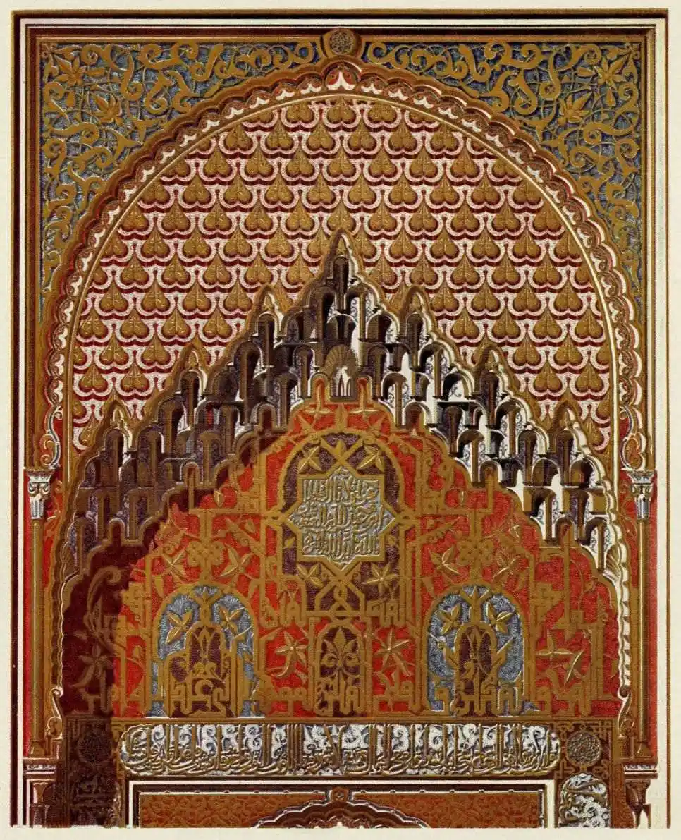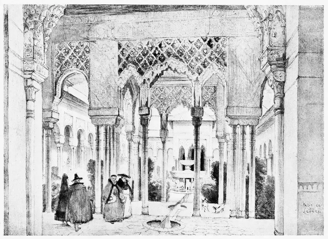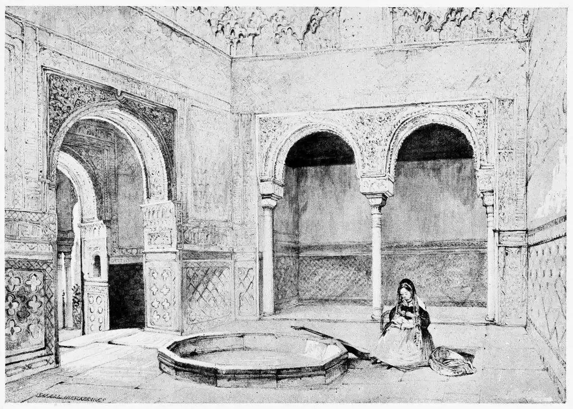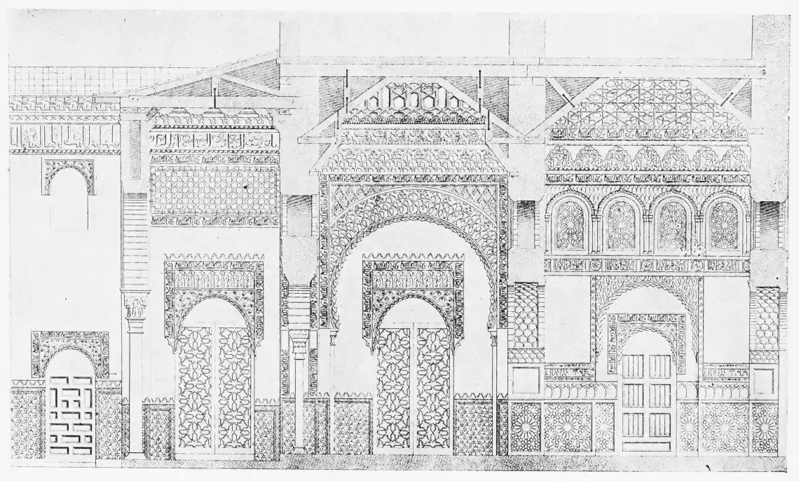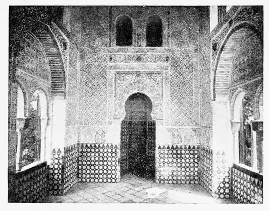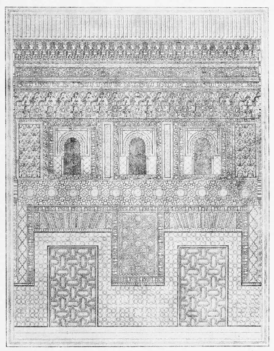 Don Mariano Contreras, Conservator of the Alhambra, the son of the gifted Raphaël Contreras, who devoted thirty-seven years of his life to the restoration of the Palace—gave me the benefit of his knowledge of this unique treasure-house of art; and I have also laid under contribution the beautiful plates of Owen Jones, who disposed of a Welsh inheritance in order to produce his great work on the Plans, Elevations, Sections and Details of the Alhambra. Jones’s Grammar of Ornament, which has been described as “beautiful enough to be the horn-book of the Angels,” also contains the result of his researches in the Alhambra, which occupied him for the greater part of eleven years. A selection of these illustrations is here rescued from the obscurity of public libraries and the inaccessible recesses of private collections. The inclusion of John F. Lewis’s drawings, and the reproduction of a series of pictures by James C. Murphy, who spent seven years in the study of the artistic marvels of the Alhambra, I do not feel called upon to defend. The photographs, several of which were placed at my disposal by Don Rafaël Garzón, represent the buildings as they appear to-day; the drawings were made before the Palace was damaged by the disastrous fire of September, 1890.{ix}