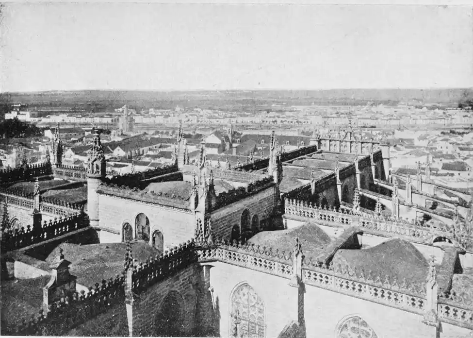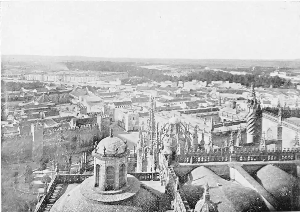 The highest platform of the Giralda affords, as might be expected, a very extensive view. On the whole, the prospect is disappointing. The neighbourhood of Seville is not beautiful, nor are there any very notable sites or natural features included within the panorama. Standing below Morel’s great statue, however, and gazing down upon the city, interesting considerations naturally present themselves. That the figure of Christian faith should thus be reared on the summit of a building specially intended to stimu{24}late the zeal and to excite the devotion of the followers of Islam is a reflection calculated to give profound satisfaction to the devout Spaniard. The whimsical philosopher may also find an appropriateness in the handiwork of the men of the simpler, cruder faith conducting one upwards to the more refined and complicated creed. I do not know if Mohammedans ever visit Seville. If so, they doubtless console themselves for the desecration of their sacred edifices by thoughts of Hagia Sophia and the onetime Christian churches of the East. And the Giralda has fared better at the hands of the Christians than many a church of their own has done. I may instance the chapel at Mayence, which with practically no alteration in its architecture and internal arrangements now serves the purpose of a beer-shop.