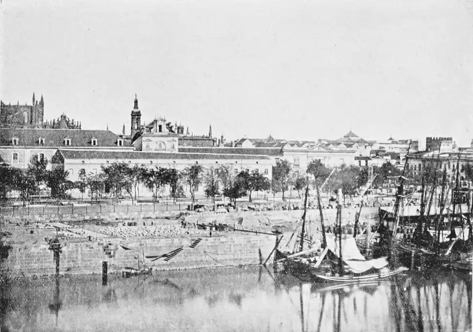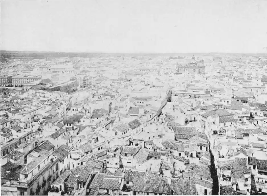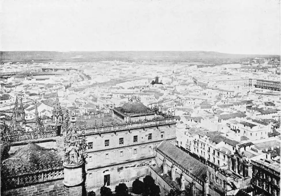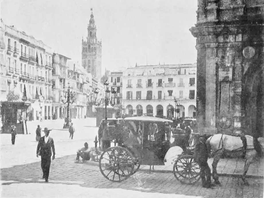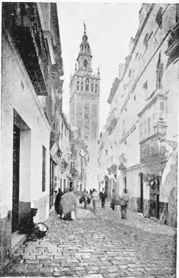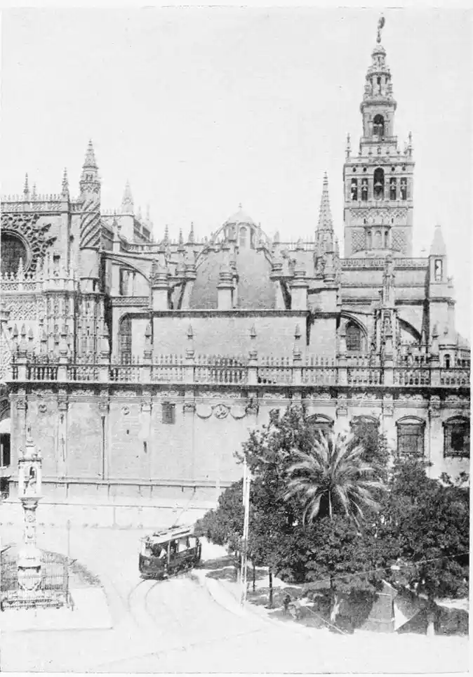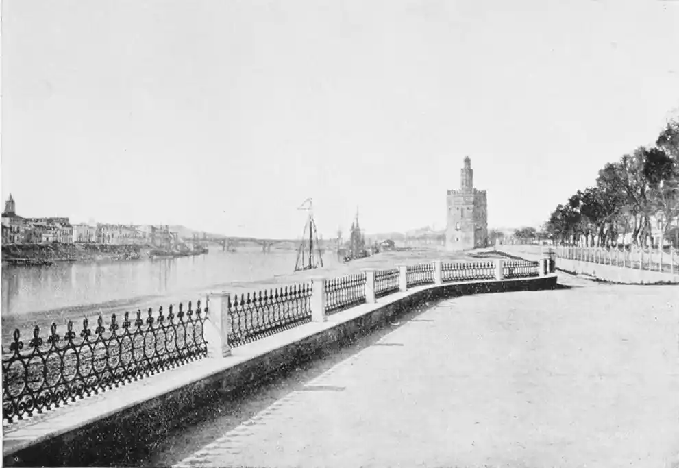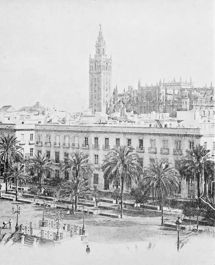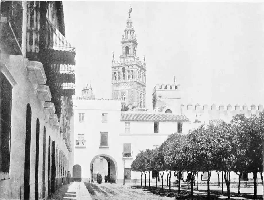 There is a charm and compelling fascination about Seville which produces in the traveller visiting the city for the first time a sensation of physical ecstasy. The spell of the Pearl of Andalusia is instant and enduring; I have not met a man or woman proof against its witchery. George Borrow shed tears of rapture as he beheld Seville from the Cristina Promenade, and “listened to the thrush and the nightingale piping forth their melodious songs in the woods, and inhaled the breeze laden with the perfume of its thousand orange gardens.” The Moors left their beloved capital at the height of its prosperity, in the full flower of its beauty; change has not affected its material importance, and time has not staled its infinite variety. A Christian Cathedral now stands on the foundation of the great mosque of Abu Yakub Yusuf; but the Moorish Giralda, the most expressive monument of the Mohammedan occupation, still beckons the distant traveller onwards to the promised land; the Alcazar breathes the spirit of its Oriental masters; and the shim{vi}mering Torre del Oro still reflects the light of the setting sun upon the broad bosom of the rose-coloured river.
