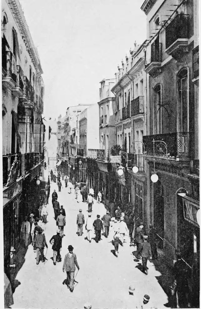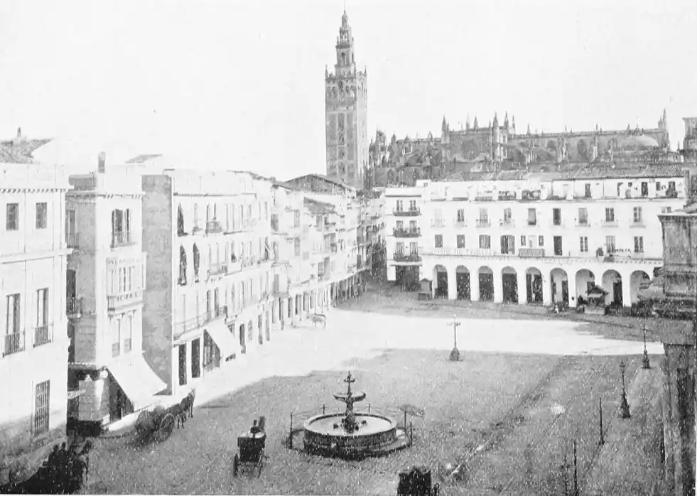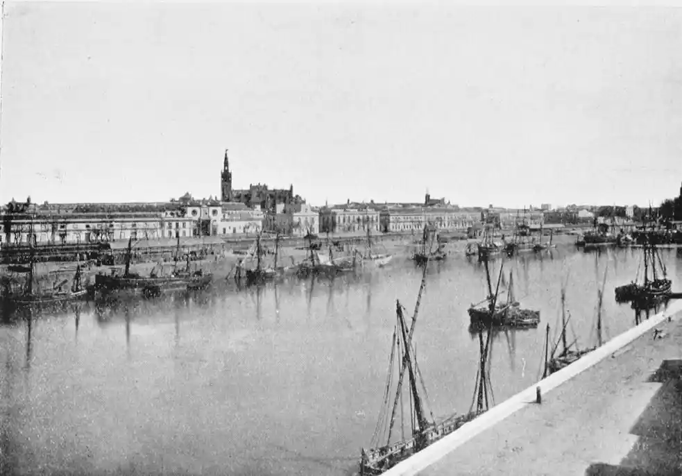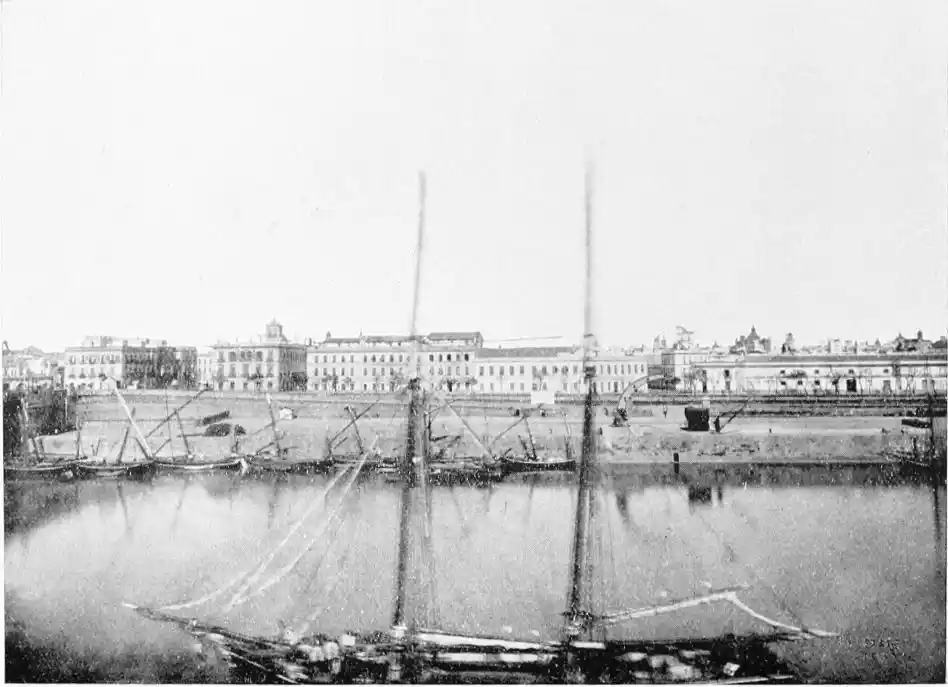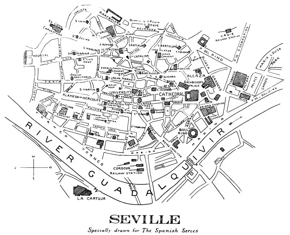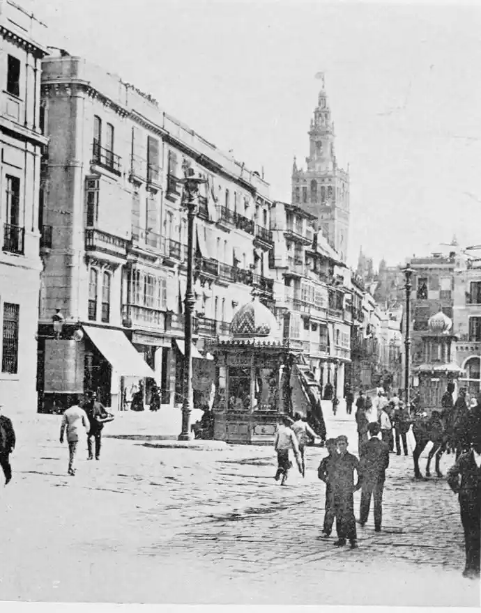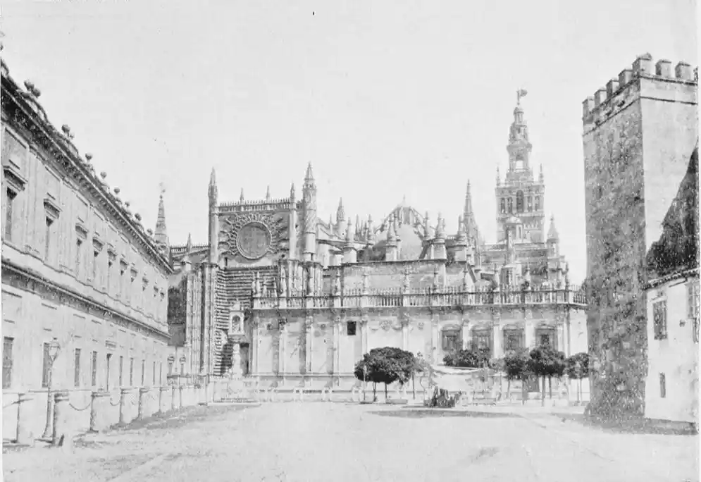 There is a charm and compelling fascination about Seville which produces in the traveller visiting the city for the first time a sensation of physical ecstasy. The spell of the Pearl of Andalusia is instant and enduring; I have not met a man or woman proof against its witchery. George Borrow shed tears of rapture as he beheld Seville from the Cristina Promenade, and “listened to the thrush and the nightingale piping forth their melodious songs in the woods, and inhaled the breeze laden with the perfume of its thousand orange gardens.” The Moors left their beloved capital at the height of its prosperity, in the full flower of its beauty; change has not affected its material importance, and time has not staled its infinite variety. A Christian Cathedral now stands on the foundation of the great mosque of Abu Yakub Yusuf; but the Moorish Giralda, the most expressive monument of the Mohammedan occupation, still beckons the distant traveller onwards to the promised land; the Alcazar breathes the spirit of its Oriental masters; and the shim{vi}mering Torre del Oro still reflects the light of the setting sun upon the broad bosom of the rose-coloured river.