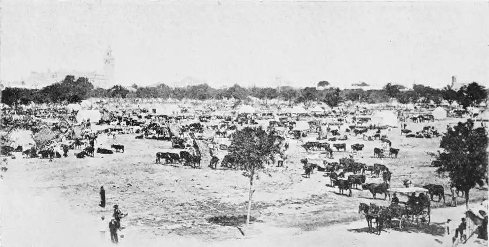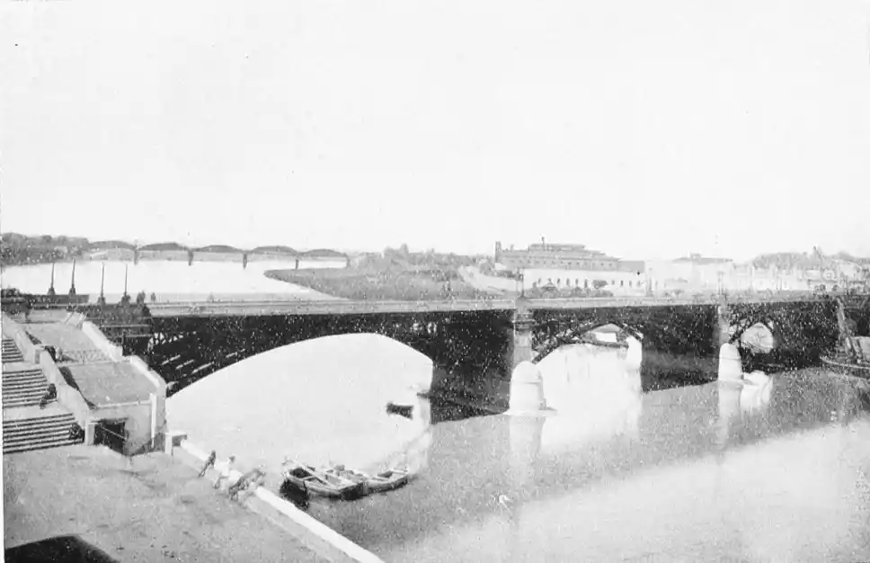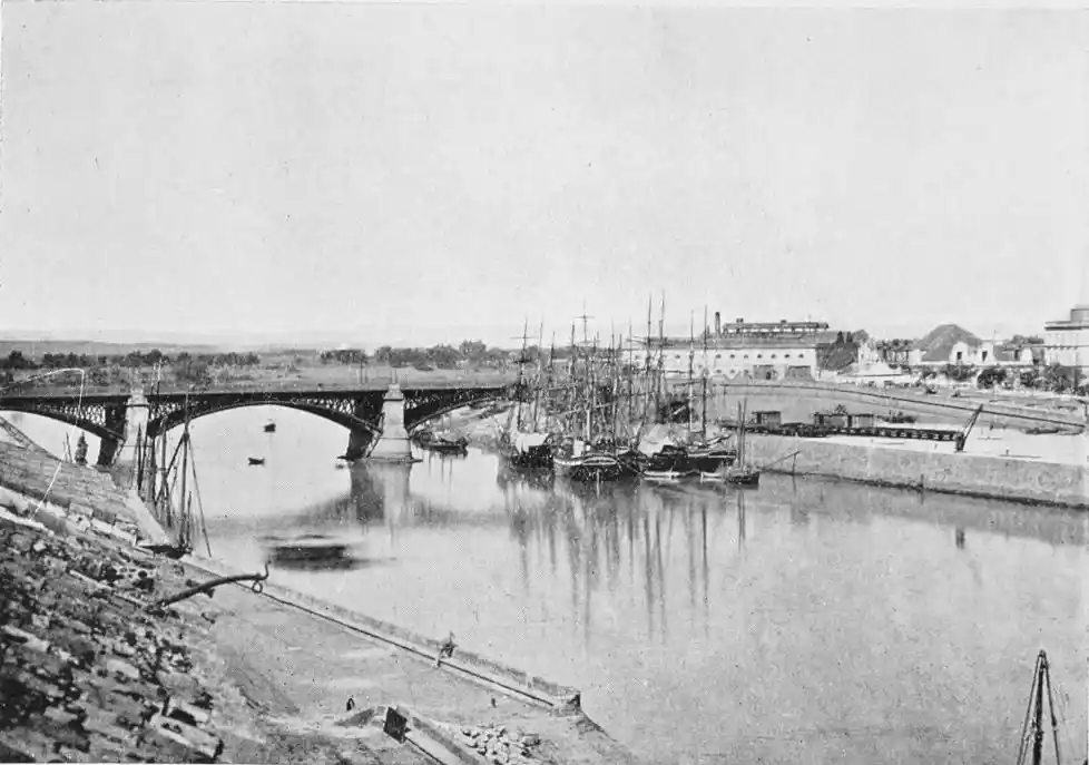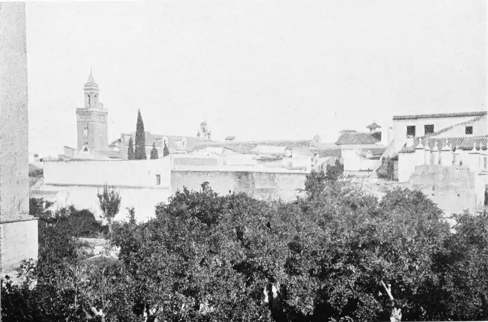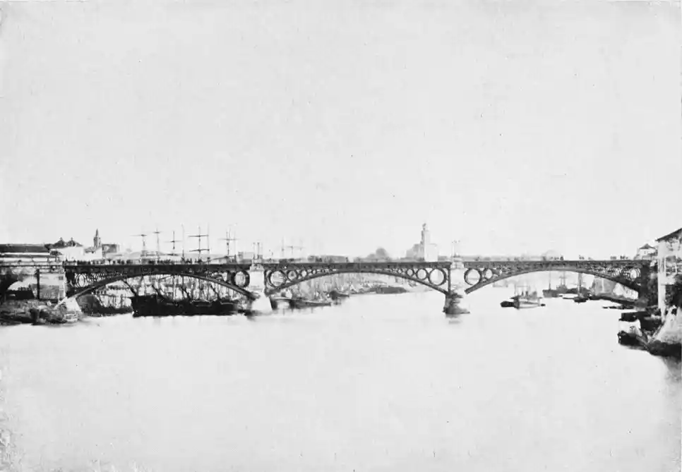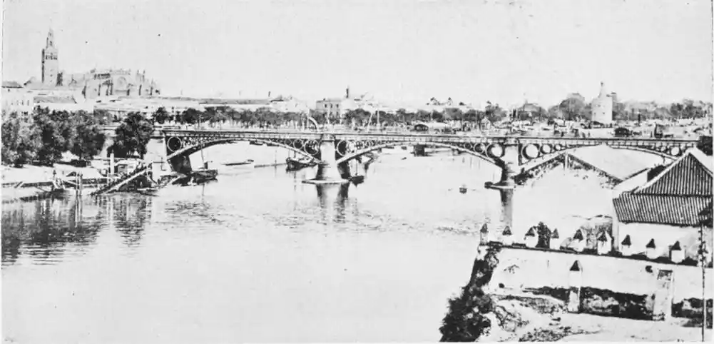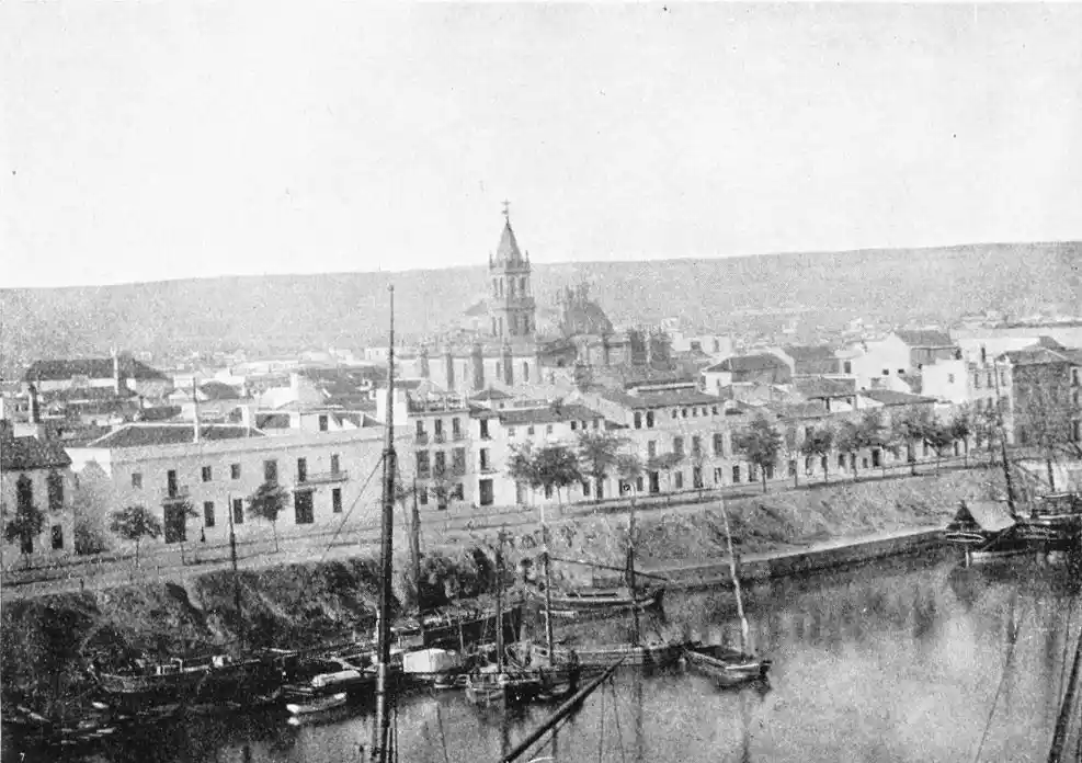 While attending by the construction of these numerous places of worship to the spiritual needs of their subjects, the Almohade rulers neglected no means of strengthening Ishbiliyah and of promoting its general prosperity. The city became the most important seat of Mohammedan power in the West. Trade rapidly increased, and the town became the principal resort of the{26} weavers, metal-workers, and other prominent Moorish craftsmen. Abu Yakub Yusuf was the first to throw a bridge of boats across the Guadalquivir, over which troops first passed on October 11th, 1171. This bridge immensely added to the strength of the city as a fortified place, as it established permanent communication between it and its principal source of supplies, the fertile district called the Ajarafa on the right bank of the river. The charms of this expanse, otherwise known as the Orchard of Hercules, are rapturously described by Arab historians. These are the words of the poet Ibn Saffar: “The Ajarafa surpasseth in beauty and fertility all the lands of the world. The oil of its olives goeth even to far Alexandria; its farms and orchards exceed those of other countries in size and convenience; so white and clean are they, that they appear like so many stars in a sky of olive gardens.” The Ajarafa is an Arabia Felix without wild beasts, the Guadalquivir a Nile without crocodiles. El Makkari says it measured about forty miles in each direction and contained a numerous population. Those who know the rather dreary country extending westward of the modern city will realise the melancholy change brought about by time.{27}