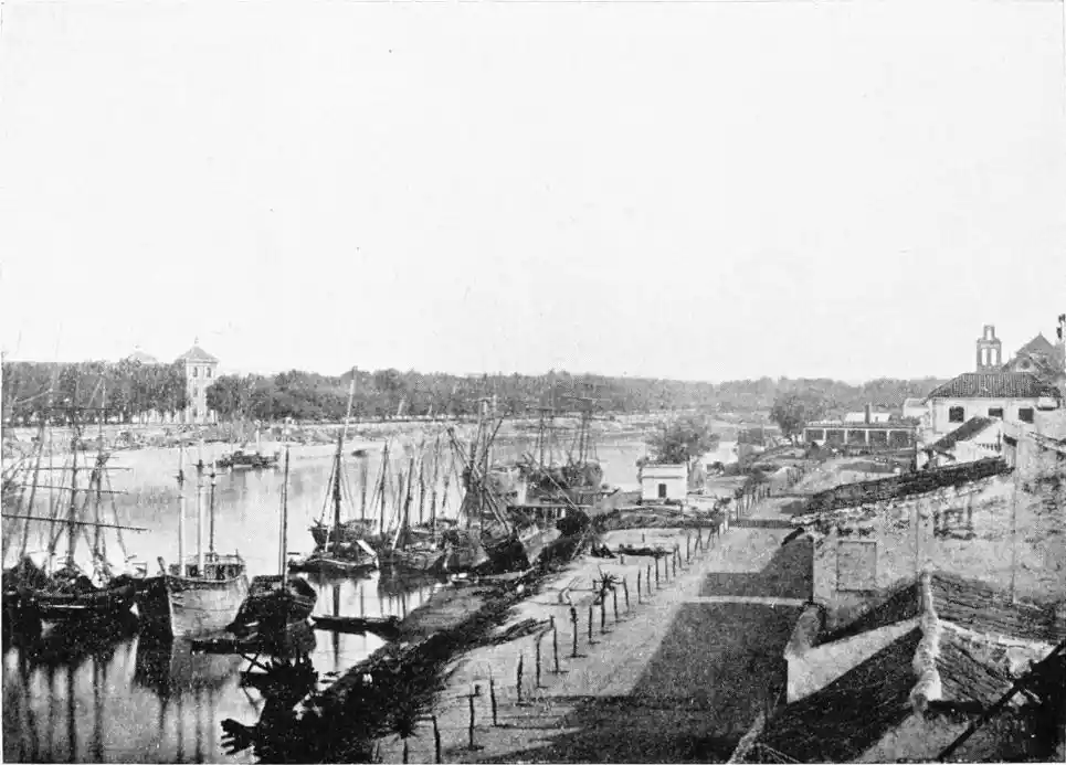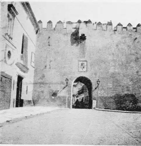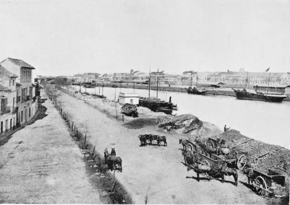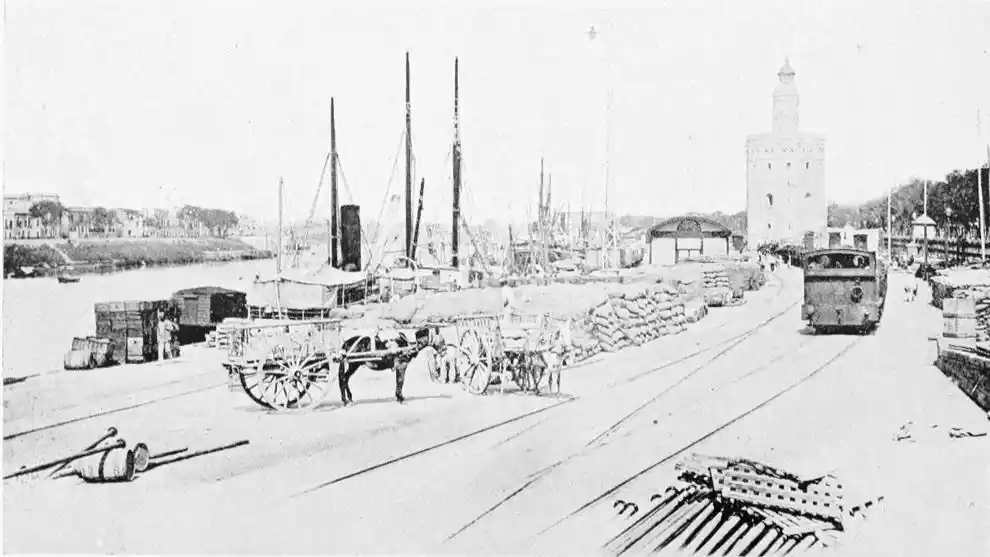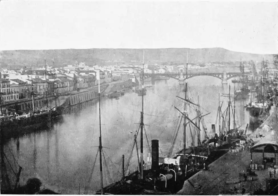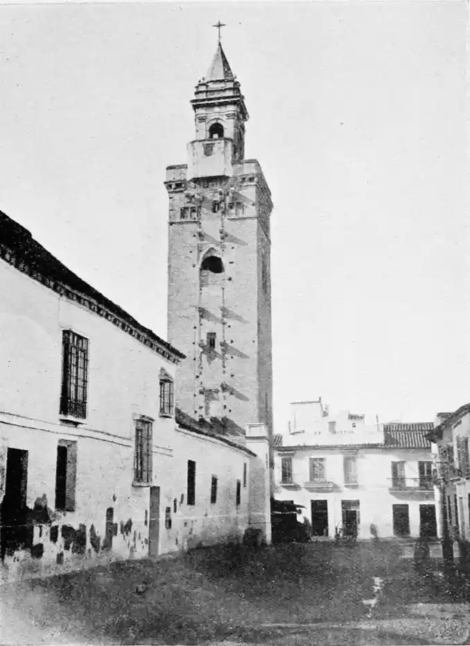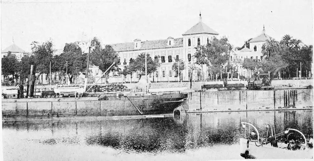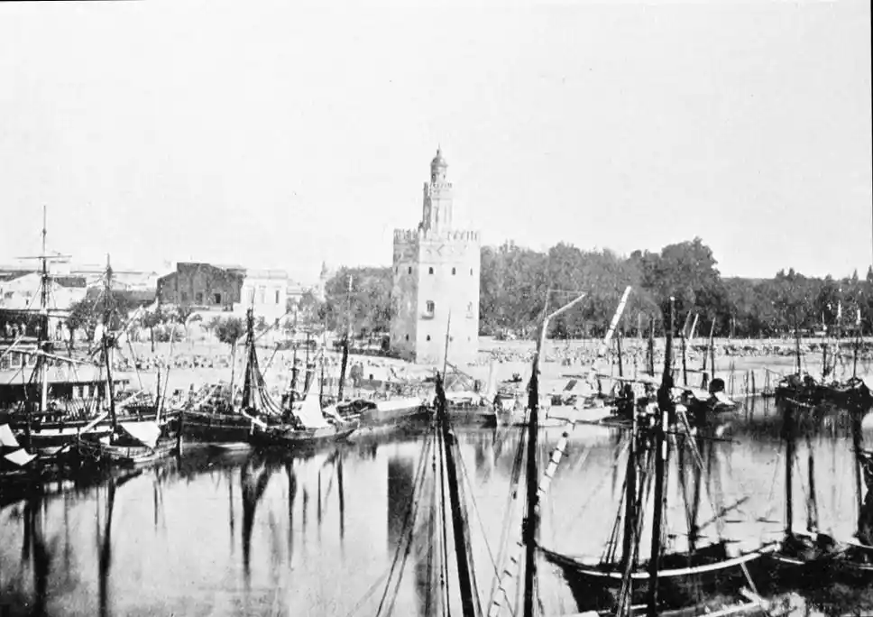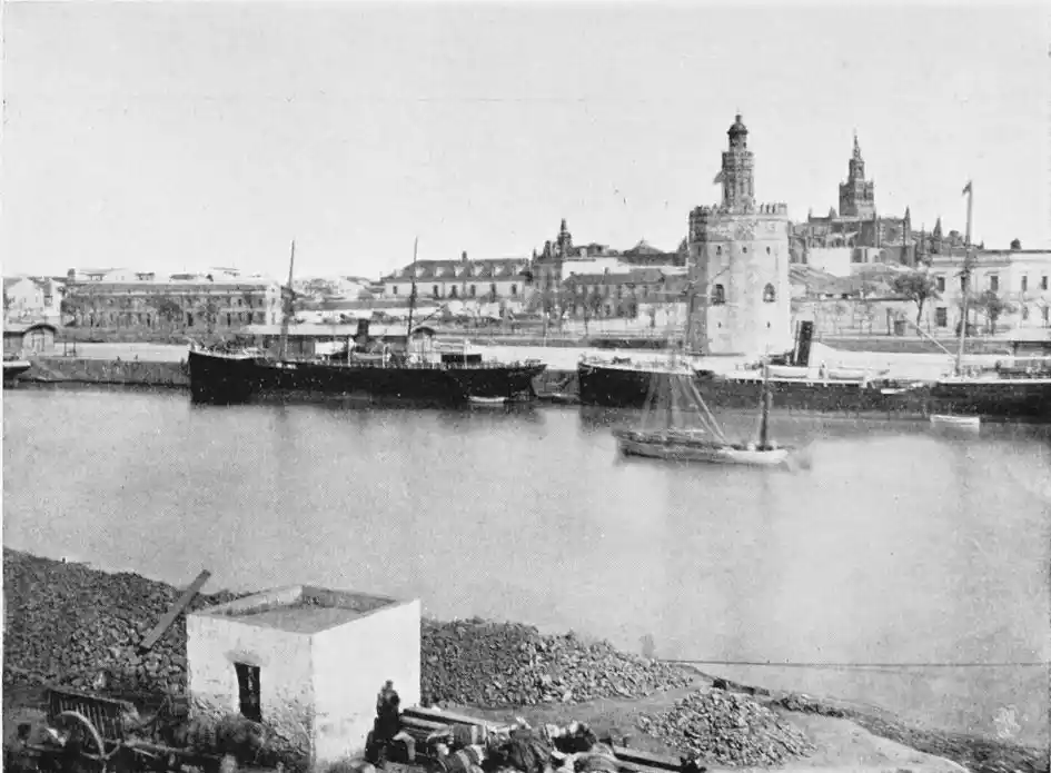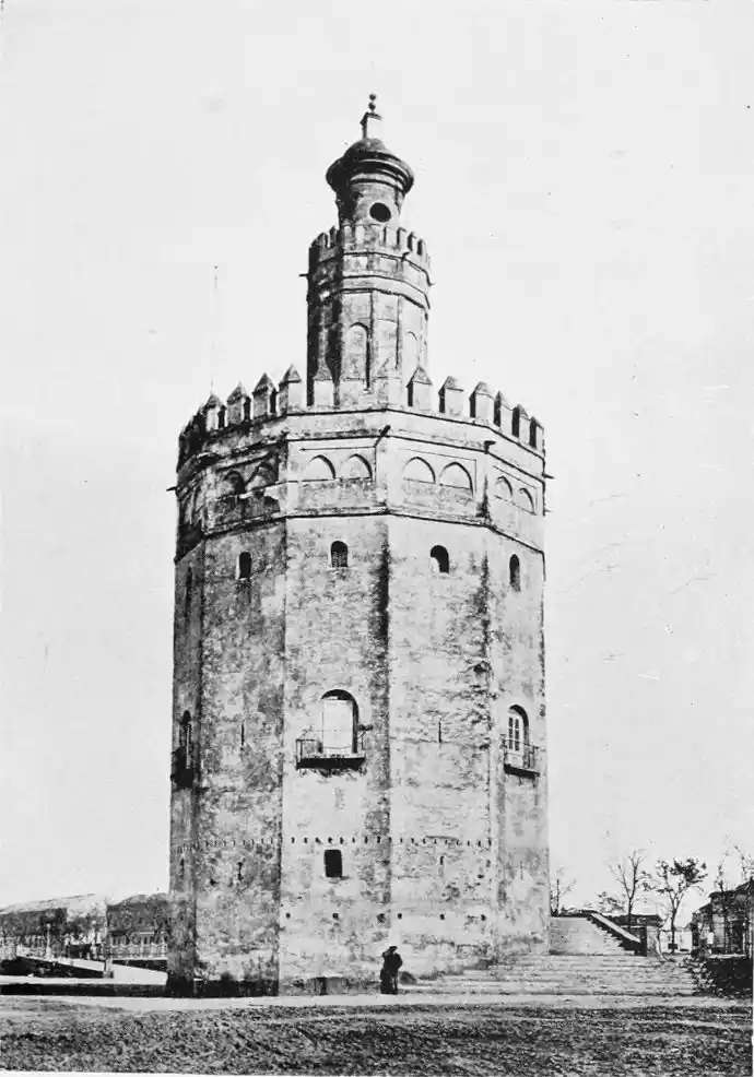 One of the most vital points in the defensive works was the poetically-named Torre del Oro (tower of gold), which still exists, and is familiar to every visitor to the city. The tower is a twelve-sided polygon of three storeys. It is surmounted by a smaller tower, also of twelve sides, which in turn supports a small round cupola. This superstructure was added in the eighteenth century, whereas the main building was erected by the Almohade governor Abu-l-Ala in the year 1220. The tower was in those days connected with the walls of the city by what is called in military parlance a curtain, which was pulled down as late as in 1821. The outwork faced another watch-tower on the opposite bank of the river, and a great iron chain was drawn from the one to the other, effectually closing the harbour against hostile vessels. The assaults of the foeman and the deadlier ravages of time have stripped this strong and graceful{28} monument of the beautiful tiles or azulejos with which it was once adorned, and which seemed to have earned for it its present name. No Danaë, alas! waits in this tower of gold to-day for tyrant or deliverer. The place is occupied by clerks, whose pens are ever busy recording the shipments of coal brought by incoming steamers; and the immediate vicinity is infested by “tramp” sailors of all nationalities, mostly British, for whose benefit, presumably, rum, “Old Tom,” and other stimulating but unromantic beverages are dispensed at kiosks and bars.