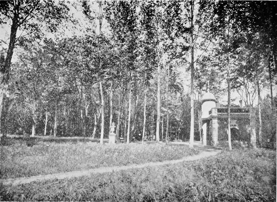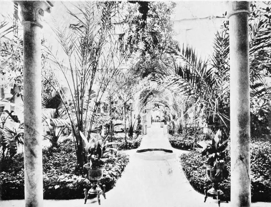 “In this garden the musicians played and the tawny dancers writhed and curved their lissome bodies, in dramatic Eastern dances. Ichabod! The moody potentate, bowed down with the cares of high office, no longer treads the dim corridor or lingers in the shade of the palm trees, lost in cogitation. No sound of gaiety reverberates in the deserted courts; no voice of orator is heard in the Hall of Justice. The green lizards bask on the deserted benches of the gardens. Rose petals strew the paved paths. One’s footsteps echo in the gorgeous patios, whose walls have witnessed many a scene of pomp, tragedy, and pathos. The spell of the past holds one; and before the imagination troops a long procession of illustrious sovereigns, courtiers, counsellors, and menials.”{48}