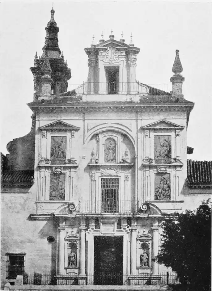 The edifice is in the decadent Greco-Roman style, and was designed by Bernardo Simón de{103} Pereda. The Baroque façade is adorned with five large blue faïence designs on a white ground, the subjects being Faith, Hope, and Charity, St James, and St George. Tradition has it that these were made after drawings by Murillo at the azulejo factory of Triana. The church hardly appears to us to warrant the description “one of the most elegant in Seville,” applied to it by Sir W. Stirling-Maxwell. Under the High Altar is buried the founder, Don Miguel. His own wish was to be buried at the entrance to the church, with the epitaph: Aqui yacen los huesos y cenizas del peor hombre que ha habido en el mundo (Here lie the bones and ashes of the worst man that ever lived in this world). His sword, and his portrait painted by Valdés Leal, are preserved in the Hospital.