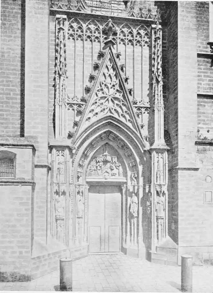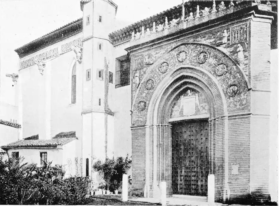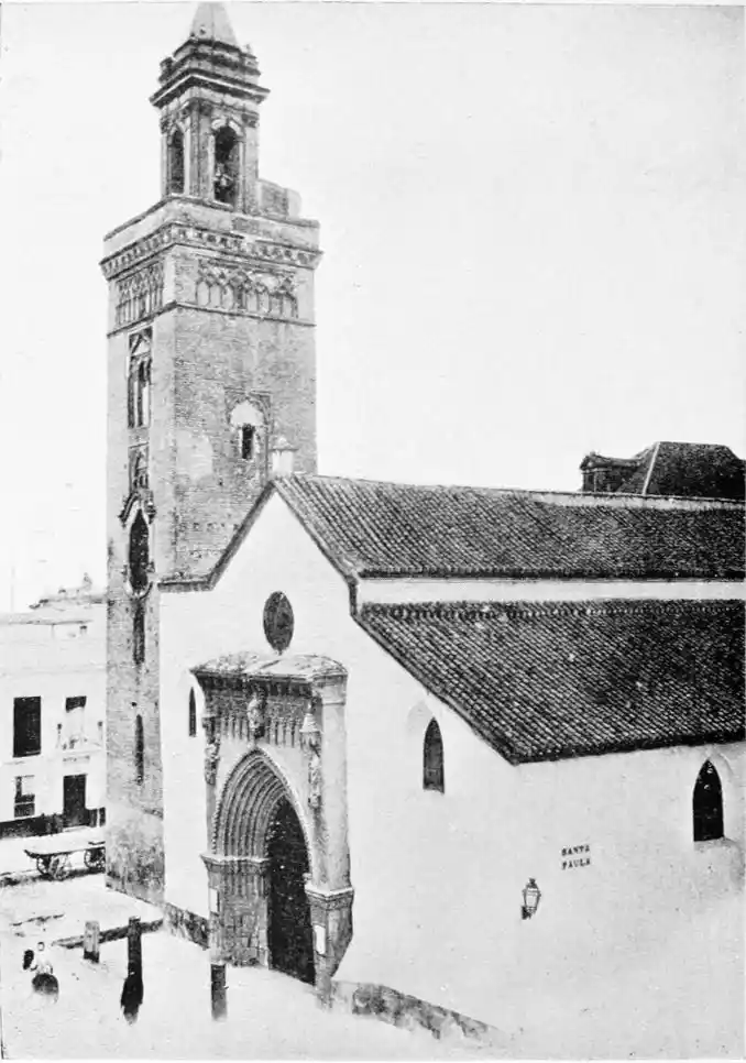 As the Giralda attests the size and beauty of the great mosque, so several smaller towers exist in Seville to mark the sites of the lesser Mohammedan temples. The most important of these is the tower or minaret of San Marcos. It is seventy-five feet high and ten feet broad—the highest edifice in the city except the Giralda. It is built according to the pure Almohade style, “without any admixture,” points out Señor de{25} Madrazo, “of the features taken from the Christian architecture of the West.” According to Mr Walter M. Gallichan there is a tradition that Cervantes used to ascend this tower to scan the vicinity in search of a Sevillian beauty of whom he was enamoured. The church is Gothic, and dates from 1478, but the beautiful portal exhibits Mudejar workmanship, and may be ascribed to the days of St Ferdinand or of his immediate successors.