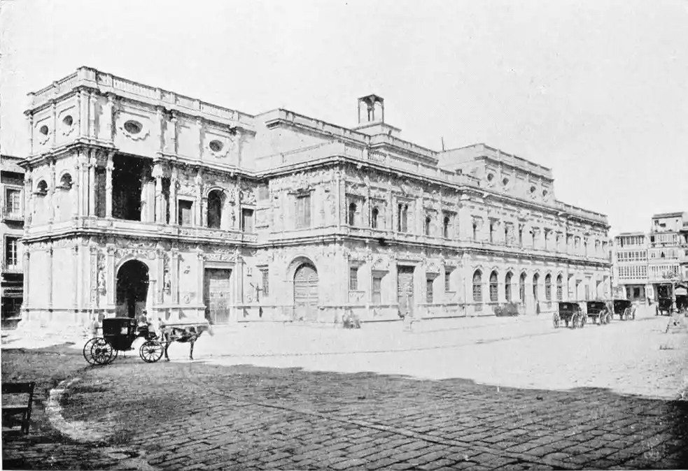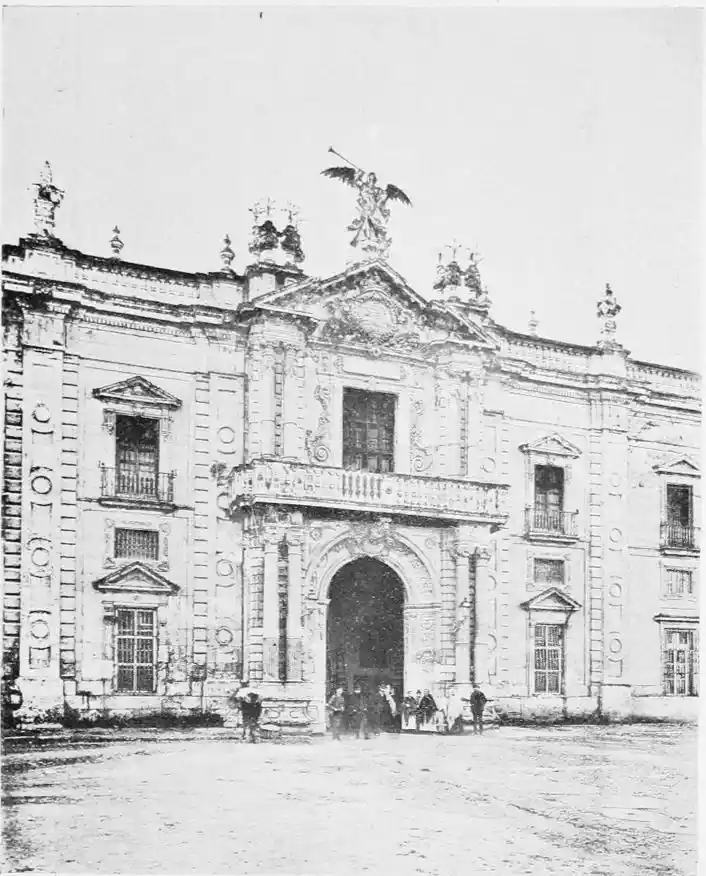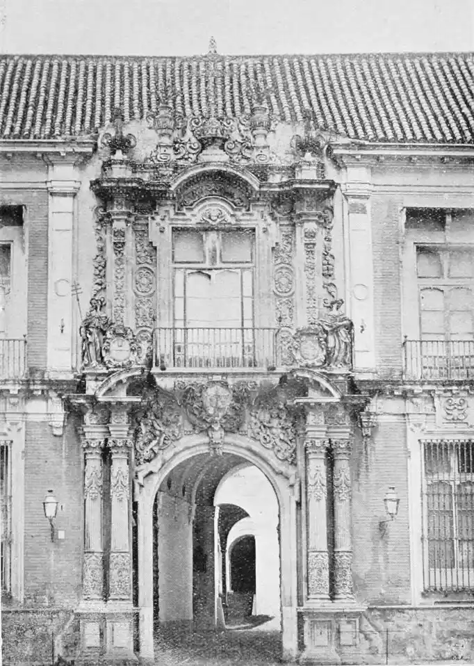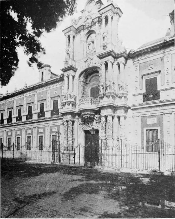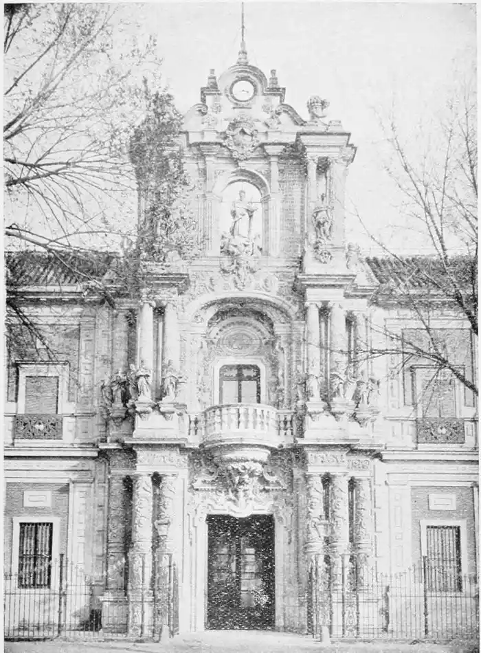 The last building which may be said to rank as an architectural monument erected in Seville is the Palacio de San Telmo, now the residence of the Duc de Montpensier. In the year 1682 the Naval School of San Telmo was founded on the site of the former palace of the Bishops of Morocco and the tribunal of the Holy Office. The present edifice, begun, after plans by Antonio Rodriguez, in 1734, was not completed till 1796. The palace adjoins the beautiful gardens of the Delicias. The façade is exceedingly ornate, the decoration being in the Plateresco style. The general effect is pleasing, but critics have been{106} unsparing in their denunciations of the structure. It certainly reflects the debasing influence of the architect Jose Churriguera (1665-1725), who has given his name (Churrigueresque) to one of the most tawdry and tasteless styles of architecture.
