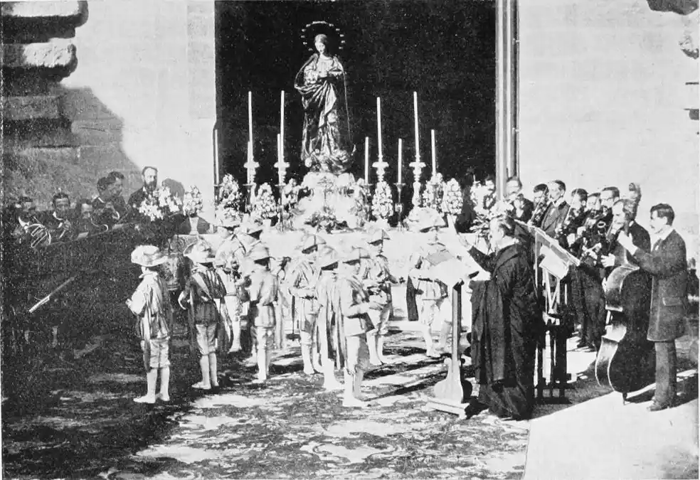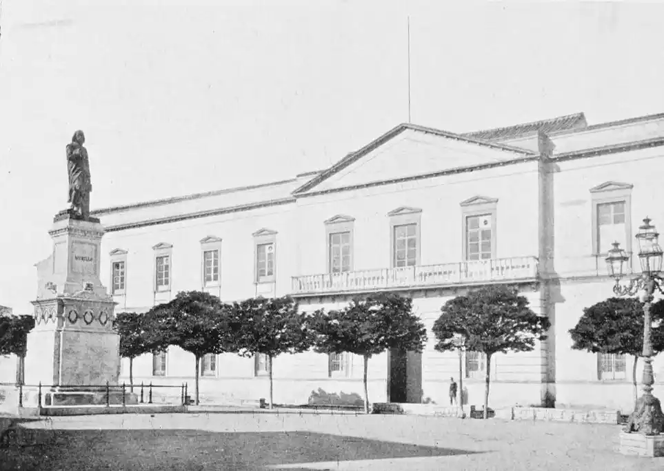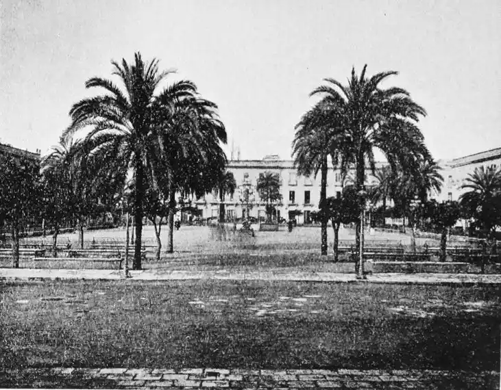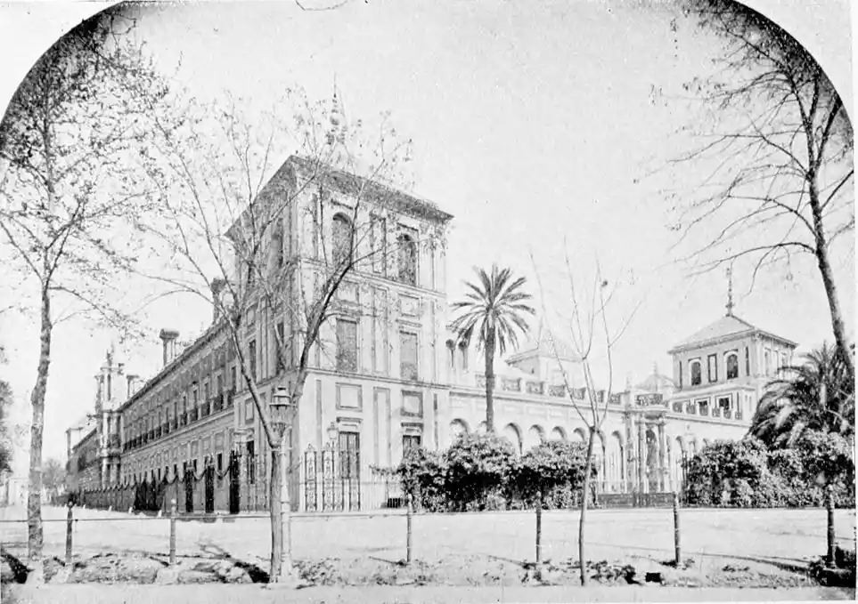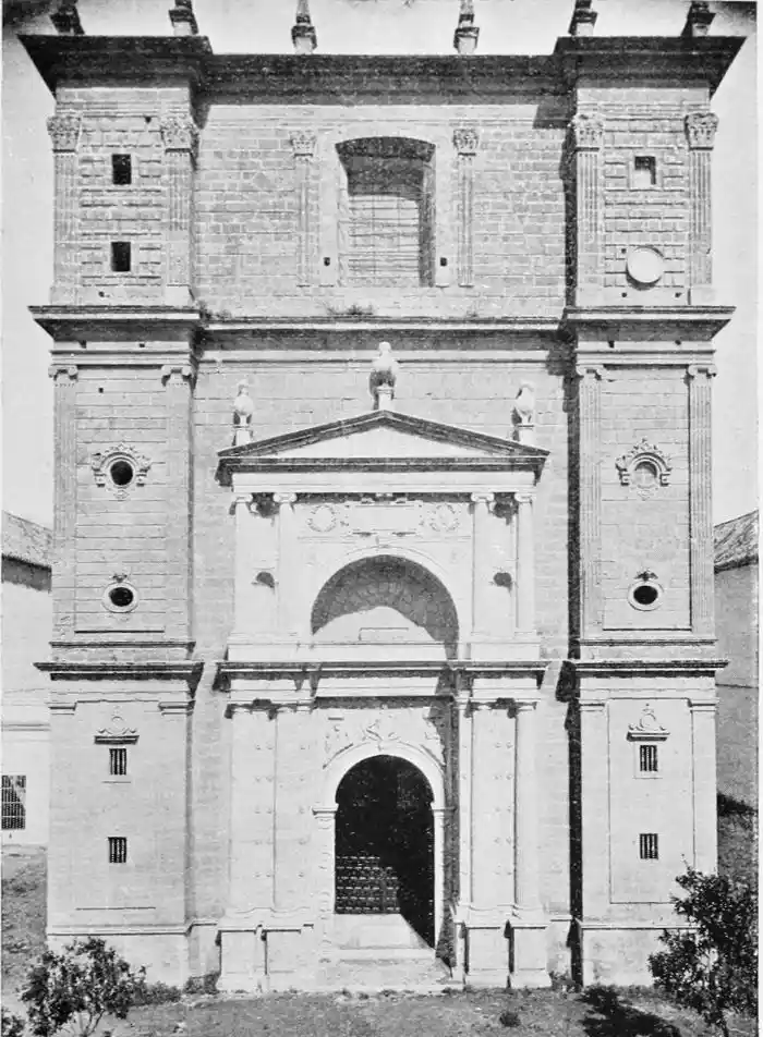 The last building which may be said to rank as an architectural monument erected in Seville is the Palacio de San Telmo, now the residence of the Duc de Montpensier. In the year 1682 the Naval School of San Telmo was founded on the site of the former palace of the Bishops of Morocco and the tribunal of the Holy Office. The present edifice, begun, after plans by Antonio Rodriguez, in 1734, was not completed till 1796. The palace adjoins the beautiful gardens of the Delicias. The façade is exceedingly ornate, the decoration being in the Plateresco style. The general effect is pleasing, but critics have been{106} unsparing in their denunciations of the structure. It certainly reflects the debasing influence of the architect Jose Churriguera (1665-1725), who has given his name (Churrigueresque) to one of the most tawdry and tasteless styles of architecture.