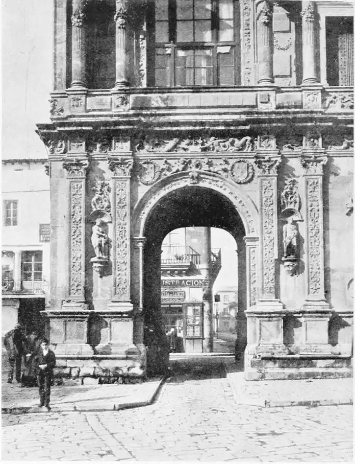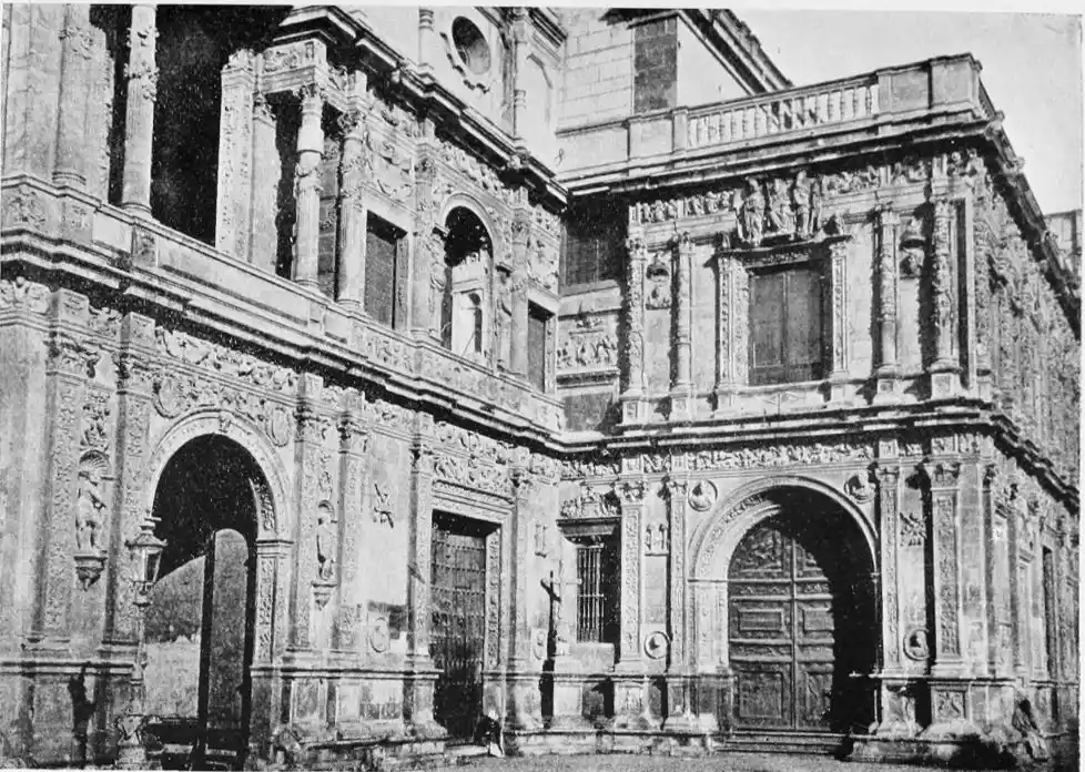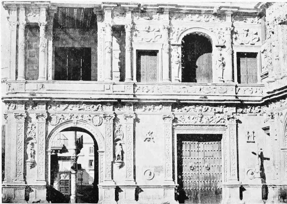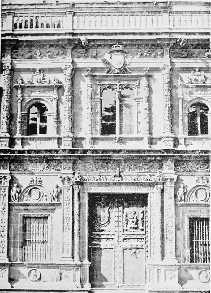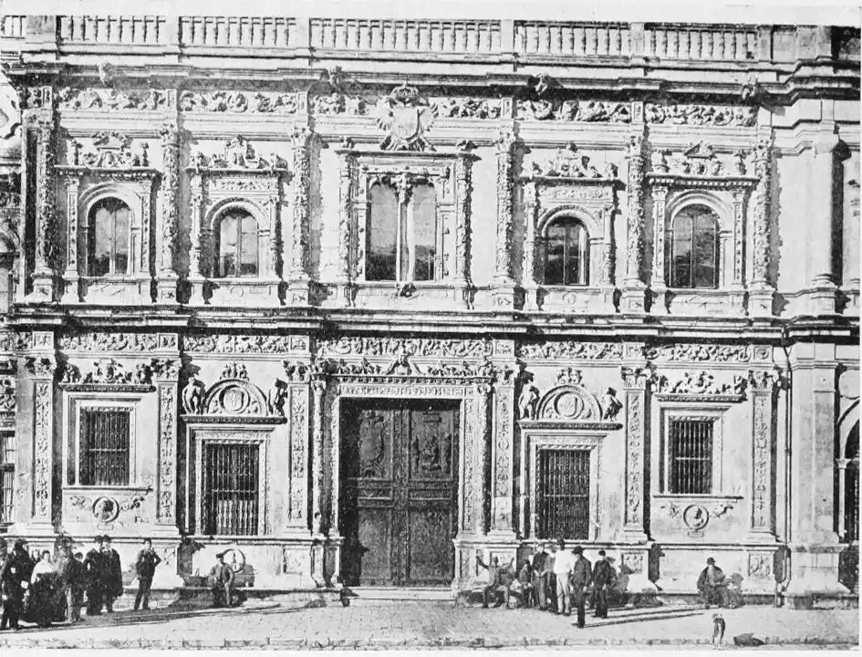 The Renaissance made itself felt in Spain during the reign of Charles V., and was productive of the plateresco style. Seville contains two imposing monuments of this type of architecture—the Ayuntamiento (Town Hall) and Lonja (Exchange). The first-named was begun in 1527 by Diego de Riaño, and completed under Felipe II., about forty years later. Madrazo considers the building “somewhat inharmonious through the variety, a little excessive, of its lines, but admirable for the richness of the decoration and for fine and delicate{98} execution—a merit of the first importance in structures of this style, where the sculptor or stone-cutter ranked with the architect.”