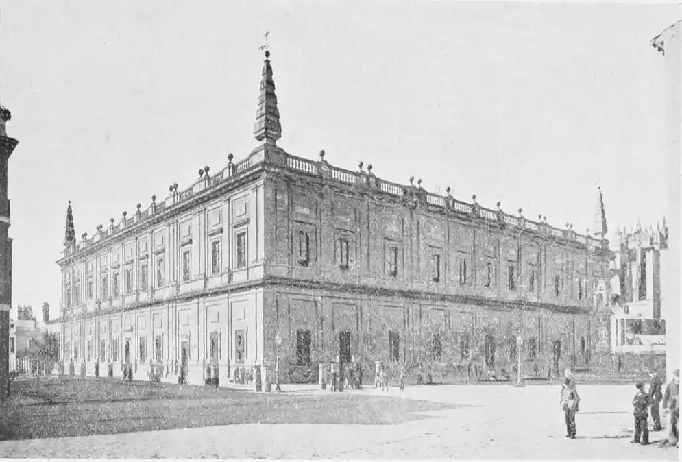 The Lonja or Exchange dates from Felipe II.’s{99} reign. The Patio de los Naranjos was formerly frequented by the merchants and brokers of Seville for the transaction of business, and this practice interfering seriously with divine worship in the Cathedral, the Archbishop, Cristobal de Rojas, petitioned Felipe II. to follow the precedent just established by Sir Thomas Gresham and to build an Exchange or Casa de Contratacion. The preparation of the plans was confided to Herrera, and the building, under the direction of Juan de Minjares, was finished in 1598—at precisely the time, as Ford remarks, that the commerce of Seville began to decline. The Lonja in its stern simplicity reflects, like the Escorial, the temper of Felipe II.—a sovereign, unpopular though he may have been, in whom it is impossible not to recognise the elements of greatness. The edifice forms a perfectly regular quadrangle, and the sobriety of the decoration affords a striking contrast to the gorgeous profusion of the Ayuntamiento. The inner court is noble and severe with its gallery of Doric and Ionic columns. The dignity of the whole has been impaired by later additions and restorations. Here are deposited the archives of the Indies (i.e. South America), the documents being arranged in handsome mahogany cases. They have never been{100} thoroughly gone through and examined. The business men of Seville soon abandoned their Exchange, and it is chiefly to be remembered as the seat of Murillo’s Academy of Painters, founded in 1660.