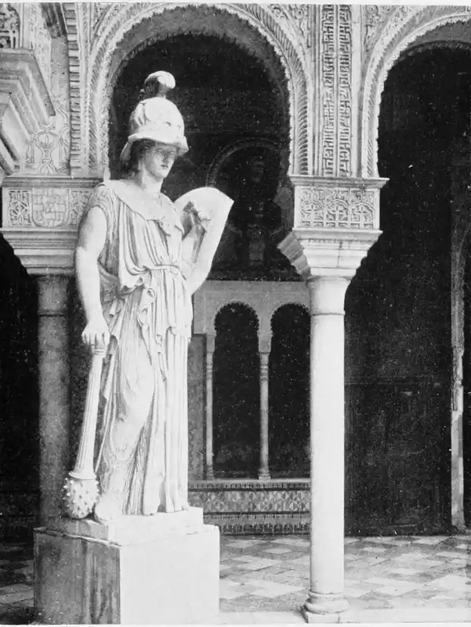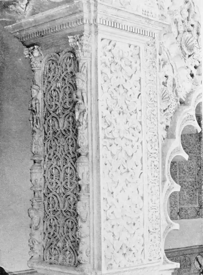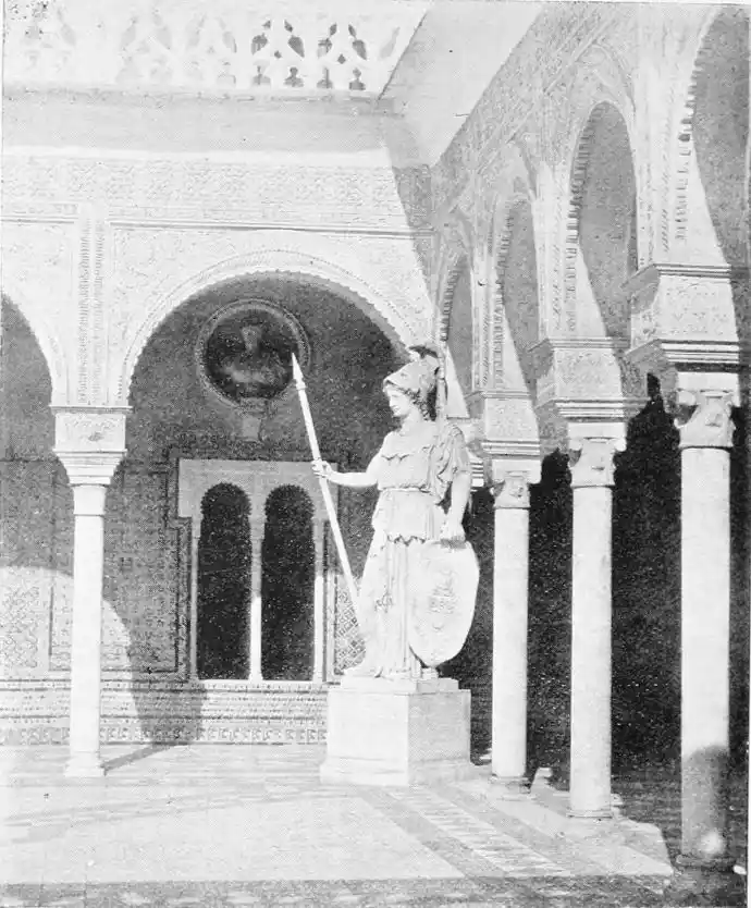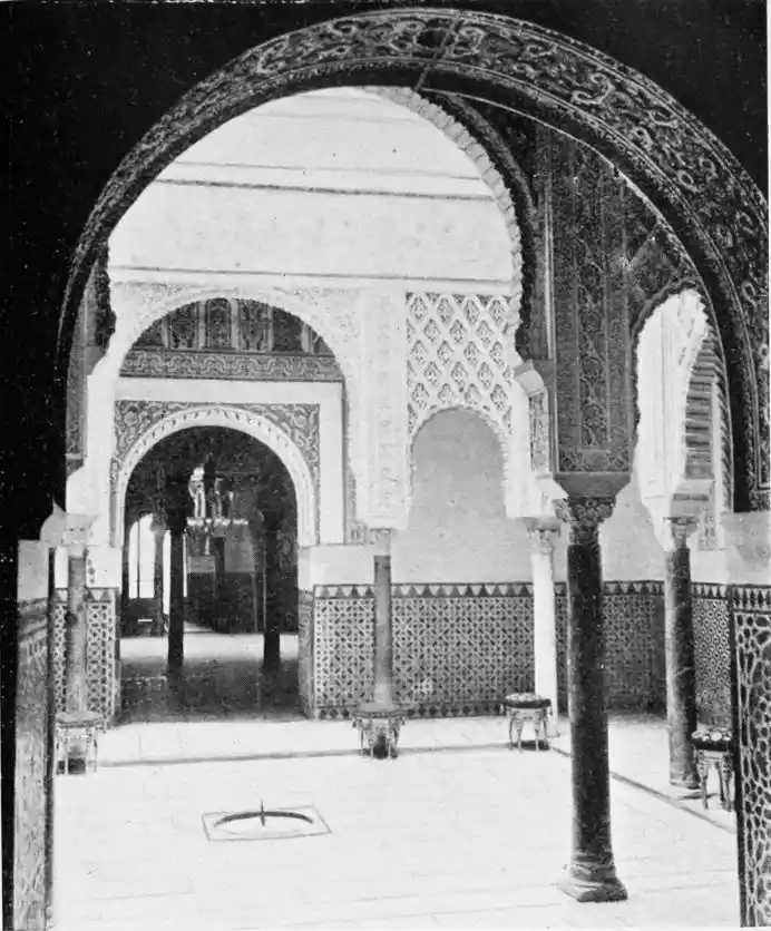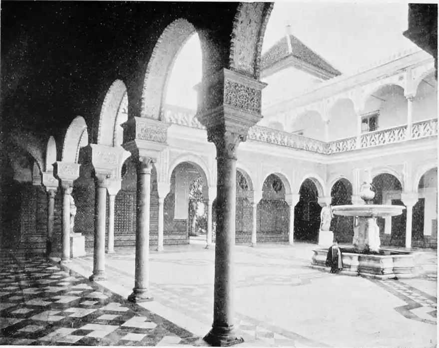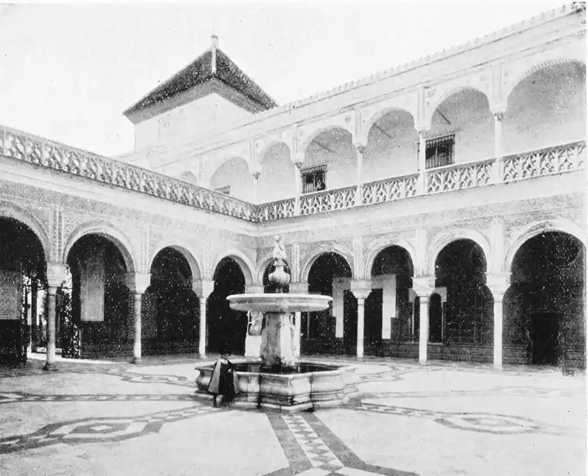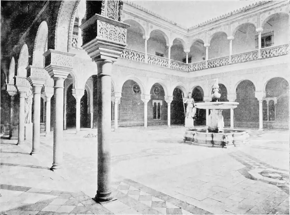 The central patio is markedly Moorish in character, and is encircled with arcades of extraordinary symmetry and beauty. Pedro de Madrazo calls attention to the harmonious variety and irregularity of the arches and windows, comparing the effect thus produced to the admired disorder of the forest and plantation. The decoration of the walls and arches bears a general resemblance to that of the Alcazar, but on closer examination the influence of the plateresco, Late Gothic, and Renaissance styles is revealed. The fountain in the middle of the patio is adorned with dolphins and four huge statues belonging to the best period of Roman art. The chapel is in the mixed pointed and Moorish styles. In the vestibule the ajaraca, or trellis-work, the azulejos, and the ajimeces, or twin-windows (now converted into ordinary windows) recall Moorish art; while the{94} ceiling is in the plateresco style. The arch of the chapel is Gothic, and its walls are laid with azulejos and stucco. In the middle of the floor stands a short marble column, a copy of the pillar at which Christ is supposed to have been scourged, preserved at Rome; it was the gift of Pius V.