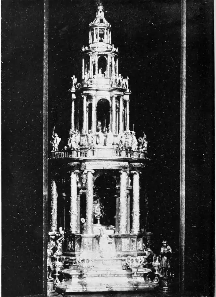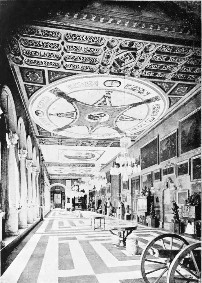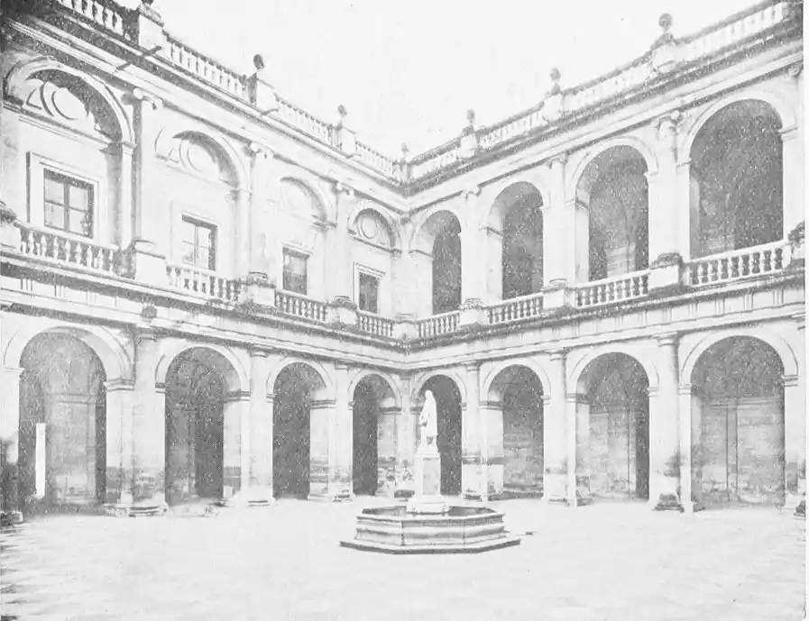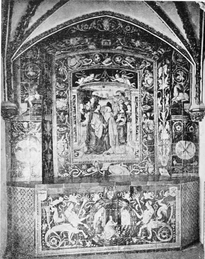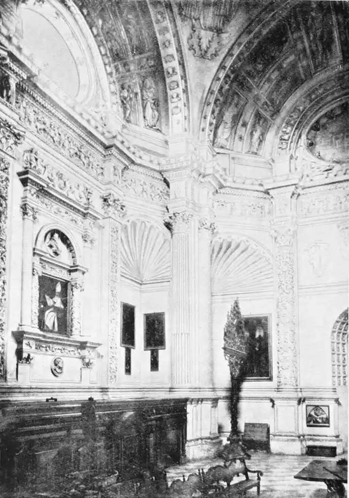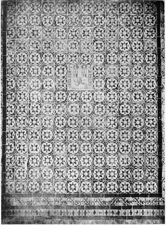 The central patio is markedly Moorish in character, and is encircled with arcades of extraordinary symmetry and beauty. Pedro de Madrazo calls attention to the harmonious variety and irregularity of the arches and windows, comparing the effect thus produced to the admired disorder of the forest and plantation. The decoration of the walls and arches bears a general resemblance to that of the Alcazar, but on closer examination the influence of the plateresco, Late Gothic, and Renaissance styles is revealed. The fountain in the middle of the patio is adorned with dolphins and four huge statues belonging to the best period of Roman art. The chapel is in the mixed pointed and Moorish styles. In the vestibule the ajaraca, or trellis-work, the azulejos, and the ajimeces, or twin-windows (now converted into ordinary windows) recall Moorish art; while the{94} ceiling is in the plateresco style. The arch of the chapel is Gothic, and its walls are laid with azulejos and stucco. In the middle of the floor stands a short marble column, a copy of the pillar at which Christ is supposed to have been scourged, preserved at Rome; it was the gift of Pius V.