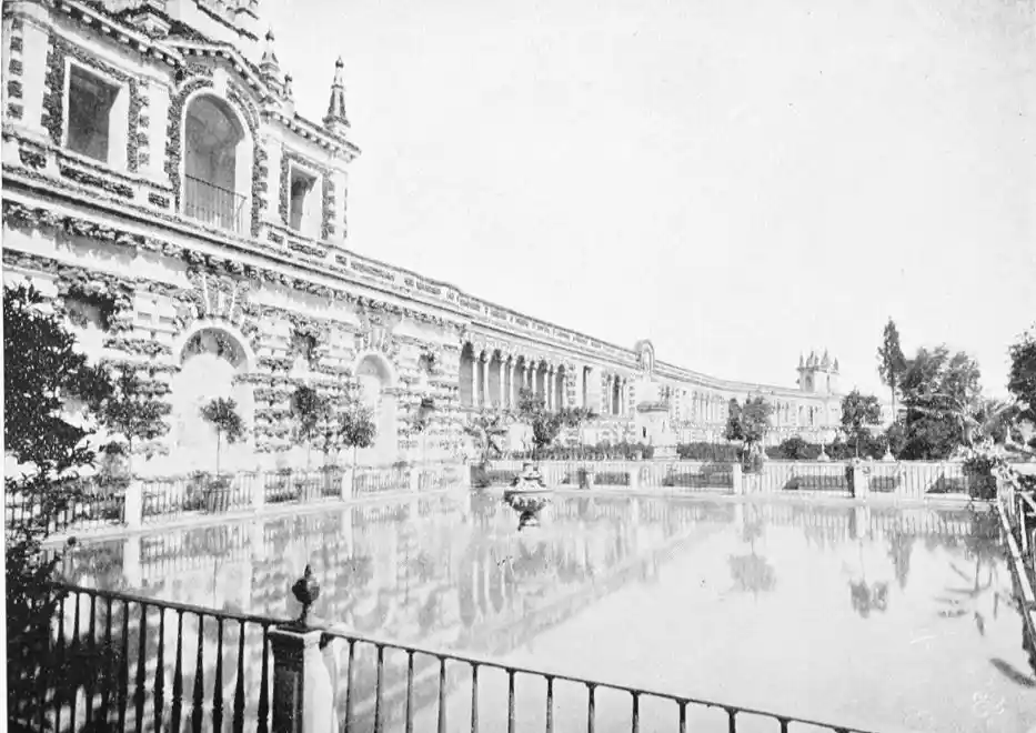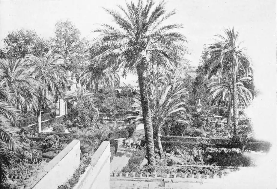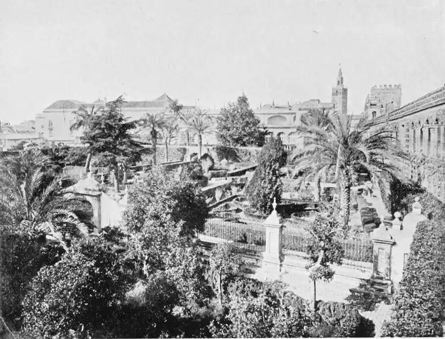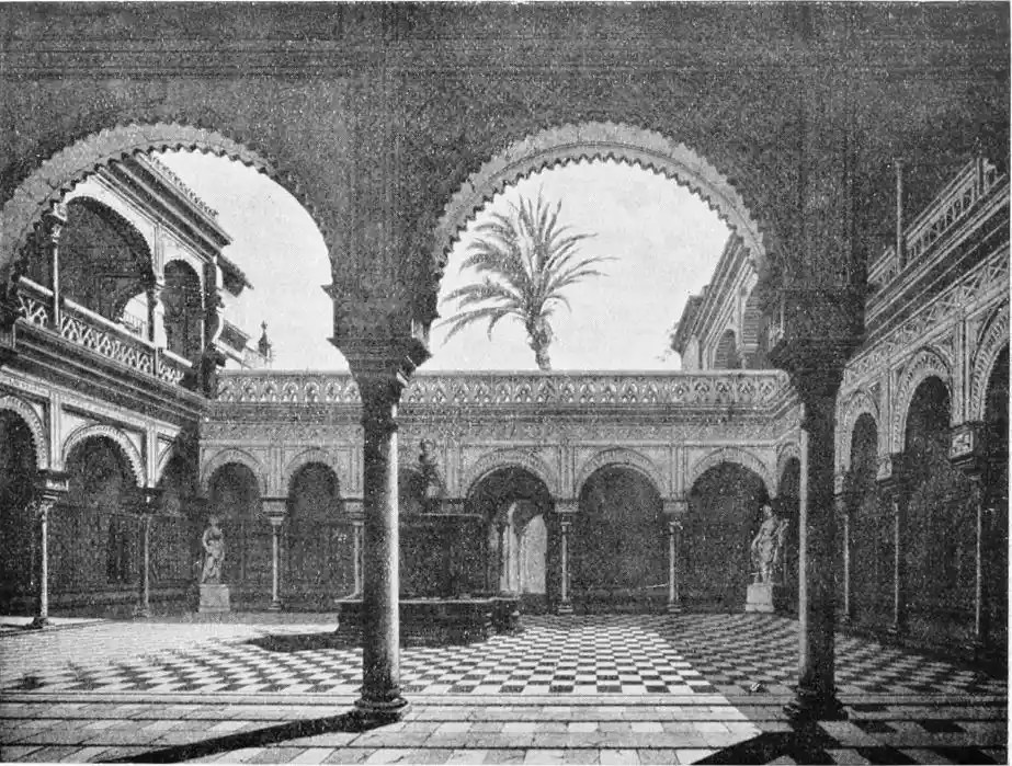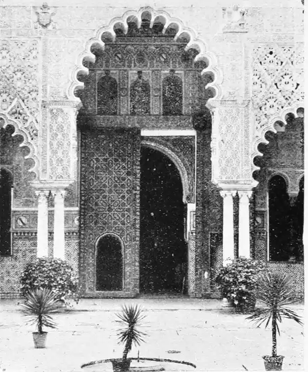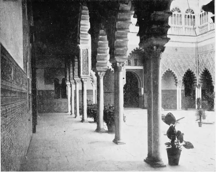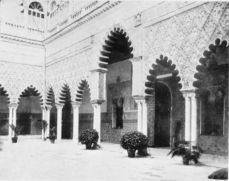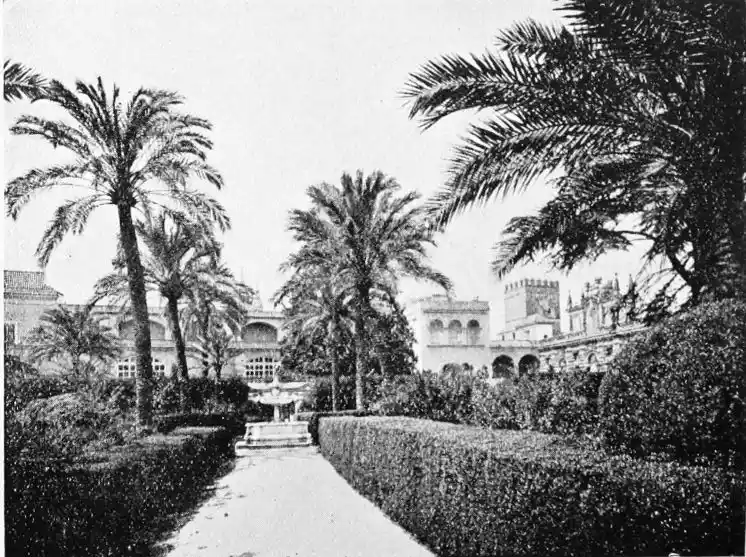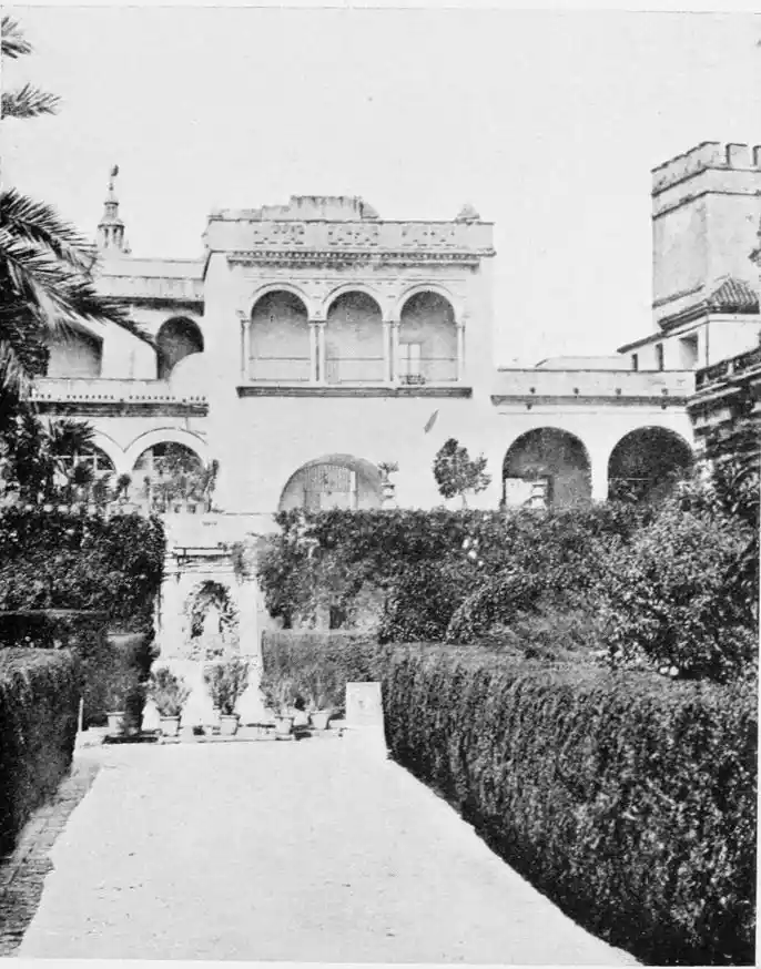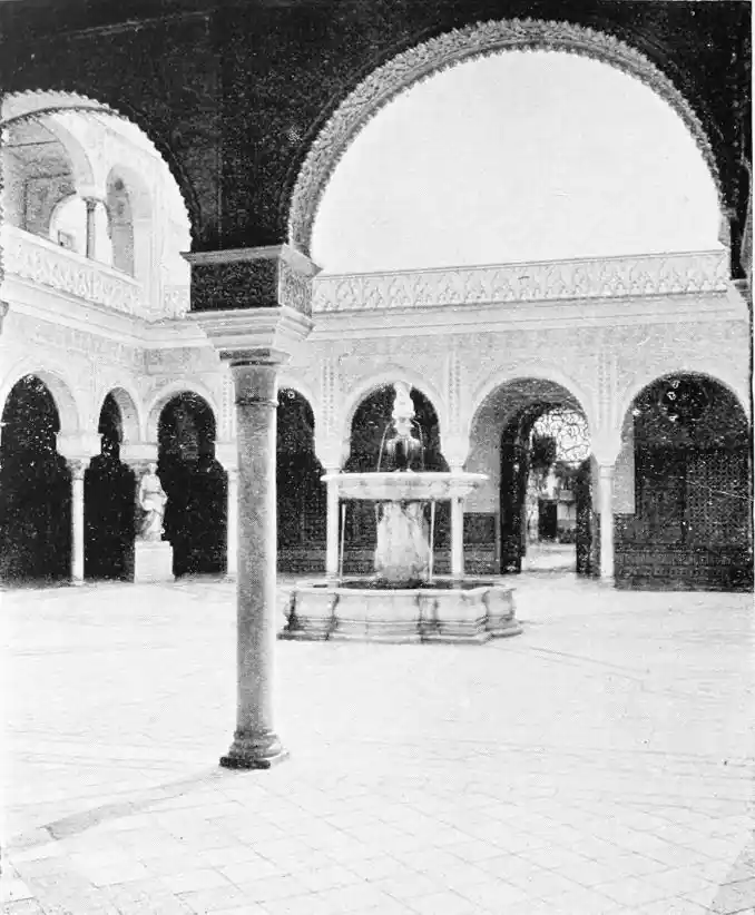 In spite of the severe strictures of fastidious observers, the Alcazar produces a very pleasing impression on northern visitors. Mr W. M. Gallichan writes: “It is a palace of dreams, encircled by lovely perfumed gardens. Its courts and salons are redolent of Moorish days and haunted by the spirits of turbaned sheiks, philo{47}sophers, minstrels, and dark-eyed beauties of the harem.... The nightingales still sing among the odorous orange bloom, and in the tangles of roses birds still build their nests. Fountains tinkle beneath gently moving palms; the savour of orientalism clings to the spot. Here wise men discussed in the cool of summer nights, when the moon stood high over the Giralda and white beams fell through the spreading boughs of the lemon trees, and shivered upon the tiled pavements.