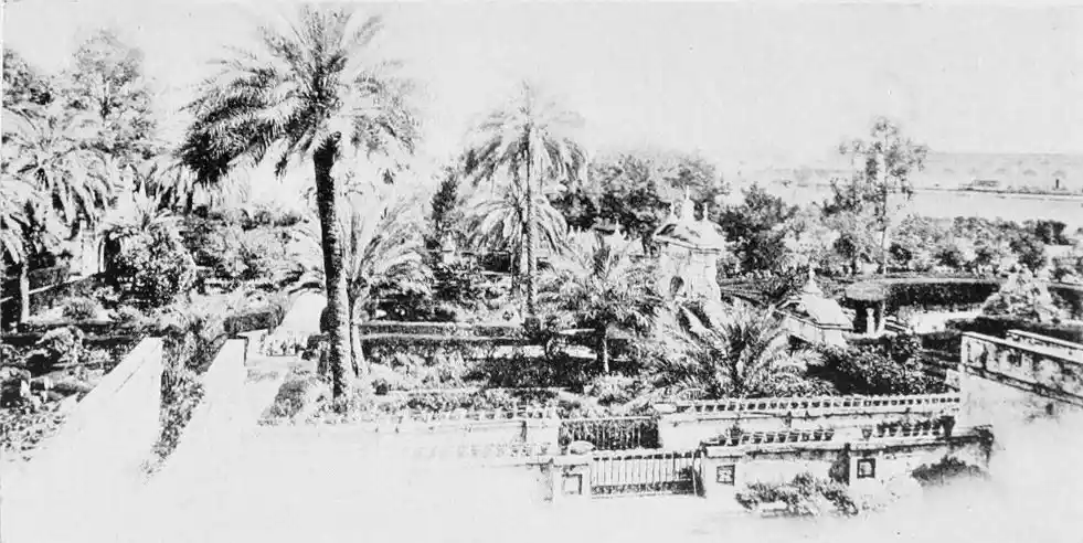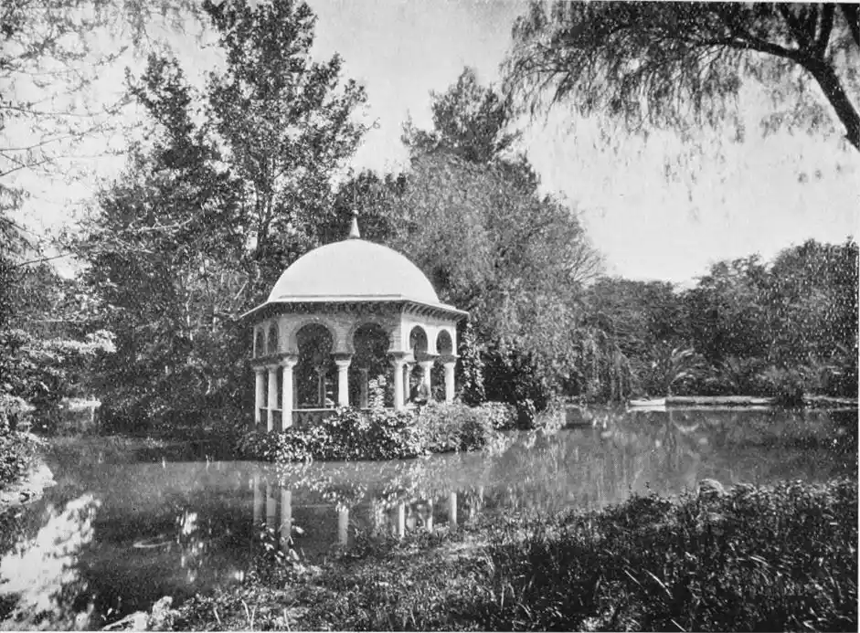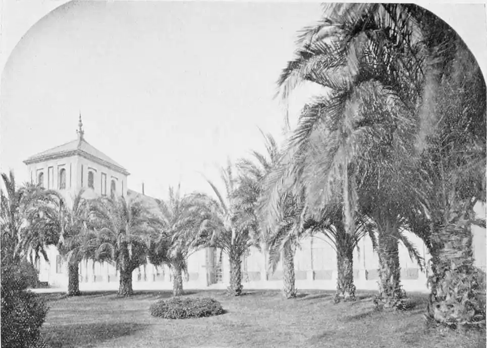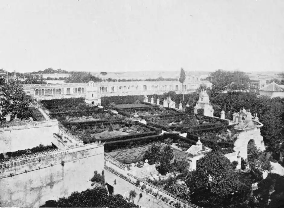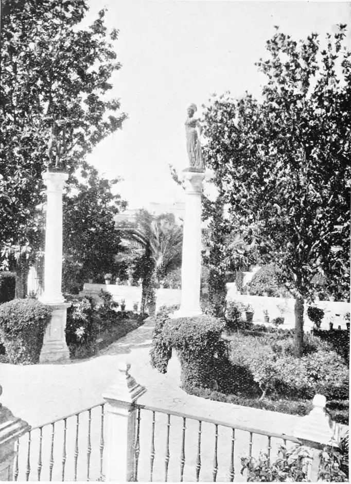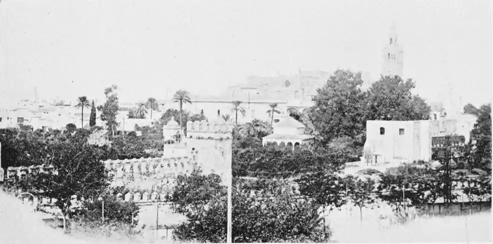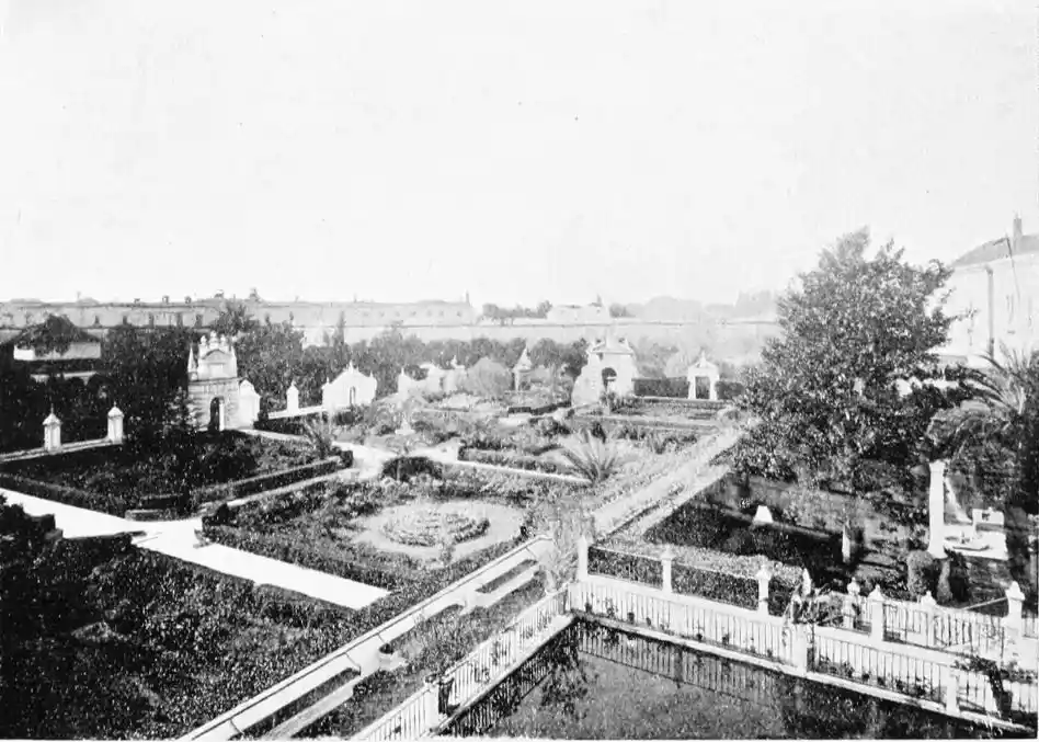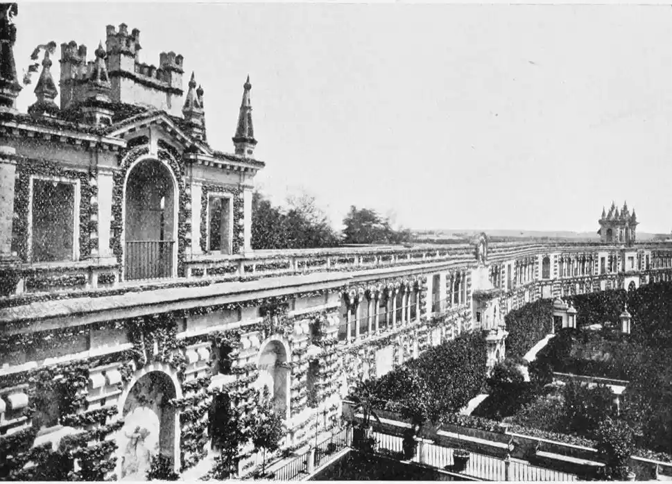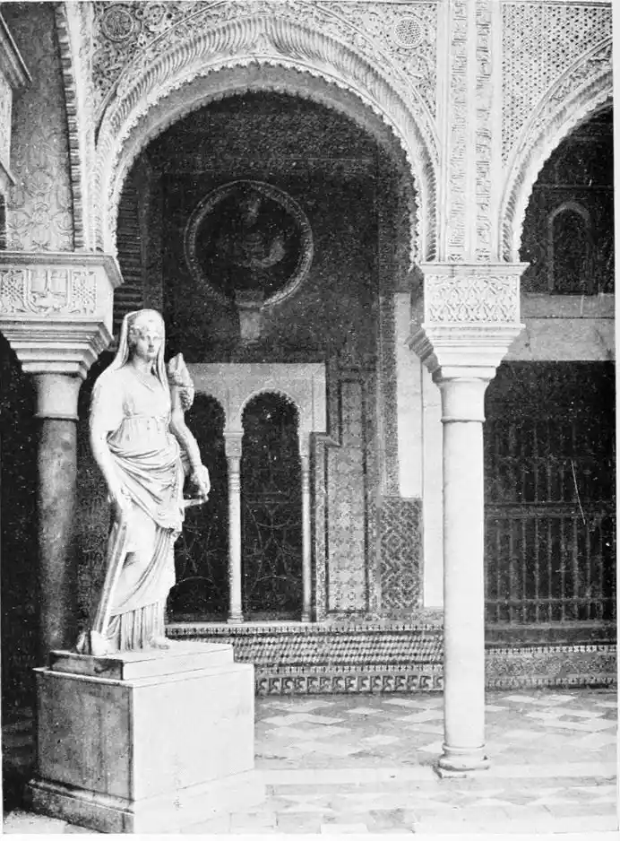In spite of the severe strictures of fastidious observers, the Alcazar produces a very pleasing impression on northern visitors. Mr W. M. Gallichan writes: “It is a palace of dreams, encircled by lovely perfumed gardens. Its courts and salons are redolent of Moorish days and haunted by the spirits of turbaned sheiks, philo{47}sophers, minstrels, and dark-eyed beauties of the harem.... The nightingales still sing among the odorous orange bloom, and in the tangles of roses birds still build their nests. Fountains tinkle beneath gently moving palms; the savour of orientalism clings to the spot. Here wise men discussed in the cool of summer nights, when the moon stood high over the Giralda and white beams fell through the spreading boughs of the lemon trees, and shivered upon the tiled pavements.
