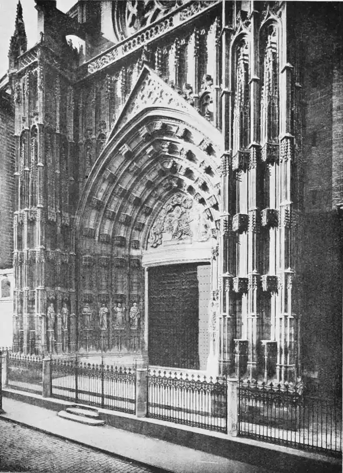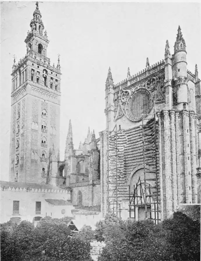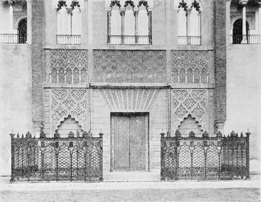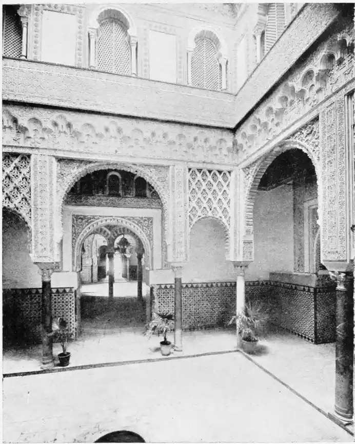 The reign of the Almohades is the most interesting period in the history of the city. It was marked by the foundation of Seville’s most important existing edifices, and by the introduction of a new style of architecture. Hitherto, what is loosely called Moorish art, had been native Andalusian art, following Saracenic or Syrian ideals. Of this first period, the Mezquita at Cordova is the finest monument. Seville is peculiarly the city of the second, or true, Moorish period. Byzantine and Oriental influences disappeared and were supplanted by the African or, more properly, Berber, character. The new conquerors of Andalusia were a rude, hardy race, and we find something virile and coarse in their architecture. “Beside the Giralda of Seville,” remarks Herr Karl Eugen Schmidt, “the columns of the mosque of Cordova seem small; the pretty halls of the Alhambra have something weak and feminine.” The weakness of the Almohade builders, as is usually the case with imperfectly civilised peoples, lay in an excessive fondness for ornamentation. Señor de Madrazo’s criticism, though severe, is, on the whole, just. While admitting the beauty of certain of their innovations, such as the stalac{18}tited dome (afterwards carried out with so much effect at Granada) and the pointed arch, he goes on to say, “The Almohade architecture displays that debased taste which is imitative rather than instinctive, and which creates only by exaggerating forms to a degree inconsistent with the design—differing from the Mudejar work of the thirteenth to the fifteenth centuries, which reveals an instinctive feeling for the beautiful in ornament, which never loses sight of the graceful, the elegant, and the bold, and which consequently never betrays any aberration. The Almohade style, in short, at once manifests the vigour of the barbarian civilised by conquest; the Mudejar style has the enduring character of the works of a man of taste, wise in good and evil fortune; both are the faithful expression of the culture of peoples of different origins and aptitudes.” Elsewhere the same authority observes, “It is certain that the innovation characteristic of Musulman architecture in Spain in the eleventh and twelfth centuries, cannot be explained as a natural mutation from the Arabic art of the Khalifate, or as a prelude to the art of Granada, because there is very little similarity between the style called secondary or Moorish and the Arab-Byzantine and Andalusian; while, on the other hand, it is evident{19} that the Saracenic monuments of Fez and Morocco, of the reigns of Yusuf Ben Tashfin, Abdul Ben Ali, Al Mansûr, and Nasr, partake of the character of the ornamentation introduced by the Almohades into Spain.”