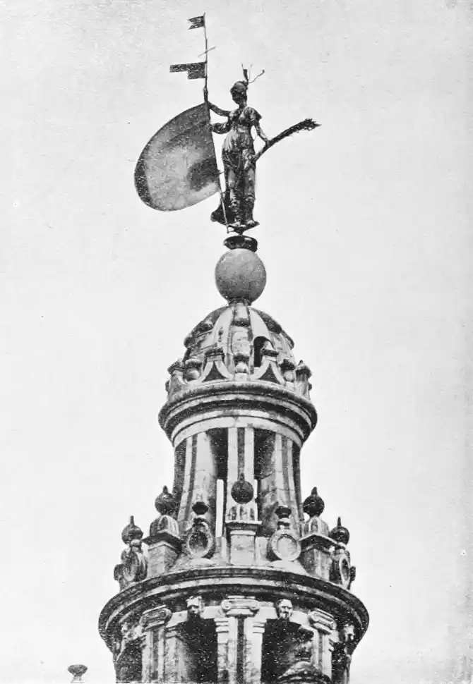 The upper or newer part of the Giralda was built by Fernando Ruiz in 1568. Despite its Doric and Ionic columns and Renaissance style, it does not mar the beauty and harmony of the whole building, and is itself a remarkably graceful work. The entablature of the second stage or storey bears the words Turris fortissima Nomen Domini. The whole fabric is surmounted by the bronze statue of Faith, executed by Bartolomé Morel in 1568. It stands fourteen feet high, and weighs twenty-five hundredweights, yet so wonderful is the workmanship that it turns with every breath of the wind. Hence the name applied to the whole tower—Giralda—from que gira, “which turns.” The figure wears a Roman helmet. The right hand clasps the labarum of Constantine, and the left a palm branch symbolical of victory.