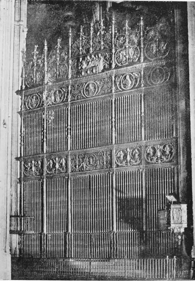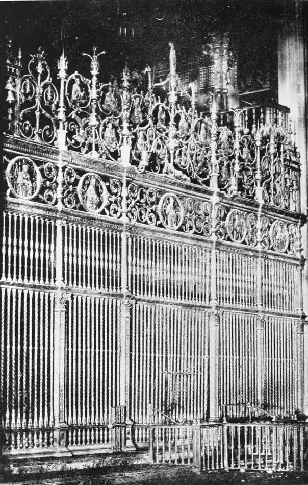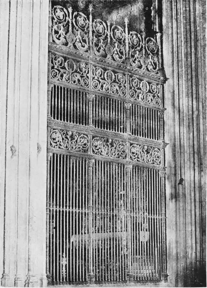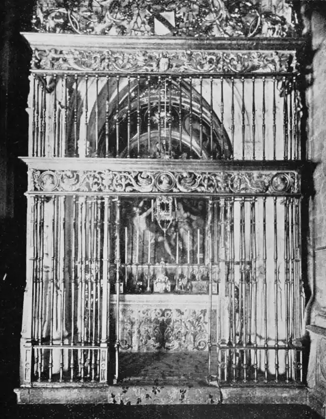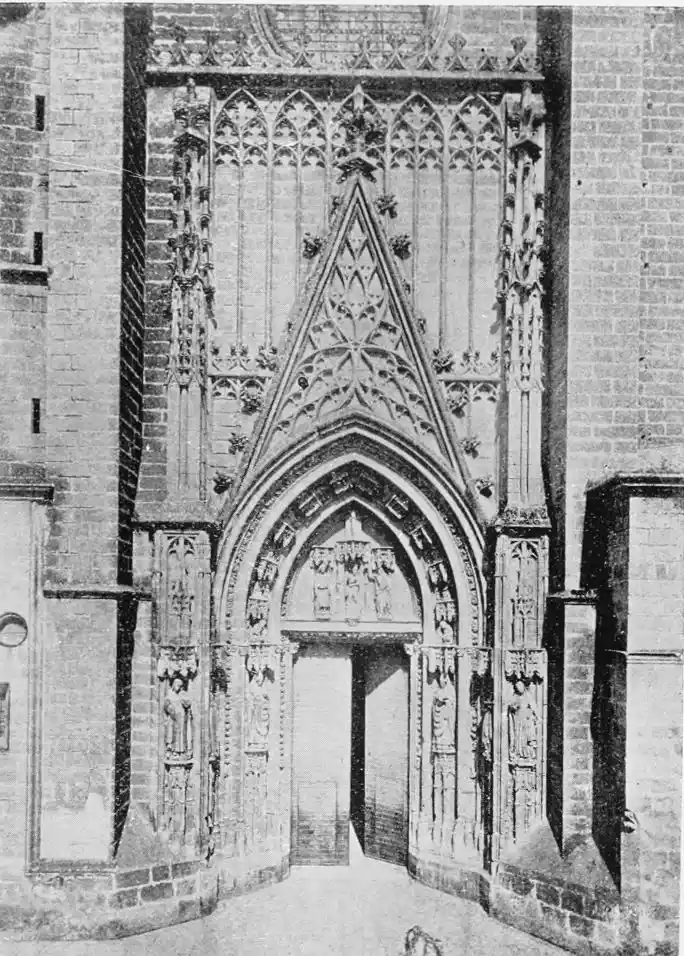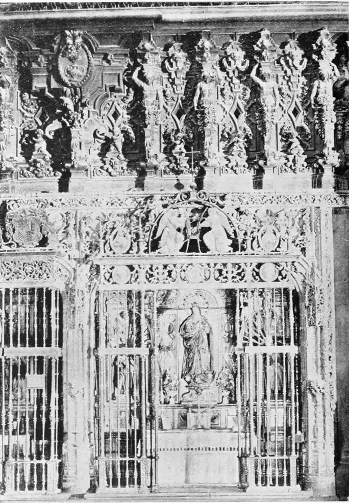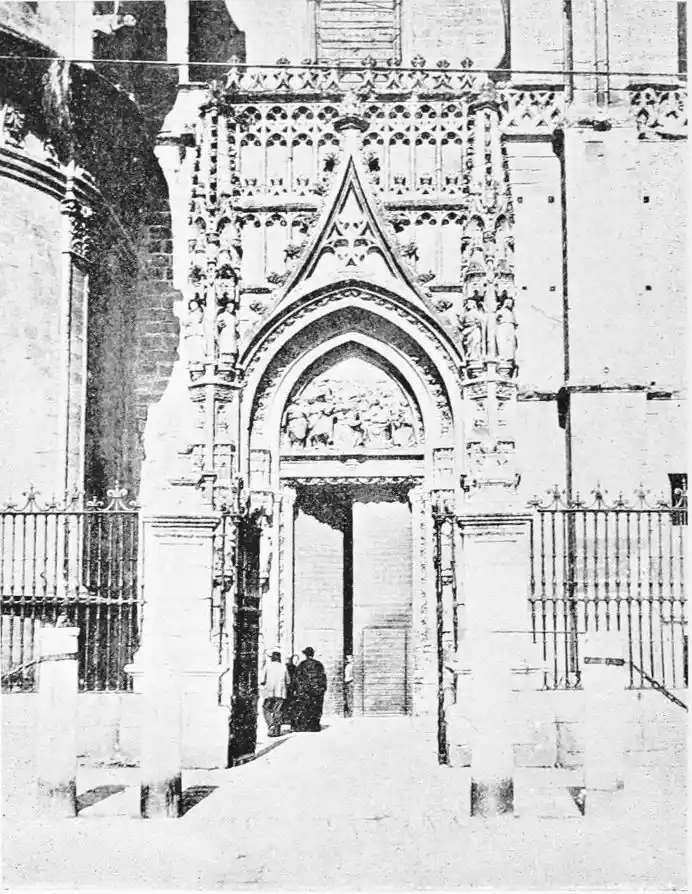 The Archiepiscopal Palace, adjacent to the Cathedral, is also in the bad style of the later seventeenth century. The interior, however, is worth visiting for the sake of the noble marble staircase, one of the finest in the city. Here are three paintings by Alejo Fernandez, an early seventeenth-century artist, whom Lord Leighton considered “the most conspicuous among the Gothic painters.”