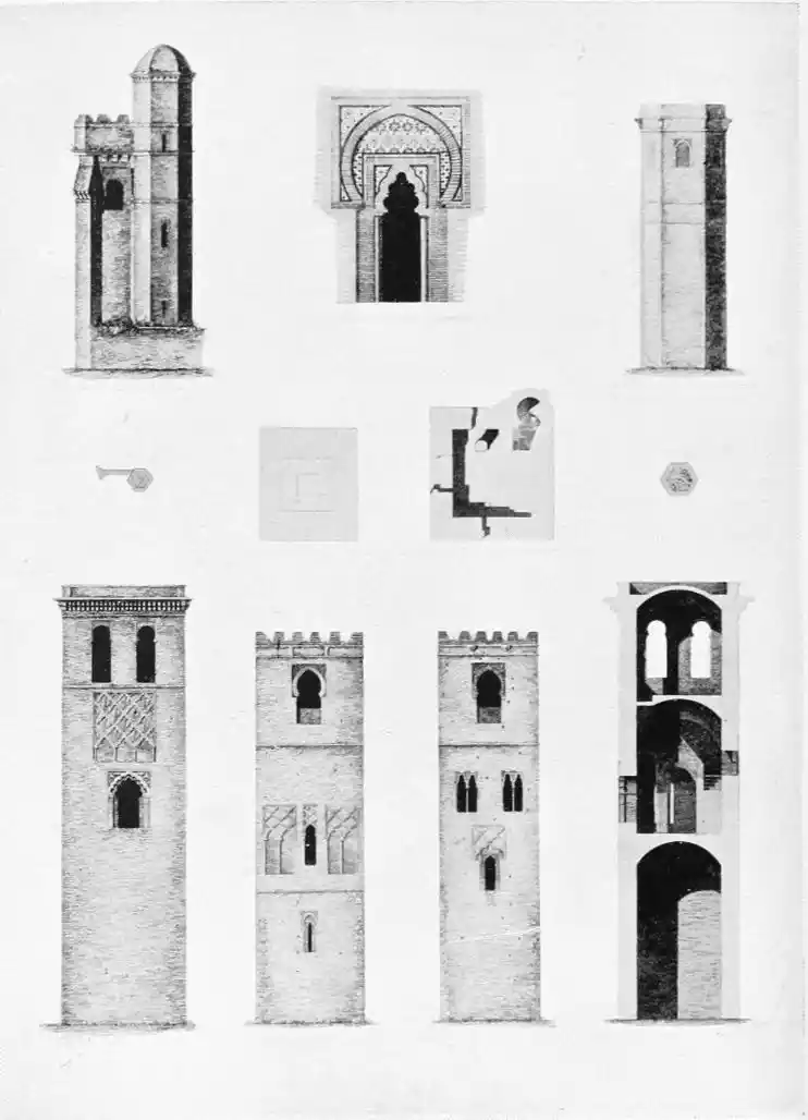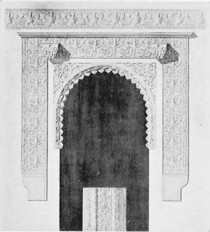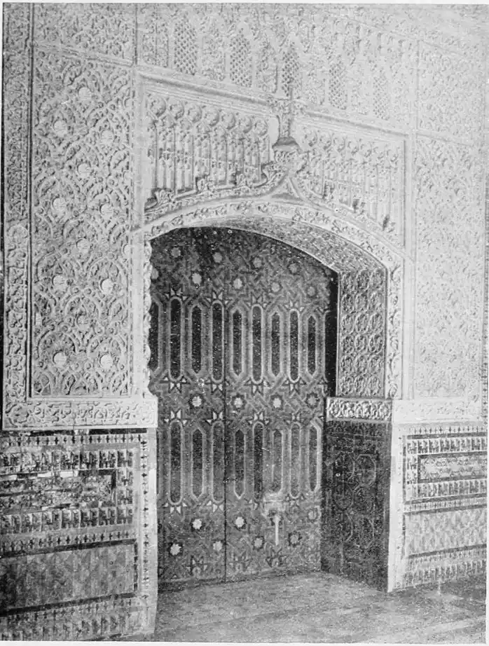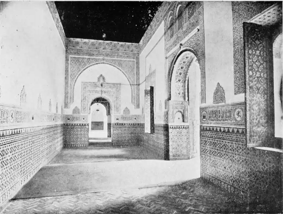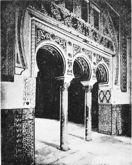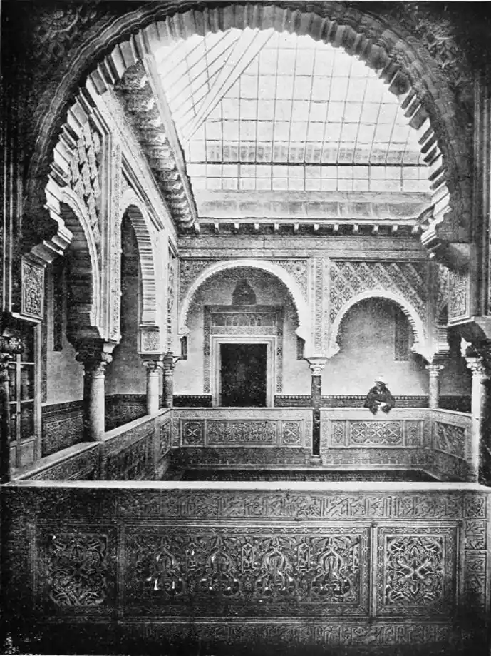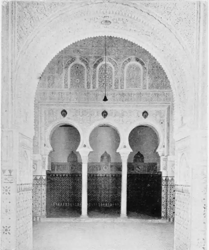 The most important example of this style is the Giralda, now adjacent to the magnificent Christian cathedral which was reared in later days on the foundations of the great mosque. Señor de Madrazo has reconstructed for us the general form and aspect of the finest monument of Almohade piety. The mosque replaced that which had been destroyed by the Normans, and appears to have embodied some part of the original structure, to judge from the horseshoe arches still to be seen in the Claustro de la Granada. The work was begun by order of Yusuf, the son of Abd-er-Rahman, the founder of the dynasty. The mosque formed a rectangle, extending from north to south, and surrounded by cloisters and courtyards. The interior was divided into longitudinal naves by a series of marble columns, which supported an adorned ceiling of carved and painted wood. The mihrab, or sanctuary, would have been at the southern extremity, after the Syrian custom, it taking the Spanish Muslims some time to realise that Mecca lay east rather than{20} south of Andalusia. The mosque would also have contained a maksurrah, or vestibule, for the imam and his officials, the nimbar, or pulpit, for the sovereign, and the tribune for the preacher. In the northern court was the existing fountain for ablutions, surmounted by a cupola, and surrounded by orange and palm-trees. The eastern court was known as the Court of the Elms. In all probability, attached to the sacred edifice, was the turbeh, or tomb of the founder.