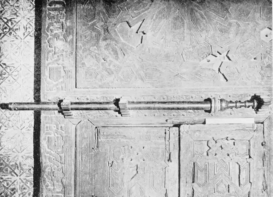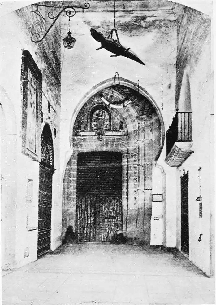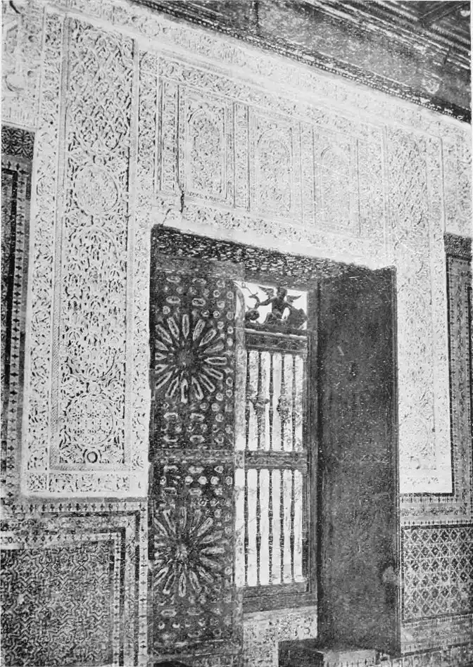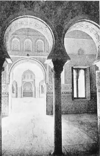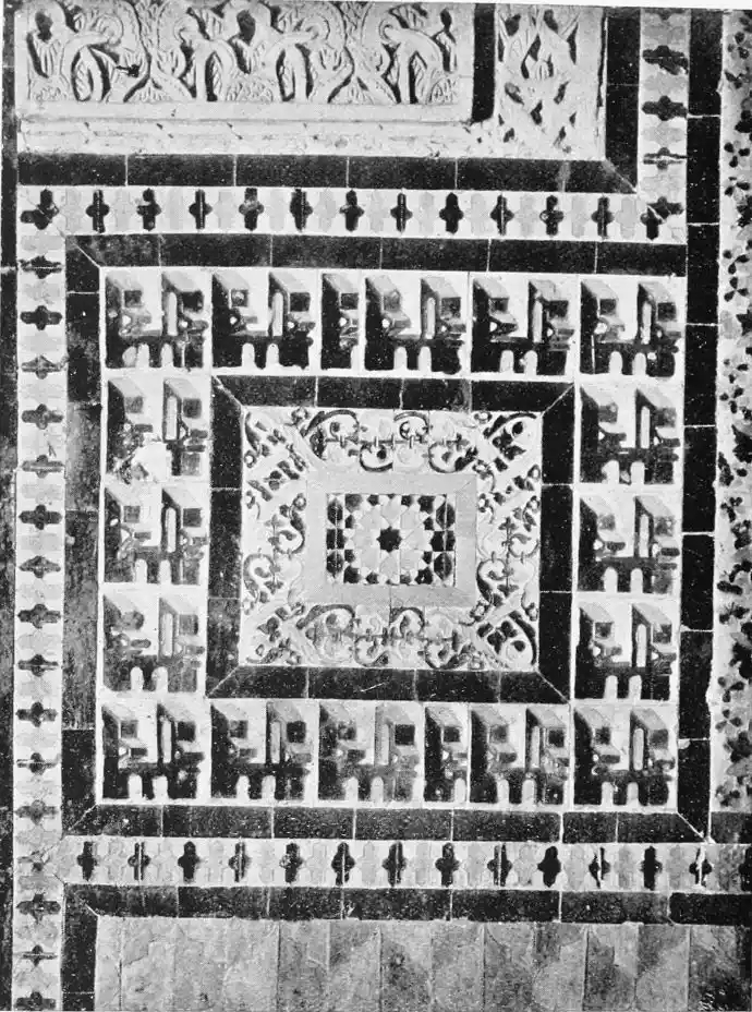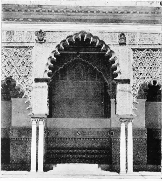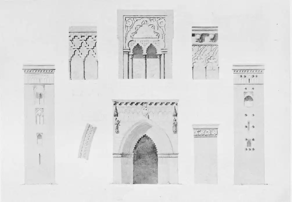 The most important example of this style is the Giralda, now adjacent to the magnificent Christian cathedral which was reared in later days on the foundations of the great mosque. Señor de Madrazo has reconstructed for us the general form and aspect of the finest monument of Almohade piety. The mosque replaced that which had been destroyed by the Normans, and appears to have embodied some part of the original structure, to judge from the horseshoe arches still to be seen in the Claustro de la Granada. The work was begun by order of Yusuf, the son of Abd-er-Rahman, the founder of the dynasty. The mosque formed a rectangle, extending from north to south, and surrounded by cloisters and courtyards. The interior was divided into longitudinal naves by a series of marble columns, which supported an adorned ceiling of carved and painted wood. The mihrab, or sanctuary, would have been at the southern extremity, after the Syrian custom, it taking the Spanish Muslims some time to realise that Mecca lay east rather than{20} south of Andalusia. The mosque would also have contained a maksurrah, or vestibule, for the imam and his officials, the nimbar, or pulpit, for the sovereign, and the tribune for the preacher. In the northern court was the existing fountain for ablutions, surmounted by a cupola, and surrounded by orange and palm-trees. The eastern court was known as the Court of the Elms. In all probability, attached to the sacred edifice, was the turbeh, or tomb of the founder.
