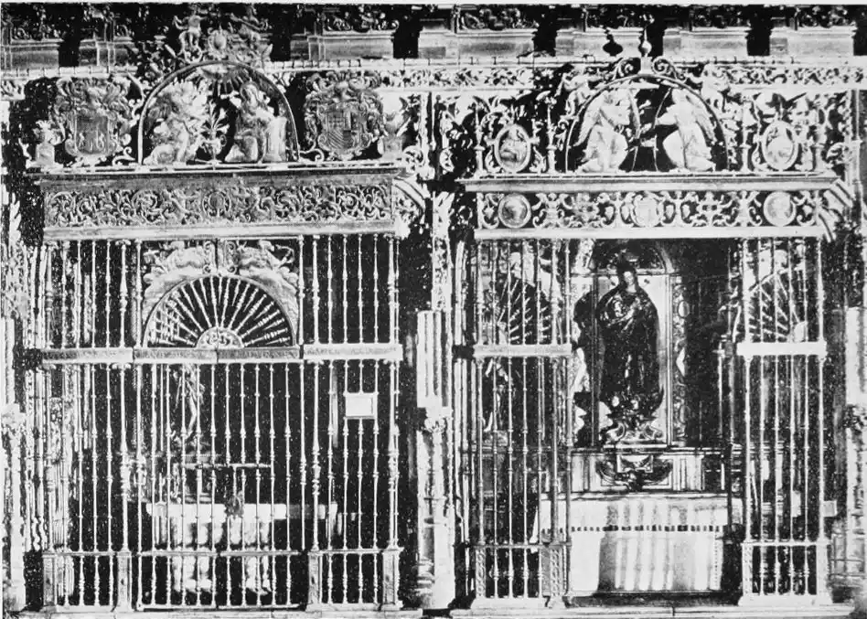 The royal chapel occupied the centre of the eastern wall; the other chapels were: San Pedro, Santiago, Santa Barbara, San Bernardo, San Sebastian (in this chapel were buried some Moors of the blood royal who had been baptised and had served King Ferdinand, among them being Don Fernando Abdelmon, son of Abu Seyt, Amir of Baeza), San Ildefonso, San Francisco, San Andrés, San Clemente, San Felipe, San Mateo (containing the sepulchre of the Admiral of Castile, Don Juan de Luna), Don Alonso Perez de Guzman, San Miguel, San Marcos, San Lucas, San Bernabe, San Simon, and San Judas, and the Magdalena. In the last-named chapel were buried the knights who had taken part in the capture of the city. Attached to it was the altar of Nuestra Señora de Pilar, a reputedly miraculous shrine which became the objective of pilgrims in after years.