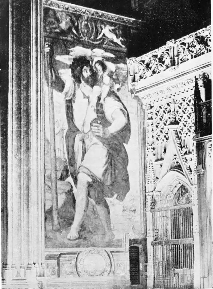 But, in the fifteenth century, a new spirit came into art; and with the work of Juan Sánchez de Castro the school of Seville may be said to begin. No knowledge has come down to us of his life; we know only that he was painting in Seville between 1454 and 1516. In his great fresco of “San Cristóbal,” that covers the wall near to the main door in the old Church of San Julian—alas! now spoiled by re-painting and by the subsequent rotting away of the plaster—we find a different, human, almost playful treatment of a sacred story. And for the first time in Seville, {114}we see the special Spanish quality, characteristic of the whole school from this time to the time of Goya, of rendering a scene just as the painter supposed it might have happened. “A child’s dream of a picture,” Mr Arthur Symons has called it. San Cristóbal, many times the size of life, stretching from floor to ceiling, fills the whole picture; he leans upon a pine-staff as he supports the Child Christ upon his shoulders, who holds in his hands a globe of the world upon which the shadow of a cross has fallen. The other figures, the hermit and two pilgrims with staves and cloaks, are quite small; they reach just to the Saint’s knees. And this immense grotesque figure is painted in all seriousness, as a child might picture such a scene. To understand the sincerity of the Spanish painter, we must compare his work with that other fresco of “San Cristóbal,” painted, much later, by Perez de Alesio, which is in the Cathedral. The Italian picture is an attempt to illustrate a popular miracle, perfectly unconvincing; De Castro’s Saint compels us to accept and realise what the painter himself believed in. This is the difference between them.