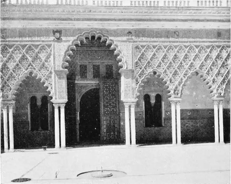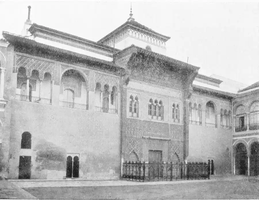 The Alcazar, as we have said, at the time of the reconquest covered a much larger space than at present; and its area was even greater in the days of Pedro I. Its strength as a fortress may be gauged by a glance at the remaining walls, adjacent to the principal entrance. In the Plaza de Santo Tomas is an octagonal, one-storeyed tower, called the Torre de Abdalasis, which once formed part of the building, and is said to have been the spot on which St Ferdinand hoisted his flag on the fall of Seville. To enter the palace we pass across the Plaza del Triunfo and enter the Patio de las Banderas, so called either because a flag was hoisted here when the royal family were in residence or on account of the trophy displayed over one of the arches, composed of the Arms of Spain with supporting flags. From this court a colonnade called the Apeadero leads to the Patio de la Monteria. It was built, as an inscription over the portal records, by Philip III. in 1607, and restored and devoted to the purposes of an armoury by the fifth sovereign of that name in 1729. The Patio de la Monteria derives its name from the Royal Lifeguards, the Monteros de Espinosa, having their quarters here. These courts, with the commonplace private houses which surround them, occupy the site of the old Moorish palace of the Almo{49}hades. Some of the houses exhibit vestiges of fine Musulman work. The house No. 3 of the Patio de las Banderas formed part, in the opinion of Gestoso y Perez, of the Stucco Palace (Palacio del Yeso) mentioned by Ayala as having been built by Pedro I. That potentate, it is worthy of remark, was accustomed to administer justice, tempered with ferocity, after the oriental fashion, seated on a stone bench in a corner of this patio. The room in which the Almohade governors presided over their tribunals still exists. It is surrounded by houses, and is entered from the Patio de la Monteria. Contreras sees in this hall (the Sala de Justicia) the traces of a work anterior to the ninth century. It was, however, restored by Pedro. It is square, and measures nine metres across. The ceiling is of stucco and adorned with stars, wreaths, and a painted frieze. Inscriptions in beautiful Cufic characters constitute the principal decoration of the apartment. Round the four walls runs a tastefully worked stucco frieze, interrupted by several right-angled apertures. These were once covered, in the opinion of Herr Schmidt, by screens of plaster, which kept out the sun’s heat but admitted the light; or, according to Gestoso y Perez, by tapestries “which must have made the hall appear a miracle of wealth and{50} splendour.” Thanks to its isolation, the Sala de Justicia escaped the “restoration” effected in the middle of the nineteenth century by order of the Duc de Montpensier.