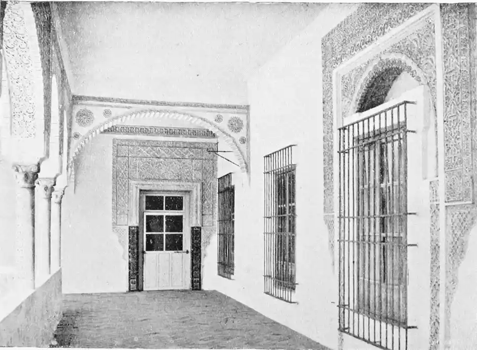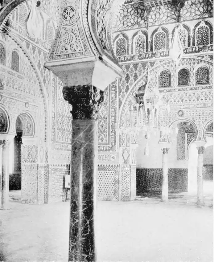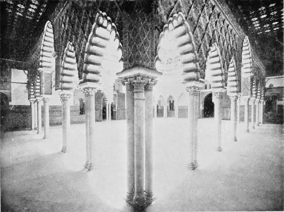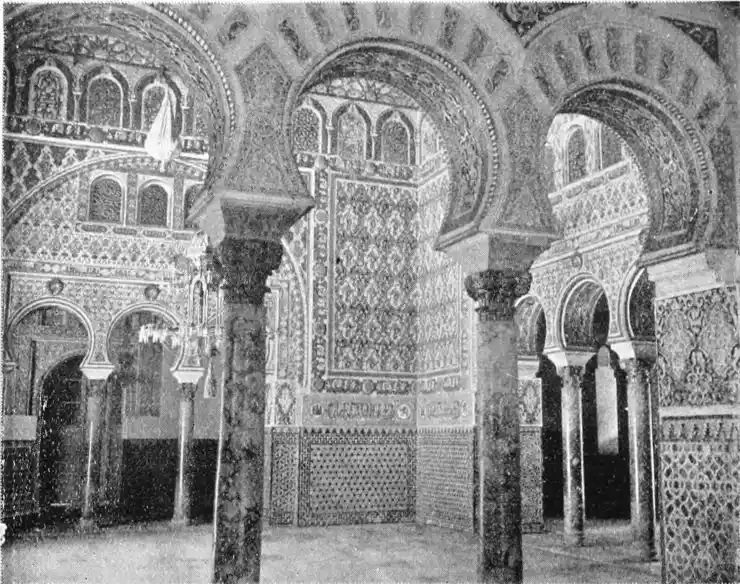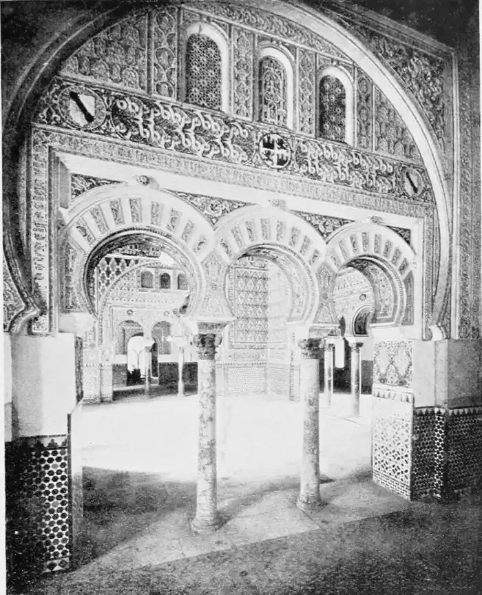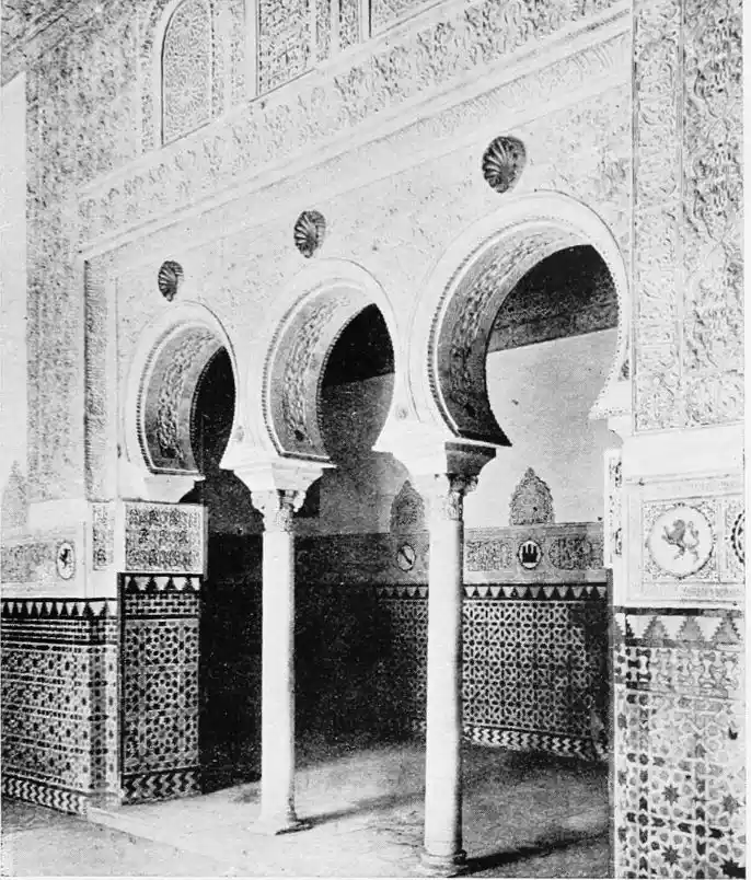 The Abbadite sovereigns have left but few traces on the city which they did so much to{14} embellish and improve. To them, however, may be ascribed the foundation of the Alcazar. Such at least is the opinion of Señor de Madrazo. In the horseshoe arches of the Salón de los Embajadores with their rich Corinthian capitals—on which the names of different Khalifas are inscribed—we detect a resemblance to the mosque of Cordova, and recognise the early Saracenic style, unaffected by African, or properly Moorish, influence. To the same period and school of architecture, Señor de Madrazo attributes the ornate arcading of the narrow staircase leading from the entrance court to near the balcony of the chapel; and the three arches with capitals in the abandoned apartment adjoining the Salón de los Principes. The ultra-semicircular curve of the arch occurs very rarely in later or true Moorish architecture.