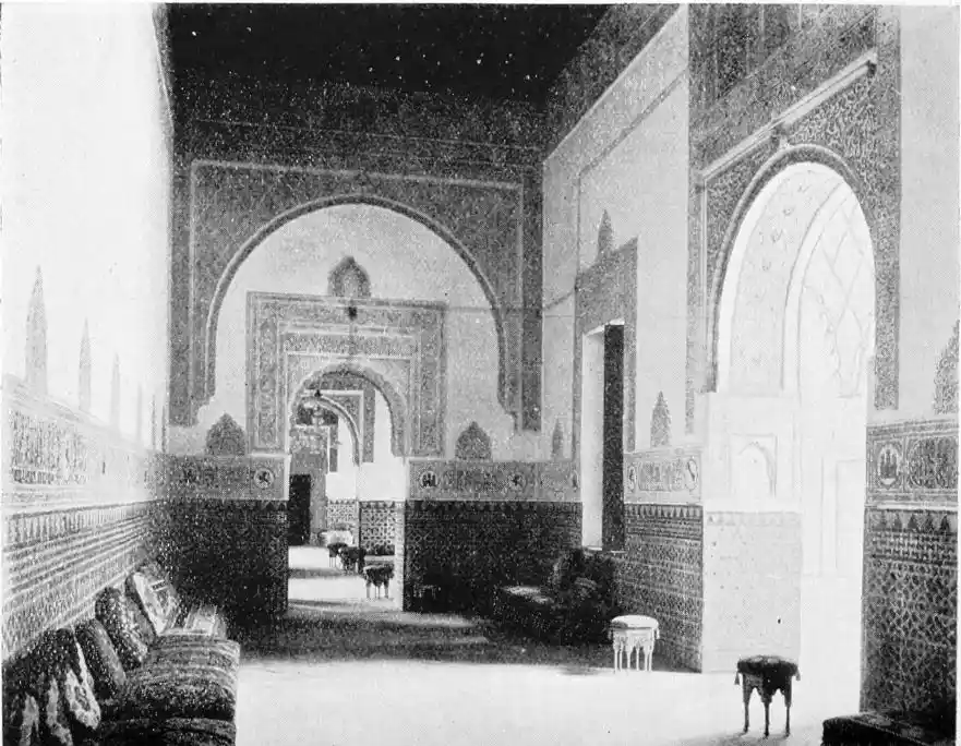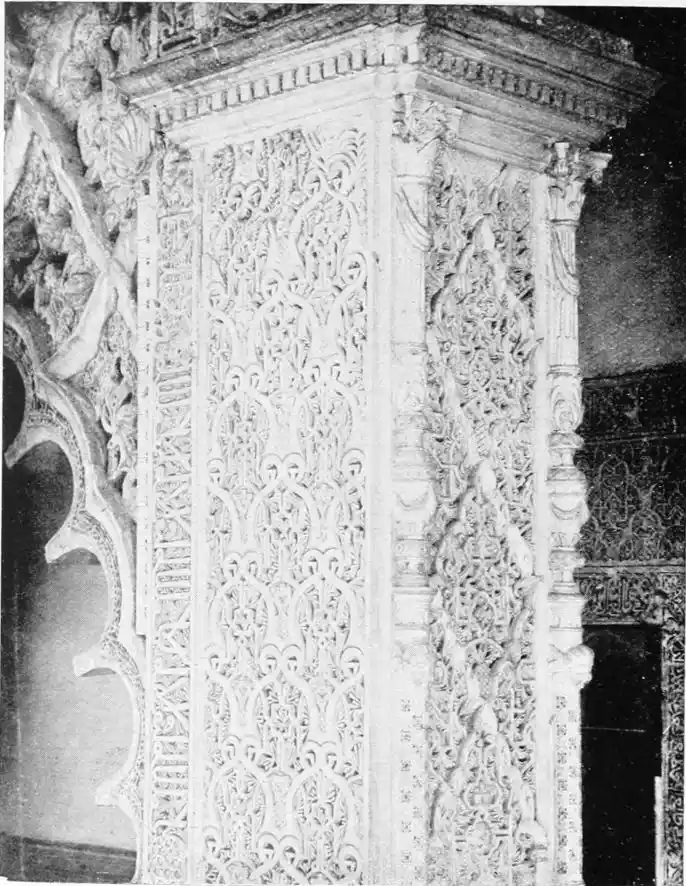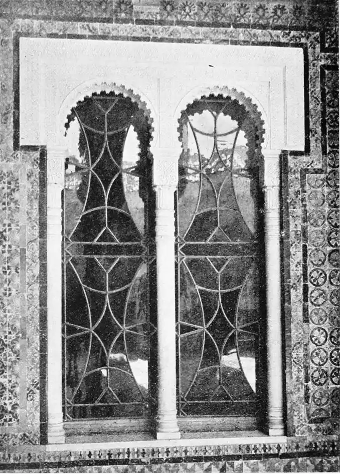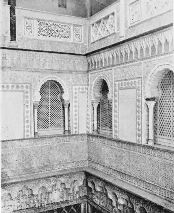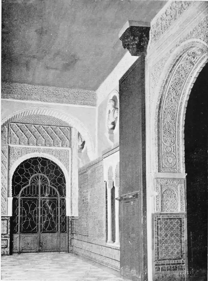 The Abbadite sovereigns have left but few traces on the city which they did so much to{14} embellish and improve. To them, however, may be ascribed the foundation of the Alcazar. Such at least is the opinion of Señor de Madrazo. In the horseshoe arches of the Salón de los Embajadores with their rich Corinthian capitals—on which the names of different Khalifas are inscribed—we detect a resemblance to the mosque of Cordova, and recognise the early Saracenic style, unaffected by African, or properly Moorish, influence. To the same period and school of architecture, Señor de Madrazo attributes the ornate arcading of the narrow staircase leading from the entrance court to near the balcony of the chapel; and the three arches with capitals in the abandoned apartment adjoining the Salón de los Principes. The ultra-semicircular curve of the arch occurs very rarely in later or true Moorish architecture.