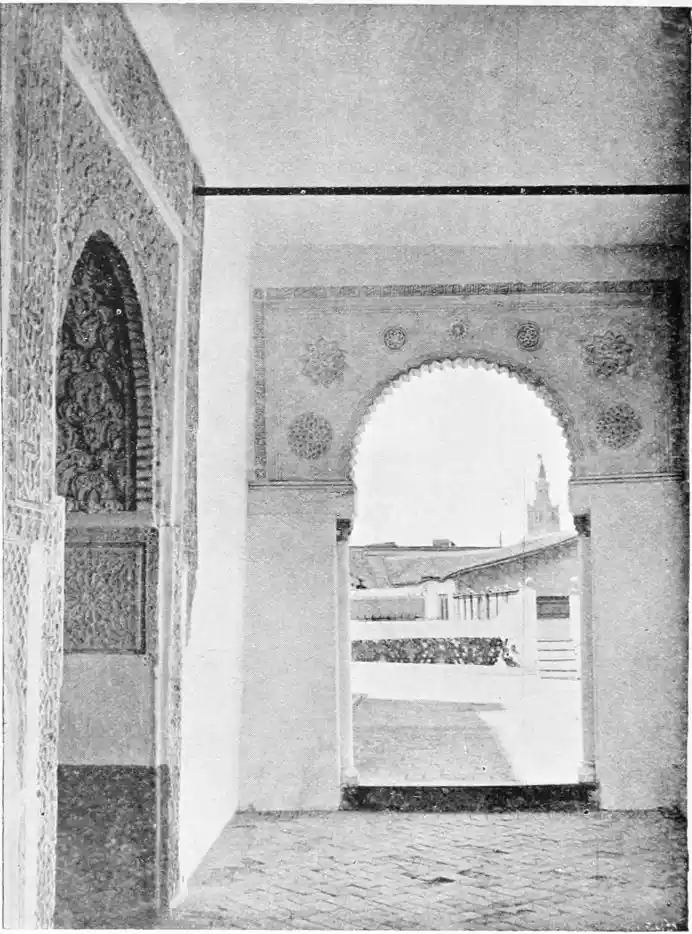 The seat of government was transferred, soon after the murder of the son of Musa, to Cordova, and Seville sank for a time to a subsidiary rank. The various cities of Andalusia were allotted by the governor Abdelmelic among the different Syrian peoples who had flocked over on the news of the conquest; and Ishbiliyah, according to Señor de Madrazo, was assigned to the citizens of Horns, the classic Emesa. Owing to intermarriage between the conquerors and the natives, the distinction between the Moslems according to the places of origin of these early settlers was soon lost in that drawn between the pure-blooded Arabs{7} and the Muwallads or half-breeds. In the meantime the germs of Arabian culture had fallen upon a kindly soil, and a new school of art and letters was in process of formation in Spain. The imposing monuments of Roman, Greek, and Byzantine civilisation, which the victorious hosts of Islam found ever in their path, were not without influence upon their conceptions of the beautiful in form. The fusion of the Hispano-Goths and Arabs likewise tended to produce a commingling of spirit, and ultimately to give birth to an art and a culture racy of the soil. “According to all contemporary writers,” says Señor Rafael Contreras, “it is beyond all doubt that the style which the artists of the Renaissance called Moorish (in the sense of originating in Northern Africa) was never anything of the sort. The details so much admired on account of their richness, the vaultings and the arched hollows practised in the walls, the festoons of the arches, the commarajias and alicates, were Spanish works finer and more delicate than those of the East. The root was originally in Arabia, but it was happily transplanted to Spain, where blossomed that beautiful flower which diffuses its perfume after a lapse of seven centuries.”