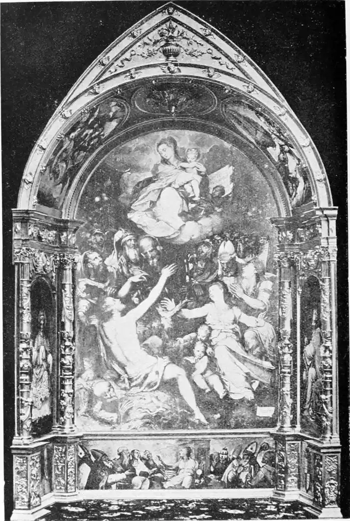 Go to the suburb of Triana, and in the Church of Santa Ana there is the sweetest Madonna and Child, in which we find a new suggestion in the joy of the Mother in her Babe, a human attitude, making the picture something more than mere illustration. And we notice a delicate care for beauty found very rarely in Seville, perhaps never as perfectly as in the work of this painter. The “Virgen de la Rosa” is the name given to the picture. The Mother sits enthroned under a canopy of gold, in a beautiful robe of elaborate pattern, pale gold on brown. She holds a white rose out to her Child. Typical of Fernandez is this fortunate use of the flower; typical, too, of his new mood of invention is the small{117} landscape of rocky and wooded country that fills the distance. The gracious pose of the Virgin, the beauty in the Child, show an advance in ease upon earlier pictures. But the other figures, four angels who guard the Mother, all posed a little awkwardly, suggest a scheme on whose design the early Byzantine models may have had a forming influence, though the result is different enough. For Fernandez understood the very spirit of the Renaissance; he saw life beautifully and strongly. The attraction of the picture is in its effect of joy, in the charming way in which it forms a pattern of beautiful colour, and in its new sense of humanity that carries us beyond the scene itself.