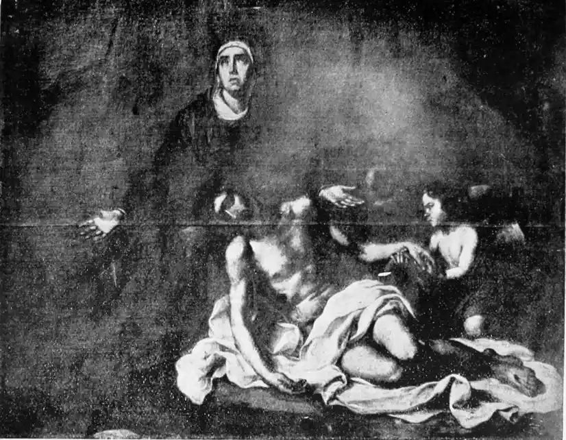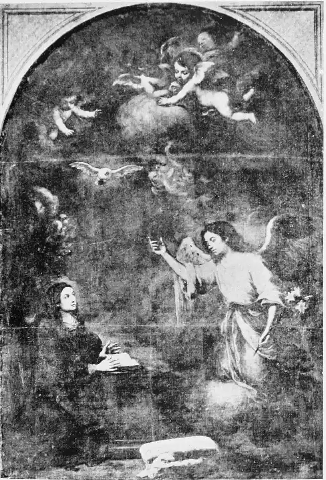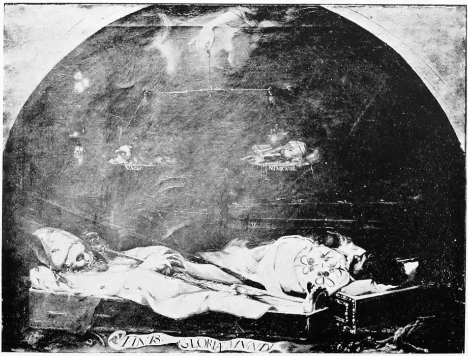 As a museum of Spanish art, La Caridad possesses great importance. The altarpiece, “The Descent from the Cross,” is the masterpiece of Pedro Roldan. The two paintings near the entrance by Juan de Valdés Leal (1630-1691) are regarded by Herr Schmidt as entitling that artist to rank as one of the greatest masters of realism of any age. This opinion is not shared by a recent writer (C. Gasquoine Hartley), who considers the pictures theatrical, though the exe{104}cution exhibits a certain power. “In one of them a hand holds a pair of scales, in which the sins of the world—represented by bats, peacocks, serpents, and other objects—are weighed against the emblems of Christ’s Passion; in the other, which is the finer composition, Death, with a coffin under one arm, is about to extinguish a taper, which lights a table spread with crowns, jewels, and all the gewgaws of earthly pomp. The words ‘In Ictu Oculi’ circle the gleaming light of the taper, while upon the ground rests an open coffin, dimly revealing the corpse within.” Murillo said this picture had to be looked at with the nostrils closed. For the two paintings Valdés received 5740 reals.