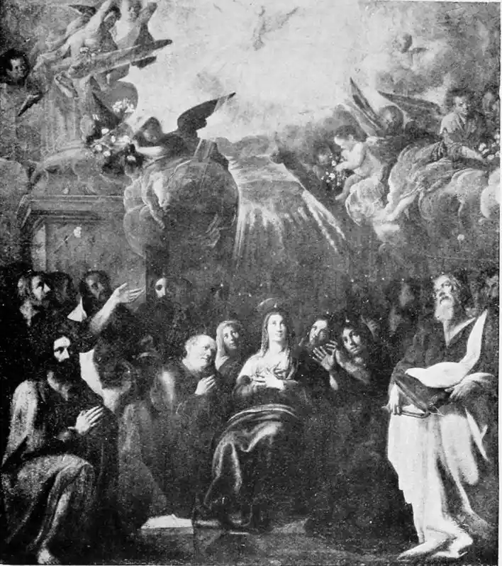And Marmolejo leads us quite naturally to Juan de las Roelas, and in Roelas we have at last a Spanish painter who learnt from Italy something more than mere technical imitation. And in spite{123} of a want of concentration—the accustomed insincerity, the result, it would seem, of a too persistent effort to express his art in the art of Venice, in which city he is thought to have painted, perhaps in the studio of some follower of Titian, he does realise his scenes with something of the old intensity. Roelas anticipates Murillo, not altogether unworthily, giving us, with less originality, but with much sweetness, an expression of that mood of religious sensuousness that is one phase of Spanish painting. Seville is the single home of Roelas;[A] here we may see his pictures in the Cathedral, in the Museum, and in many of the churches. His art is unequal in its merit. In his large compositions often there is confusion—“Santiago destroying the Moors at the Battle of Clavijo,” his picture in the Cathedral, is one instance—spaces are left uncared for, the composition is a little awkward, the brush-work is careless, a fault that is common to much of his work. The “Martyrdom of St Andrew,” in the Museum, is perhaps his most original picture. Here Roelas is a realist. And how expressive of life—Spanish life, are all the powerfully contrasted figures that so{124} truly take their part in the scene depicted. In some of his pictures Roelas gives us the brightest visions. Such is “El Transito de San Isidore,” in the parish church of the saint, a picture in which we see in the treatment of Christ and Mary and the child-angels a manner that seems, indeed, to forestall Murillo; such, too, are the “Apotheosis of San Hermenegildo,” and the “Descent of the Holy Spirit,” both in the church of the Hospital of La Sangre. All three pictures are difficult to see: one is hidden behind the altar, the other two hang at a great height in the church where the light is dim. There are good pictures by Roelas in the University, a “Holy Child,” the “Adoration of the Kings,” and the “Presentation of the Child Christ in the Temple”; and in this last picture, with its soft colour and human gaiety, again we are reminded of Murillo. But a work of perhaps more interest, certainly of more strength, is “St Peter freed from Prison by the Angel,” which is hidden in a side-chapel in the Church of San Pedro. Then, how quiet, with a repose uncommon enough in Spain, is his “Virgin and Santa Ana,” in the Museo de la Merced. The figures—the girl Virgin, her mother, and the angels who crowd the space above them—all have the fairness Roelas gives to women; the soft glow of their flesh is beautiful.{125} Look at the cat and dog that play so naturally in the foreground, beside a work-basket, and what a happy “note” is given by the open drawer, which shows the linen and lace within. Certainly this picture is more Italian than Spanish.