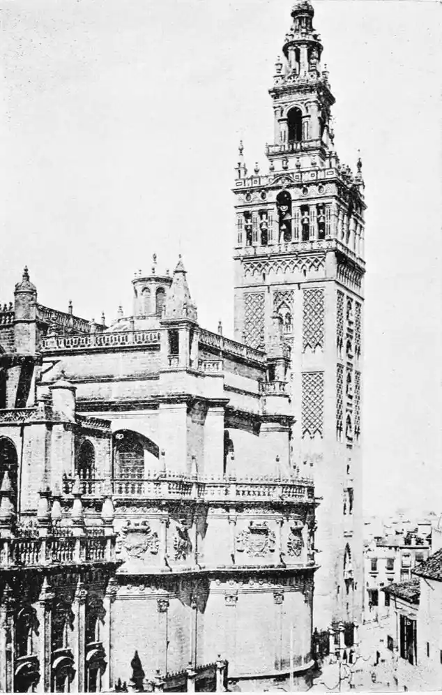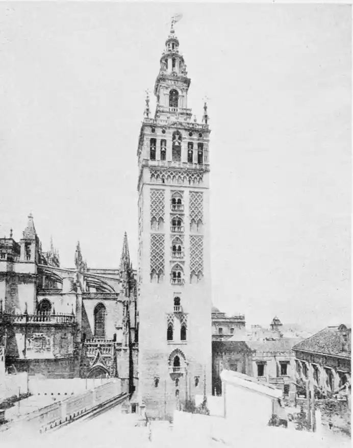The Giralda is not only the most important and famous of minarets, but is among the three or four most remarkable towers in the world. It is more to Seville than Giotto’s campanile to Florence; it rivals in fame the now vanished campanile of St Mark’s. Unlike similar edifices in Egypt and Syria, minarets among the western Moslems were built strong and massive, rather than slender and elegant. The Giralda,” says Herr Schmidt, “is one of the strongest buildings in the world, and few of our Christian church towers could have withstood so successfully the lightning and the earthquake.”