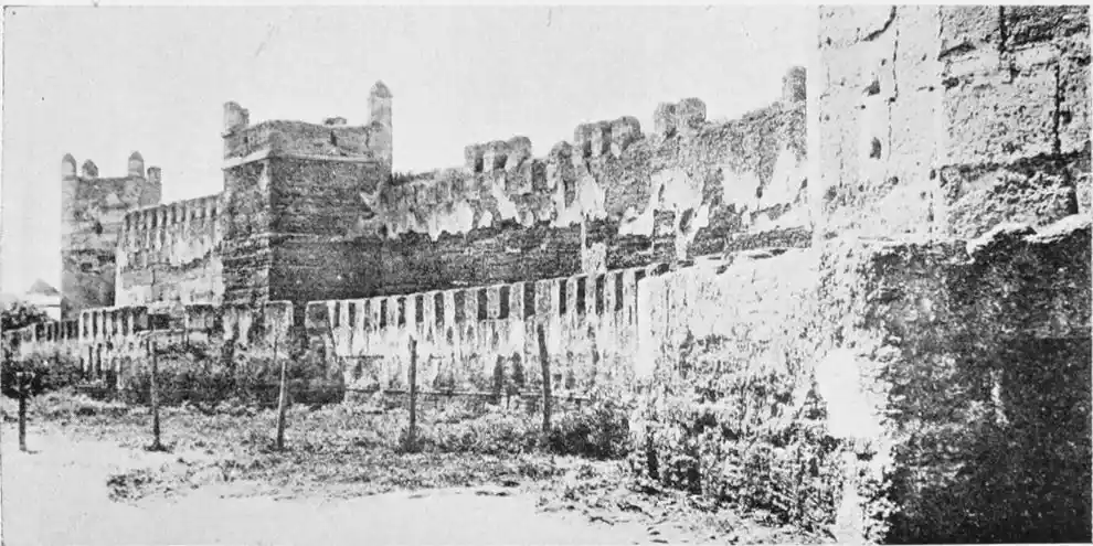 The Alcazar, the palace inhabited by this dilettante amir and his successors of the race of Abbad, continued to be the principal residence of the subsequent rulers of Ishbiliyah, both Almoravides and Almohades. There can be no doubt that the latter restored and reconstructed the building to an extent that almost effaced the work of the founders. But the impress of the Berber architects was in its turn almost entirely lost when{30} the fabric came into the possession of the Christians. Thus the Alcazar cannot be rightly classed among the monuments of the Almohade period. It is certain that its extent at this time was greater than it is now. Its enclosure was bounded by the city wall, which ran down to the river, and occupied the whole angle formed by the two. The Alcazar was then primarily a fortress, and its walls were flanked on every side by watch-towers such as those with which its front is still furnished. The principal entrance seems to have been at the Torre de la Plata (silver tower), which was standing as late as 1821. Finally, among the works of the last Musulman rulers of Seville, we must not omit to mention the great aqueduct of four hundred and ten arches, called the Caños de Carmona, constructed in 1172, which ensured the city an abundant supply of water from the reservoir of Alcalá de Guadaira. The Almohades had other palaces in the city. The old residence of Abdelasis yet remained, and we hear of the palaces of St Hermenegildo and of the Bib Ragel (or northern gate).