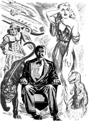 He was in a prehistoric jungle; strange stumpy trees were all around, lush vegetation. A slow-moving beast of immense size was thundering away from him, its tiny head close to the ground snapping up vegetation without cease. Overhead a leather-winged flying reptile moved through the air in jerky swoops.