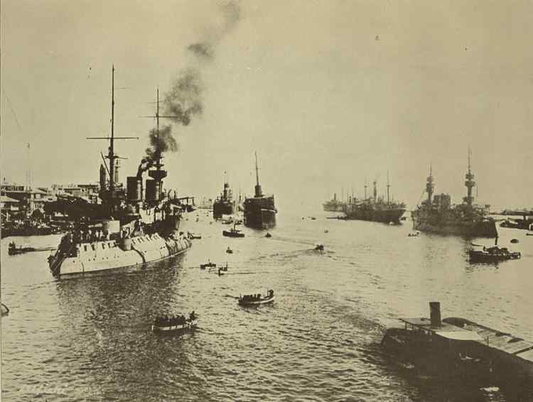 FRENCH MEN-OF-WAR AND AUSTRALIAN TROOPSHIPS IN SUEZ CANAL, PORT SAID.