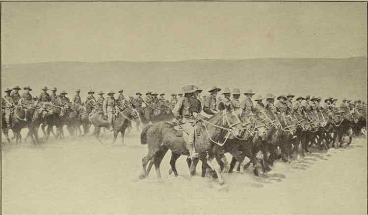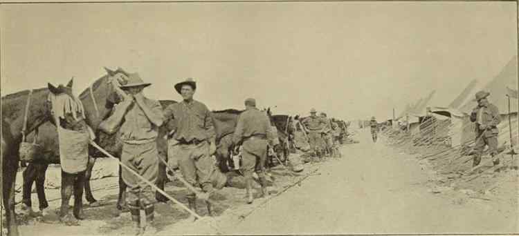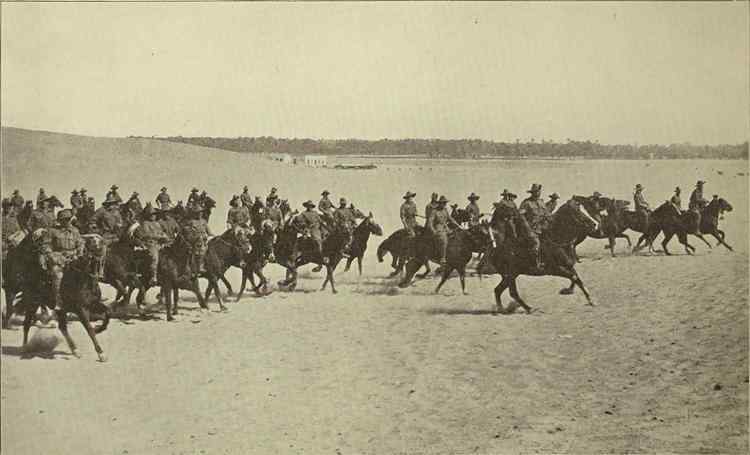 And no sooner was the call made for volunteers for foreign service than they did roll up–they went swarming in thousands to the recruiting stations at Sydney, Melbourne, Adelaide, Brisbane, Hobart, Perth, and other great centres, and in a very short time more than the required number had been enrolled and were rapidly gathered into vast camps at Broadmeadows, at Helena Vale, {9} and elsewhere, and all the States of the Commonwealth were humming with warlike preparations. The militia were called out; Rifle Clubs were formed; the women organised for Red Cross work and to look after the needs of the soldiers and their families; troops slept by their guns in the forts round the coast, for German cruisers were prowling then in the Pacific and the Indian Ocean and there were possibilities of raids and bombardments. Negotiations were opened with the Imperial Government, which readily granted a War Loan of £18,000,000. There was prompt seizure of German and Austrian ships lying in Australian ports; there was a drastic hunting down of German spies and rounding up of alien enemies. Word that war had been declared was received on the morning of the 5th August, and at noon of the same day Australia's first shot was fired from the fort at Point Nepean, when a German cargo steamer, the Pfatz, was held up and captured. The first expeditionary force was raised within two or three days; and before the end of August a second large contingent had been formed and had gone into camp for training, this second contingent including a Light Horse Brigade; and "the Australian Light Horse," as Lord Denman, sometime Governor-General of the Commonwealth, has said, "is the finest Light Horse in the world."