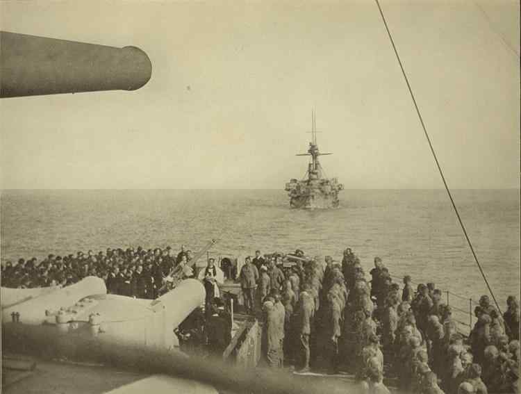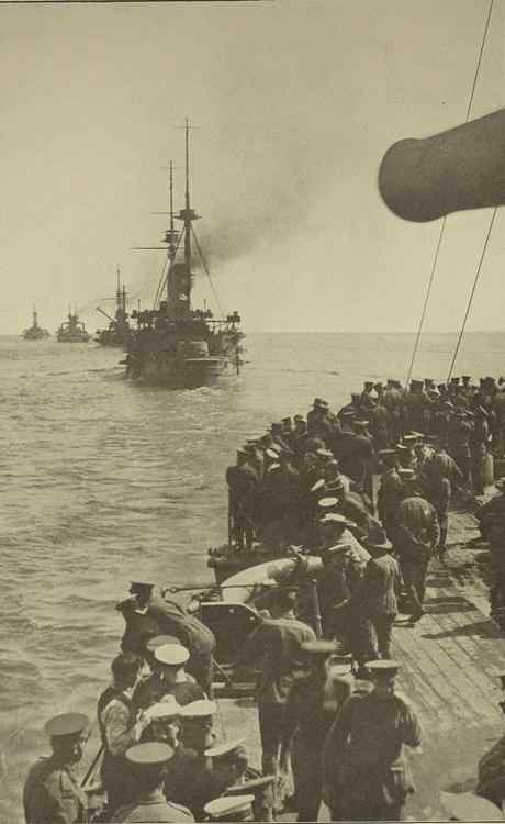 In the afternoon of 23rd April an impressive battle service was held aboard the crowded transports, and soldiers and sailors stood bare-headed and listened reverently whilst the chaplain prayed for them, and that, fighting a clean fight for the rights of humanity, they might be strengthened to go on unflinchingly in the face of every difficulty and danger till their arms were crowned with victory. It was the last consecration of those brave men to the high and perilous duty to which they had given themselves. In the evening of the same day transports carrying the troops who were to make the first landing on Gallipoli, and act as a covering force for the main army, moved out of Mudros Bay, with their {64} convoy of warships, and the rest of the expedition followed in their track–a mighty fleet of nearly a hundred transports in all, guarded on every side by a wonderful array of gunboats, destroyers, swift armoured-cruisers, and stately dreadnoughts, including the mammoth Queen Elizabeth.