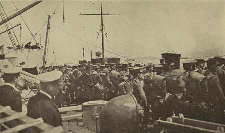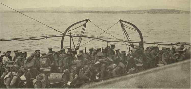 On the morning of the 24th April the transports anchored off Tenedos. The day was occupied in transferring the troops to a number of cutters and smaller war vessels, and at midnight these were taken in tow by certain of the larger ships, and, silently and without lights, moved away through the darkness, stringing out into long, serpentine lines, towards Gallipoli.