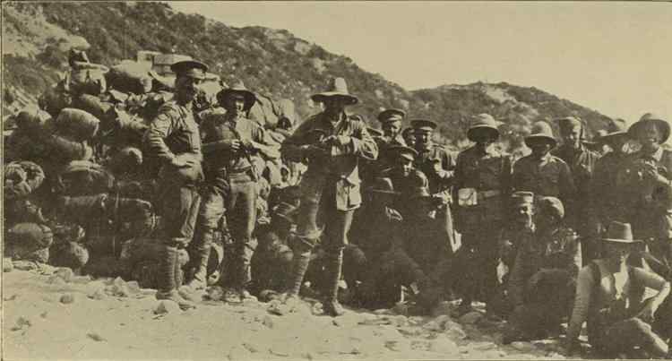 The Turks knew enough of them by now to have a wholesome respect for their fighting qualities, and seemed contented to shell them occasionally from a distance or let them alone, so long as they did not come out and make trouble. And the fact that this was the hottest period of the year may have helped to reconcile the Anzacs to the necessity of going slow for a while. The blazing heat, indeed, was more intolerable than the fire of the Turks, and to cope with it they discarded one garment after another until, at length, they were to be seen on duty or amusing themselves, when they were not lying cool in holes and shelters, dressed in nothing but a pair of breeches cut down to "shorts" which did not nearly reach to their knees. Some, with a lingering sense of propriety, or tender feet, retained their boots and socks, but others abandoned even these. Mr. Ashmead Bartlett, who saw them, says, "I suppose that since the dervishes made their last charge at Omdurman no such naked army has ever been seen in the field." {82}