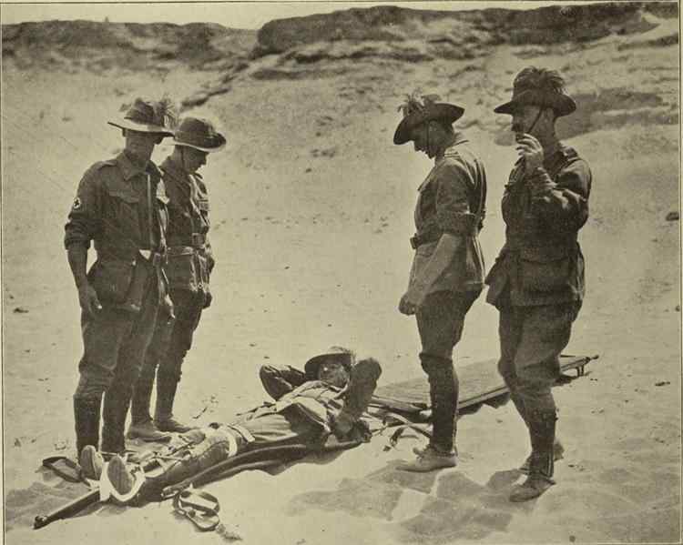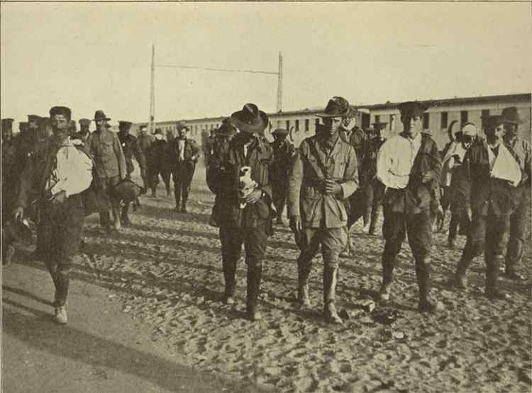 HEROES FROM THE DARDANELLES. Wounded from the Dardanelles, leaving the hospital train in Egypt.